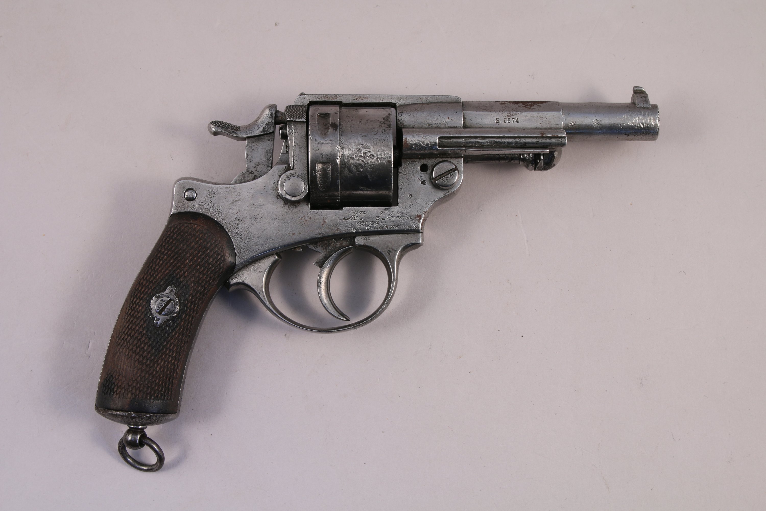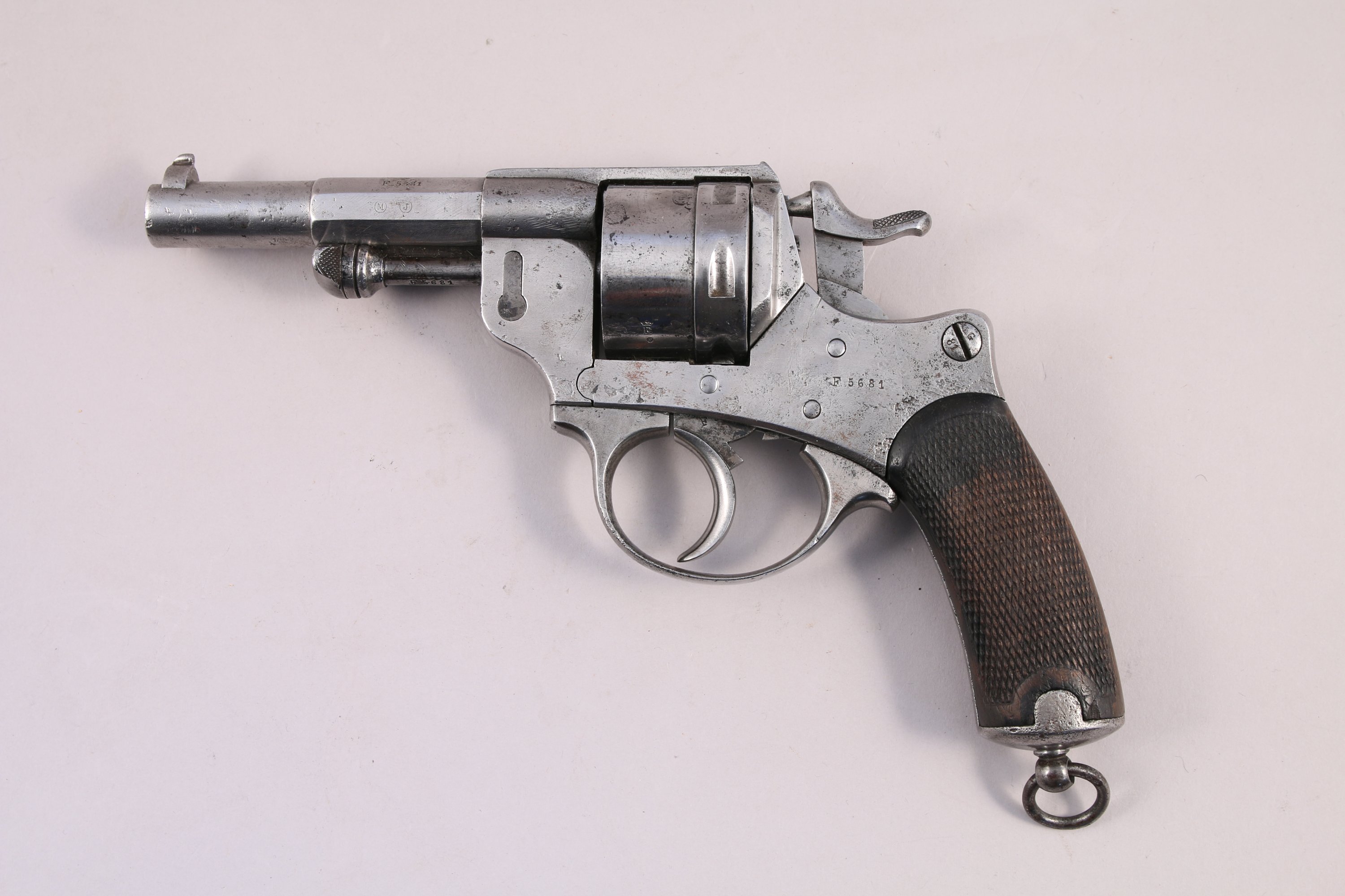 REVOLVER modèle 1873, calibre 11mm. Plaquettes de crosse en noyer quadrillé. Marquages: "Mre d'Armes St-Etienne, F.5681, S. 1874" (toutes les pièces au même numéro).