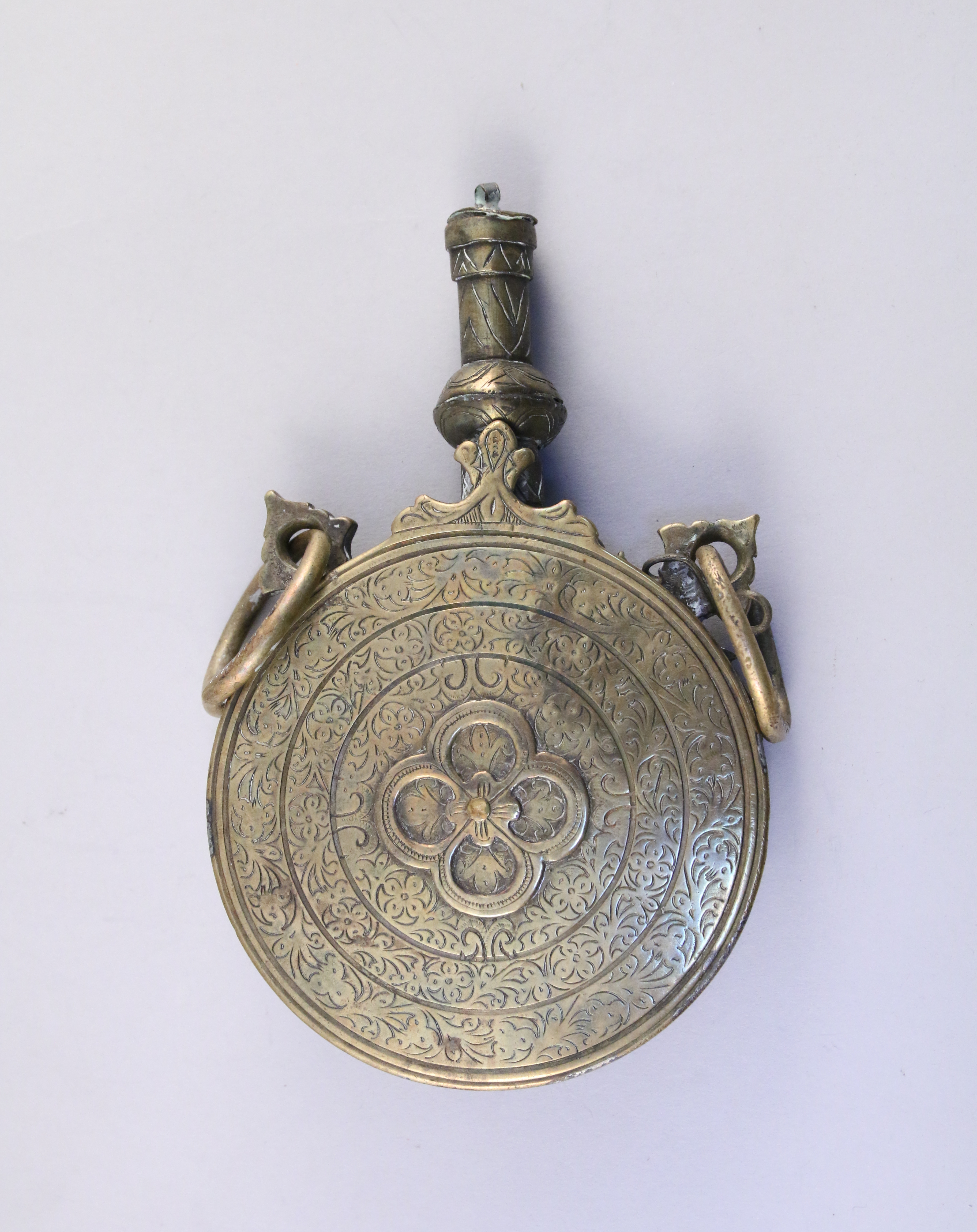 JOINT: POIRE POUDRE en laiton et métal argenté, de forme circulaire à décor ciselé de rinceaux.Travail Ottoman de la fin du XIXe. Haut. 16,5, Diam. 9,5 cm (accidents).