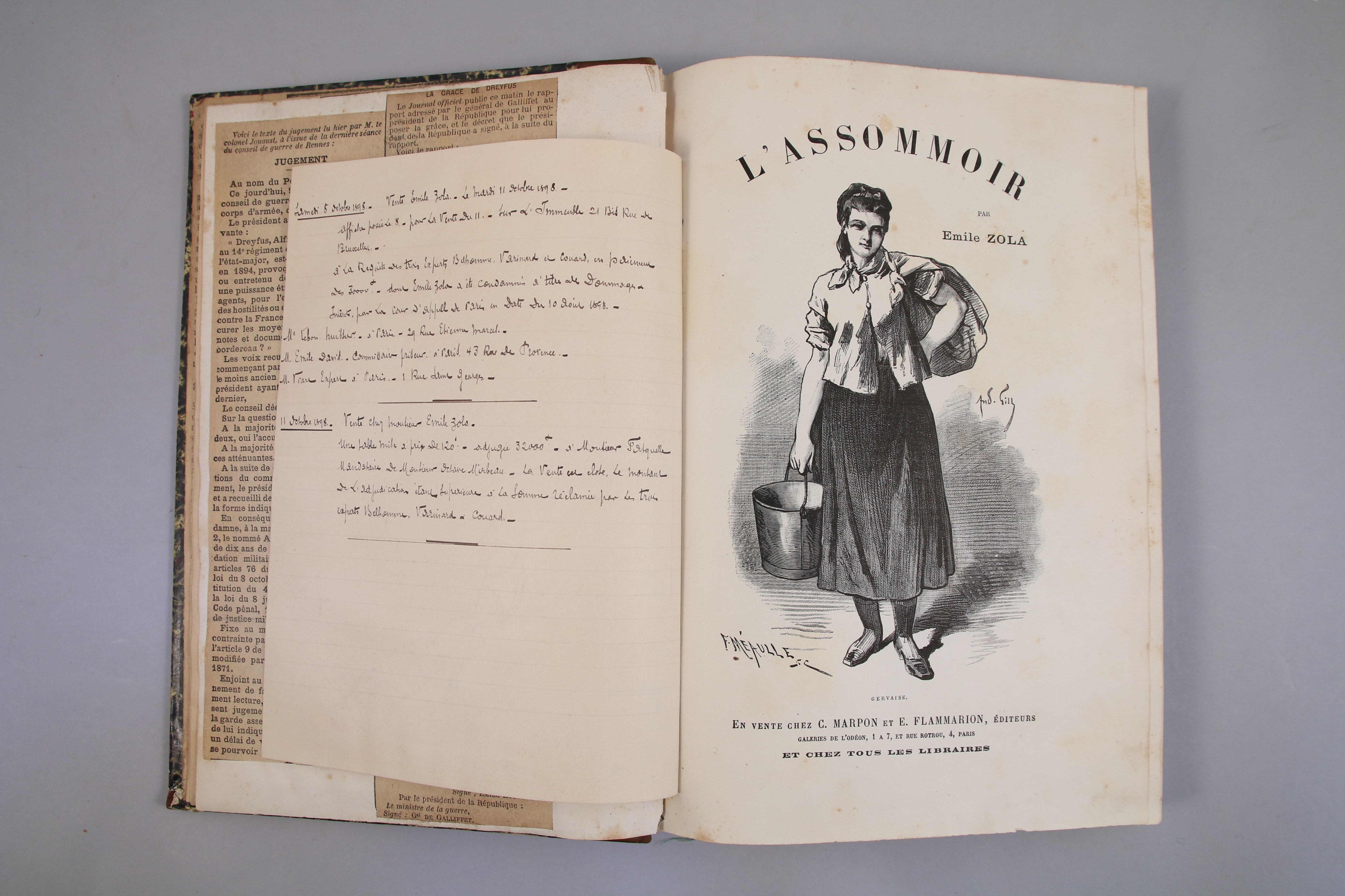 Page de journal pliée et collée sur une des pages de garde de "L’assommoir". Le bandeau supérieur (donnant le prix, le numéro et la date) découpé, comme le bandeau inférieur (laissé nu).