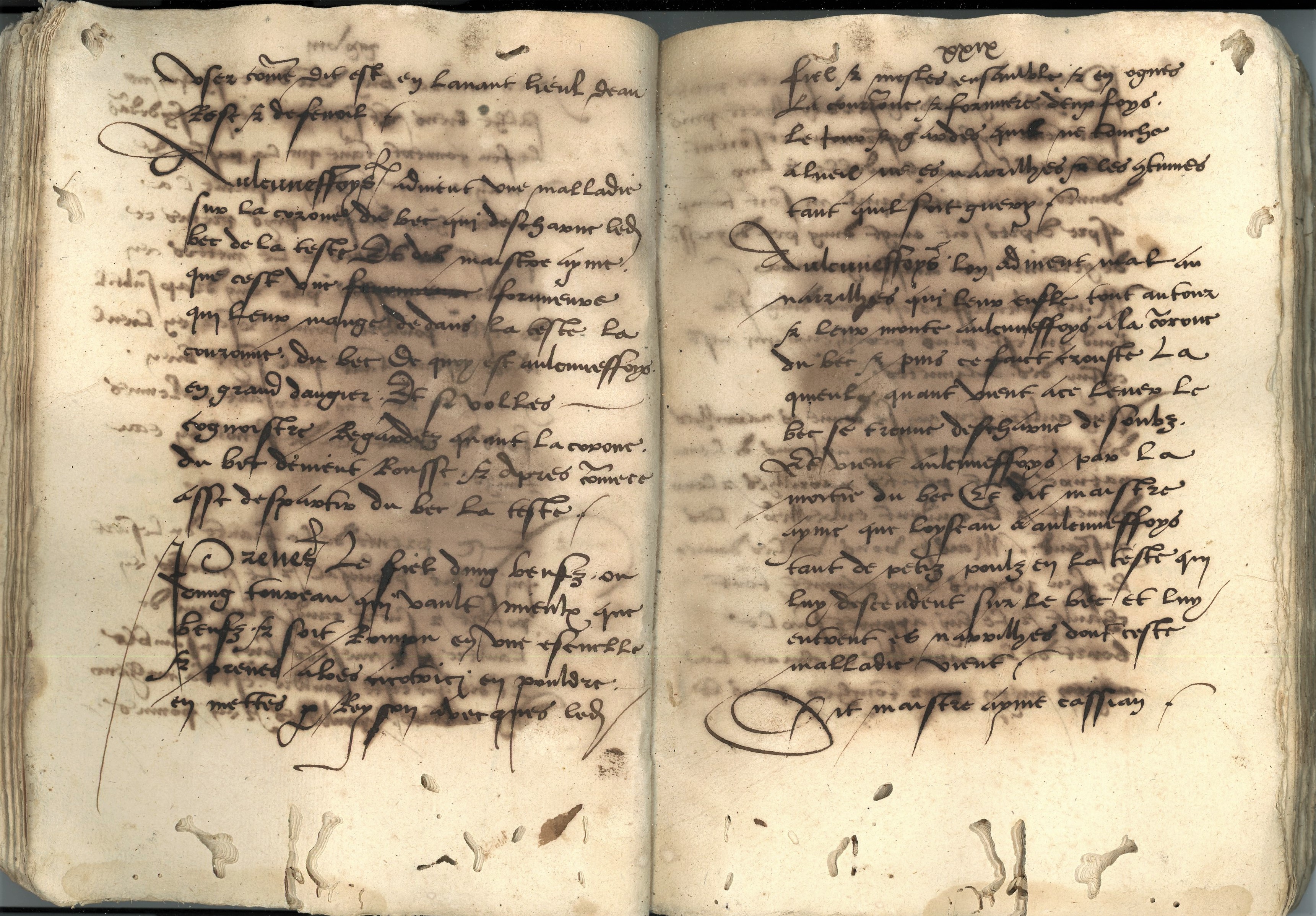 Rarissime manuscrit en français, 2nde moitié du XVIe siècle, encre brune, écrit d'une seule main, 105 ff., cahiers reliés et couverture de papier épais " végétal " ; 21 x 14 cm. En l'état, avec de nombreux trous de vers du livre, mais qui affectent peu le texte.