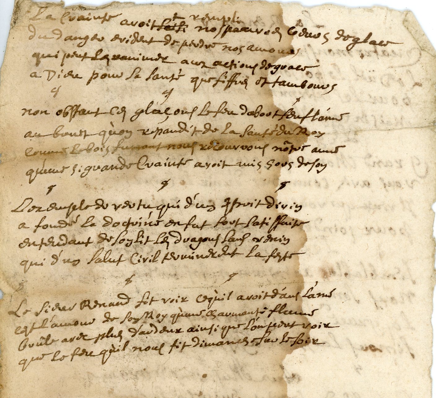 Paroles manuscrites à l'encre brune de deux chants sur un morceau de papier, 31 x 11 cm (accdts), écrites dans la seconde moitié du XVIIe siècle ;