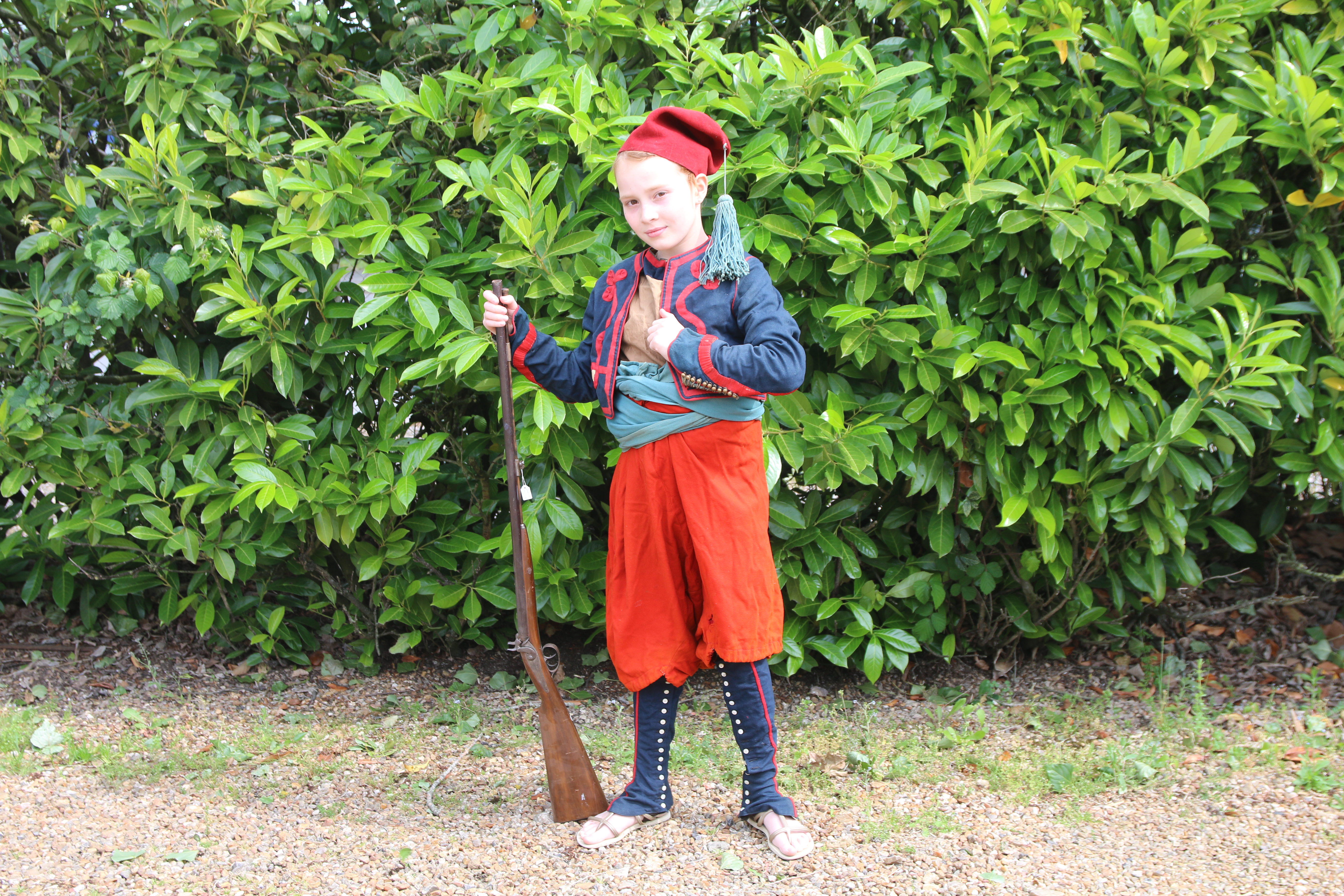 UNIFORME de ZOUAVE vraissemblablement pour enfant de troupe composé de neuf pièces dont une veste-boléro dite " bédaïa " bleue et rouge, un gilet algérien au col bleu et rouge, un pantalon sarouel en drap écarlate, une paire de guêtres bleues à liserés rouges et boutons nacrés, une paire de gants bruns, une chéchia en feutre rouge et son gland et une ceinture de laine.