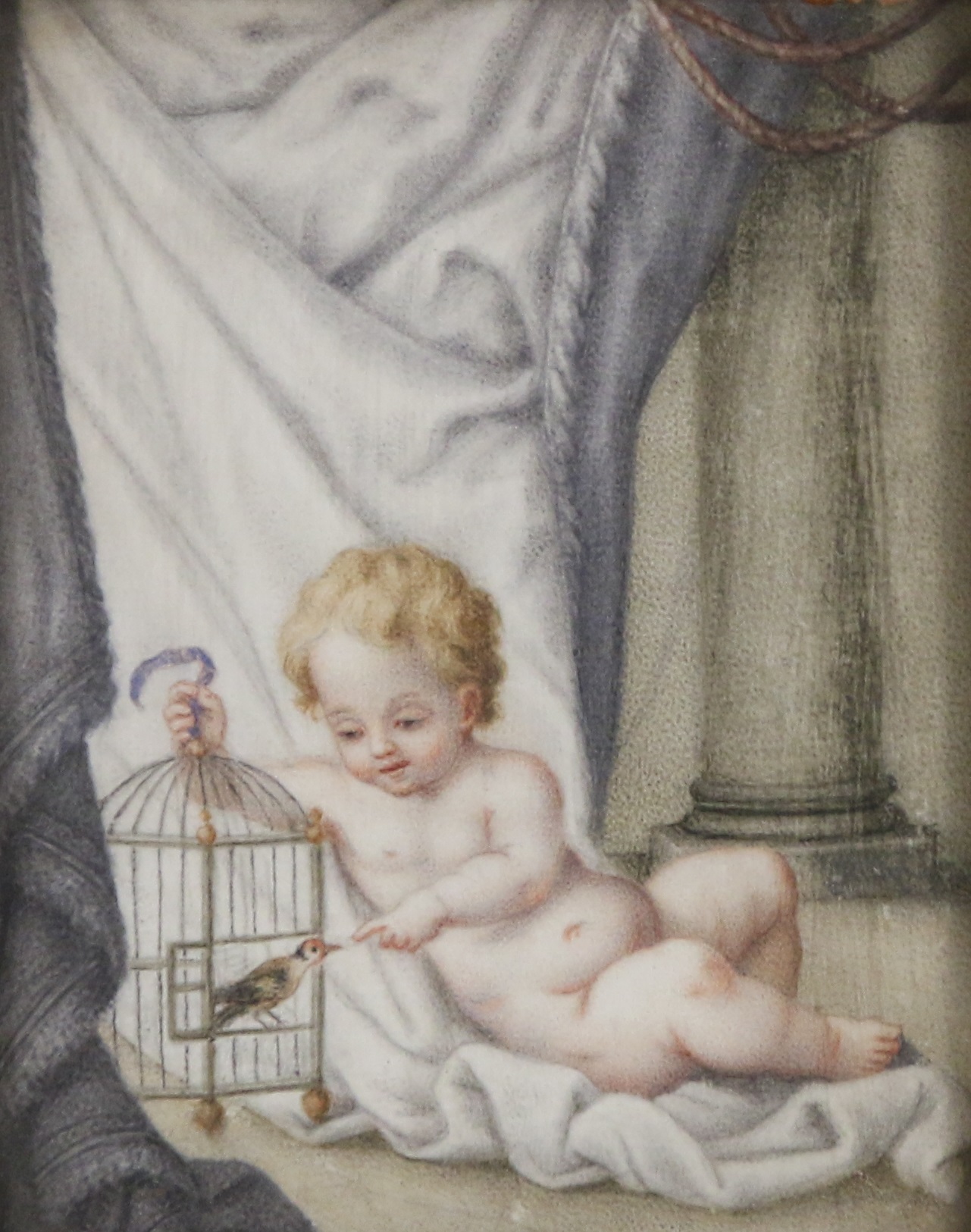 École FRANÇAISE vers 1700Enfant jouant avec un oiseauGouache sur vélinHaut....