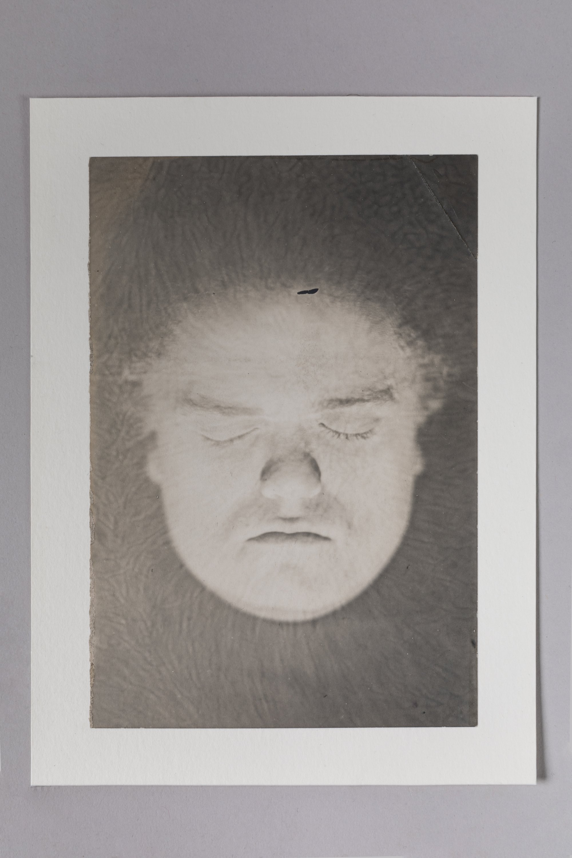 Portrait assis, bras levés, à lombre géante et portrait au visage yeux fermés ou sa clarté semble émerger dun mouvement obscur.