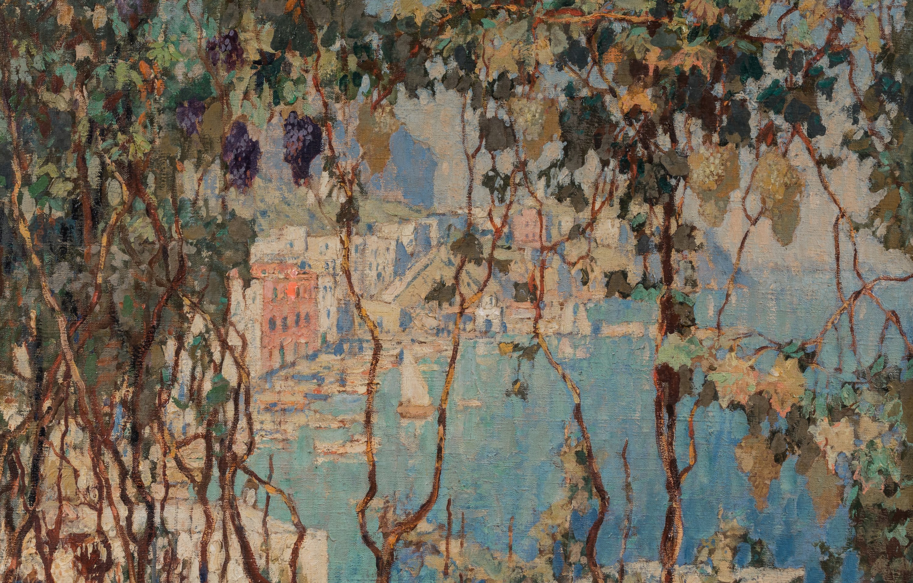 Notre paysage italien à travers les treilles de vigne est emblématique de sa période la plus prisée. Vue idyllique à la mode postimpressionniste russe, sa peinture s'émancipe auprès du réalisme social de ses amis, bolchévisme qui conduira quelques années plus tard Gorbatov à la ruine.