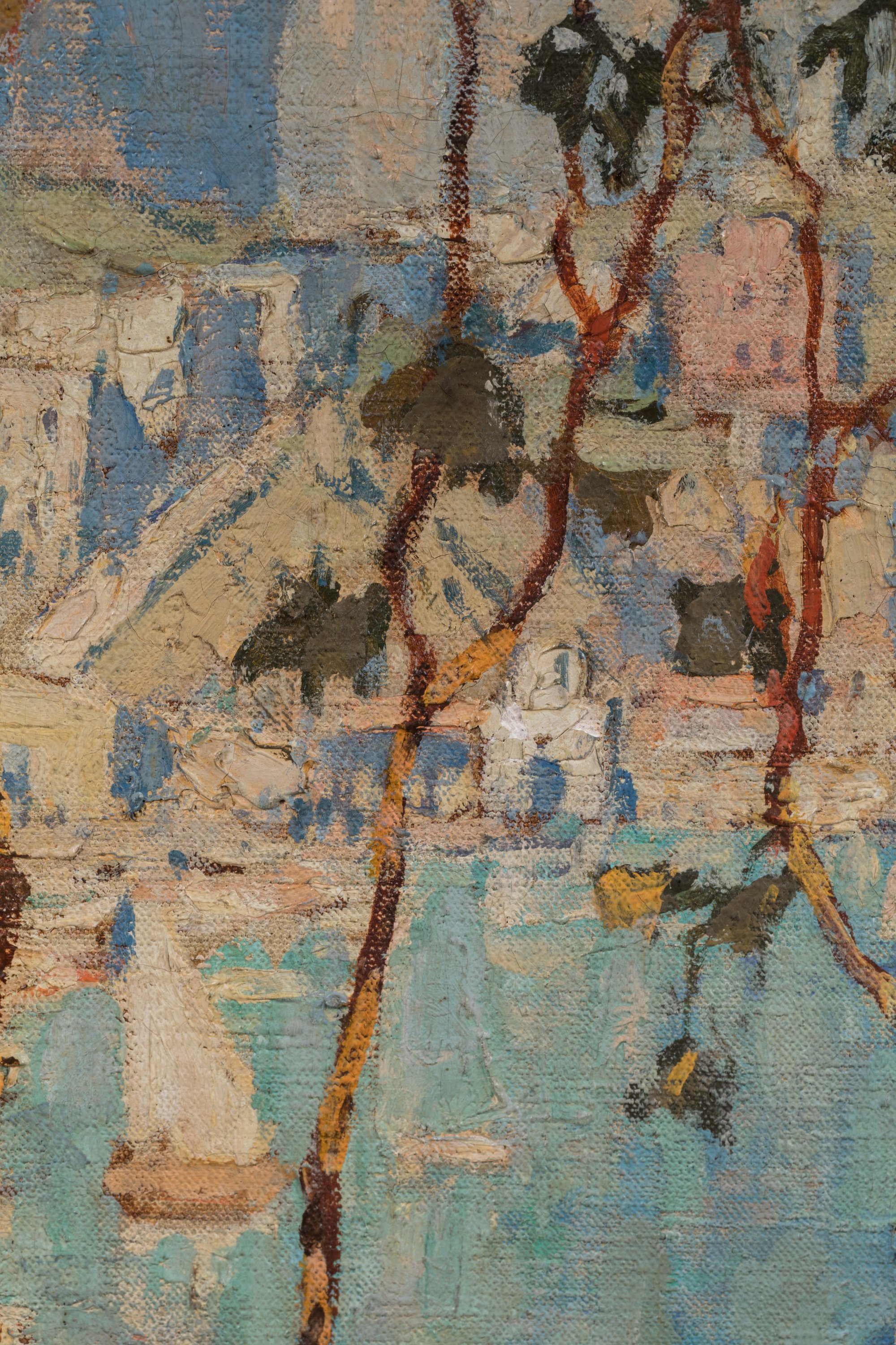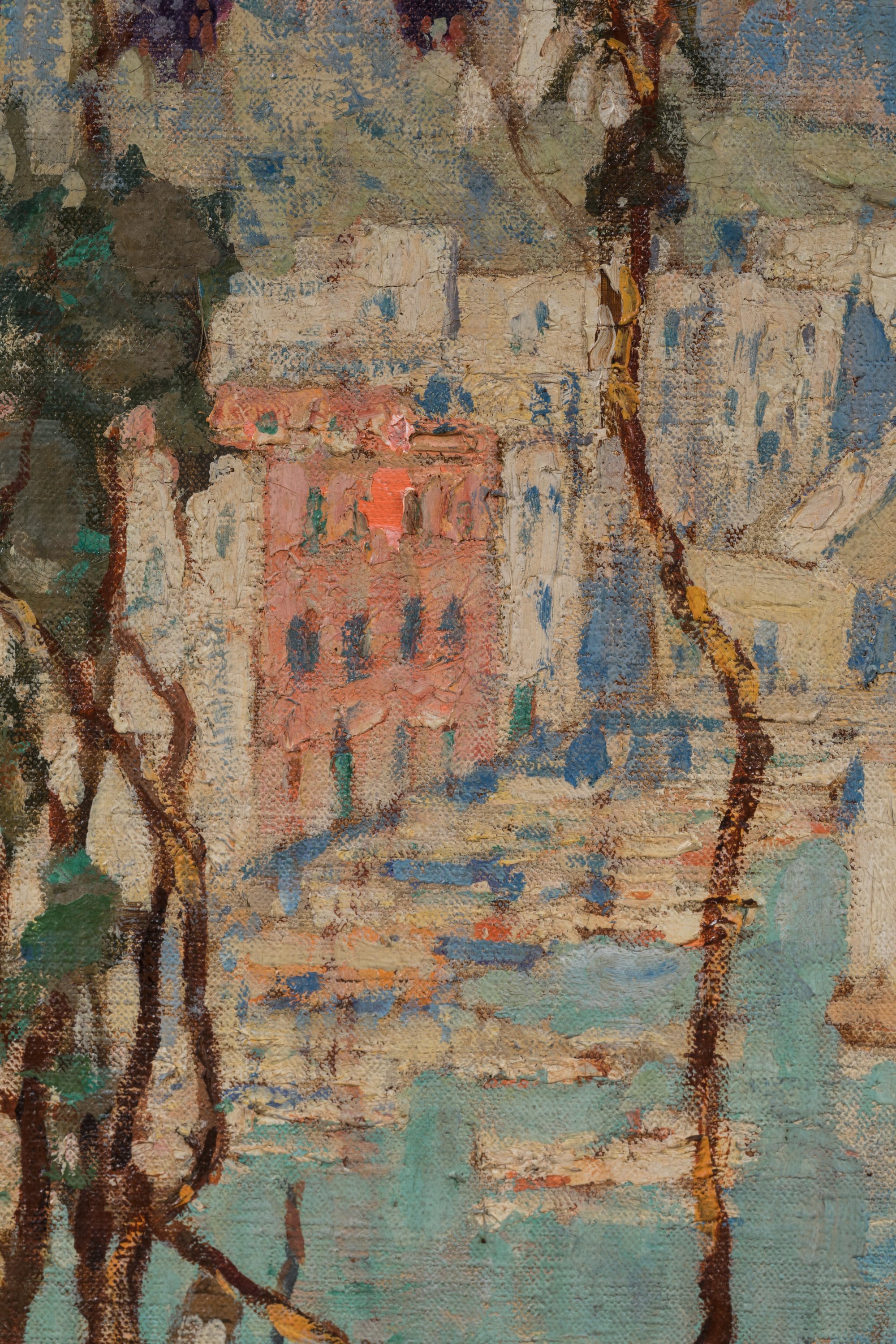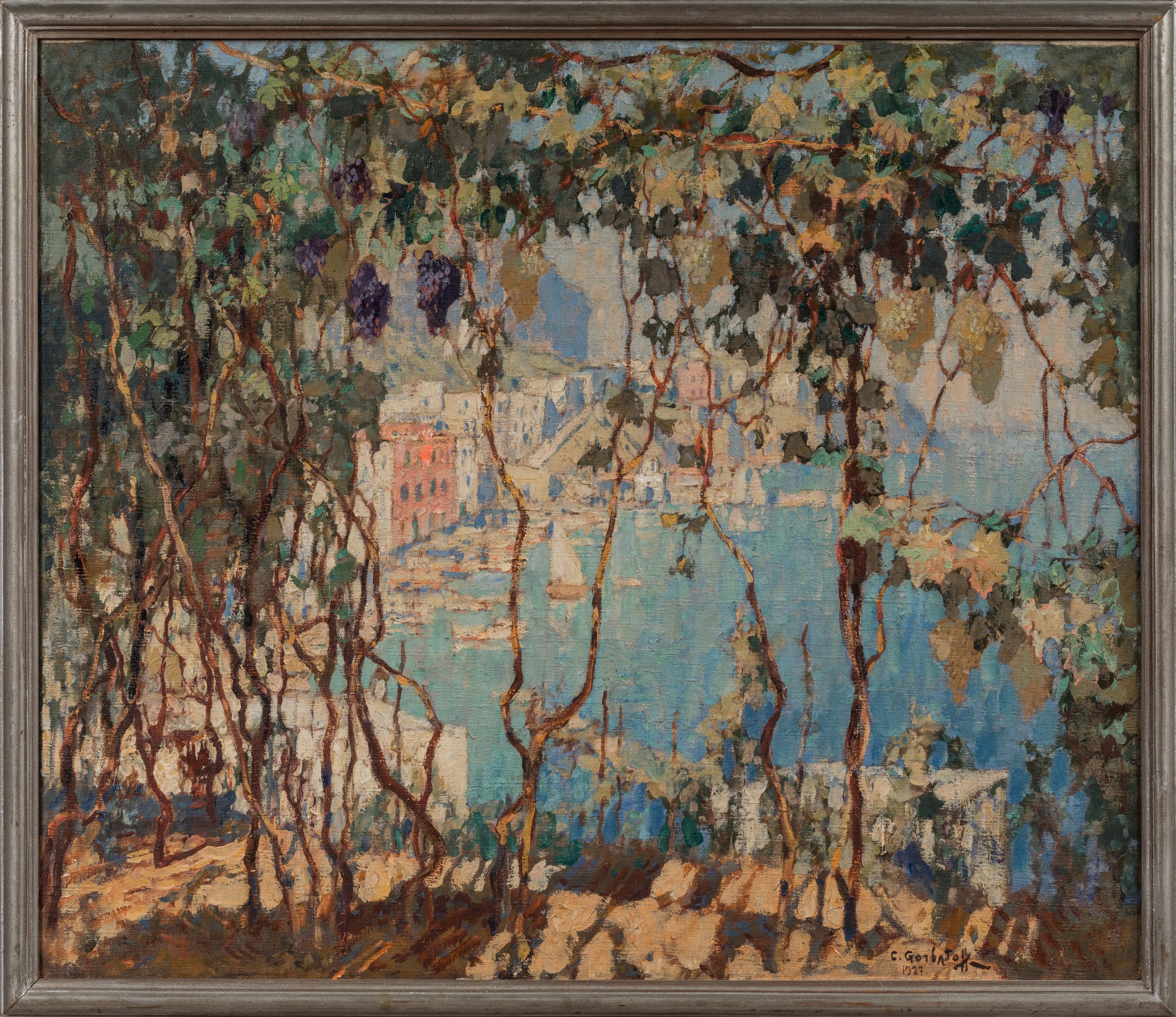 Ses succès lui permettent de s'installer à Rome comme pensionnaire de l'académie. Il y rencontre l'écrivain Gorki, fondateur du réalisme socialiste et penseur du bolchévisme. Ce dernier l'invite à Capri, où ils forment avec Brodsky un cercle d'intellectuels. Gorbatov y livre parmi ses œuvres les plus appréciées, multipliant les points de vue. On distingue notamment la villa rouge de la marina de Capri sur plusieurs tableaux en légère plongée. Notre toile peut être rapprochée d'une toile vendue chez Sotheby's (26/11/2013 Londres, n°429) à la différence que la nôtre présente un plan plus resserré sur la marina. Par ailleurs l'intérêt porté aux treilles de vigne, typique des patios capriotes, se retrouve dans d'autres toiles (Sotheby's, 05/11/2008, NY, n°258 ; Sotheby's, 10/06/2009, Londres, n°373).