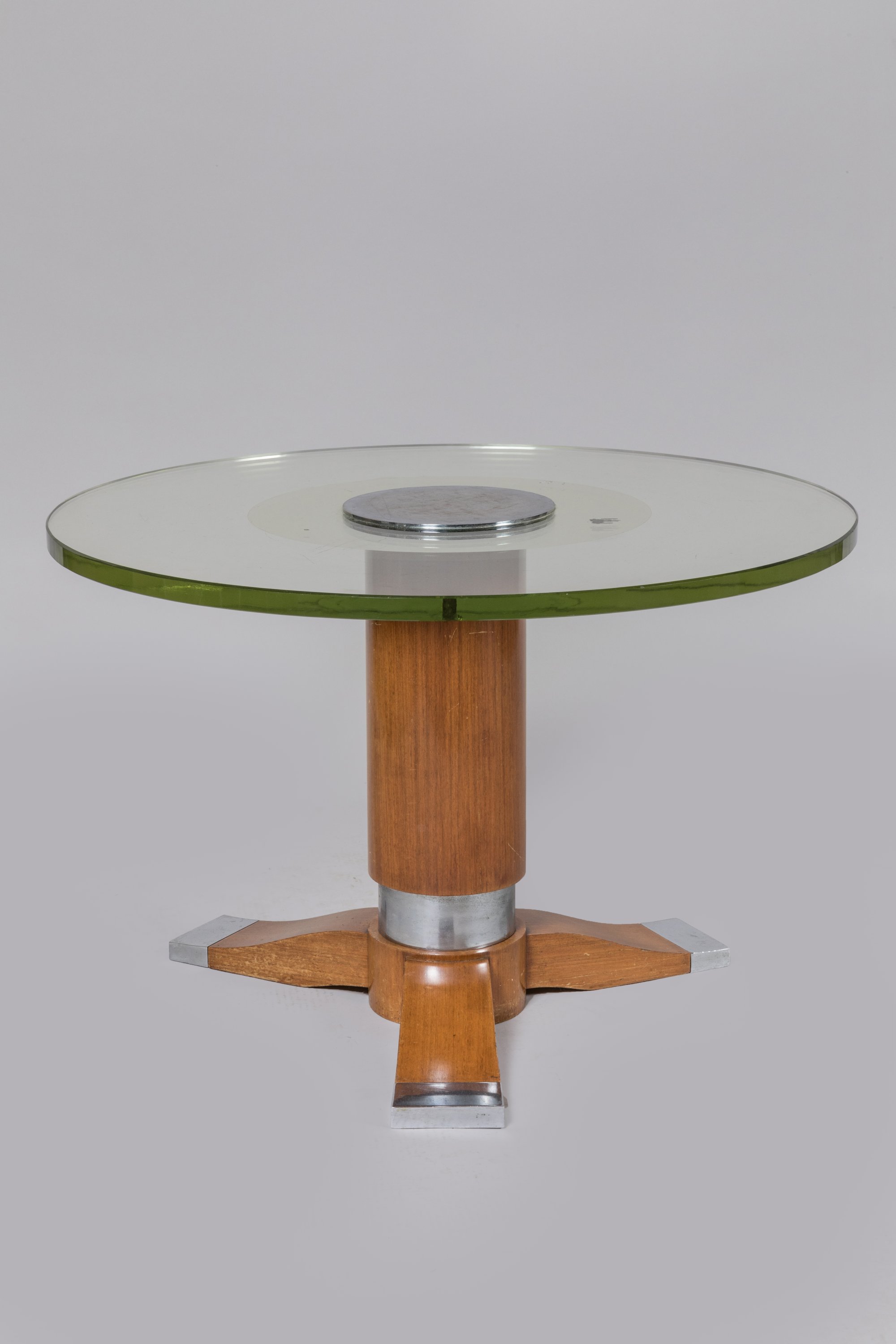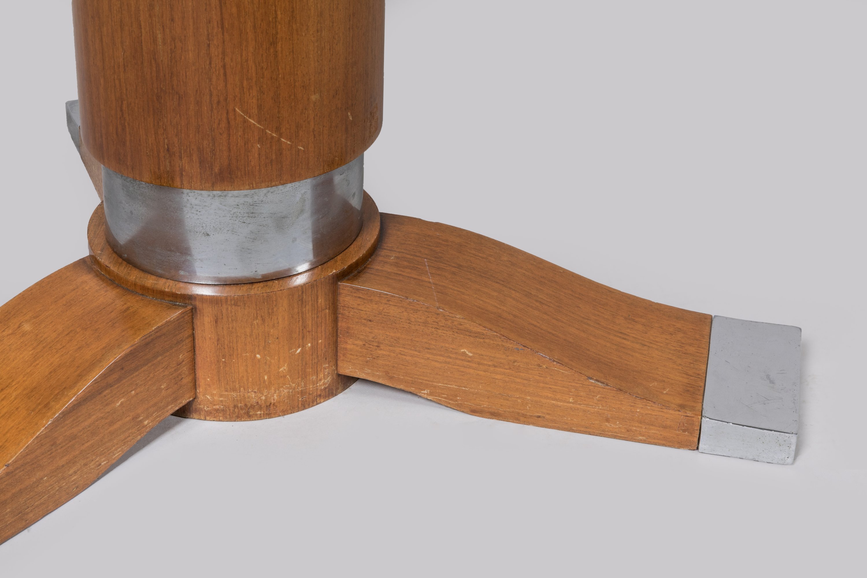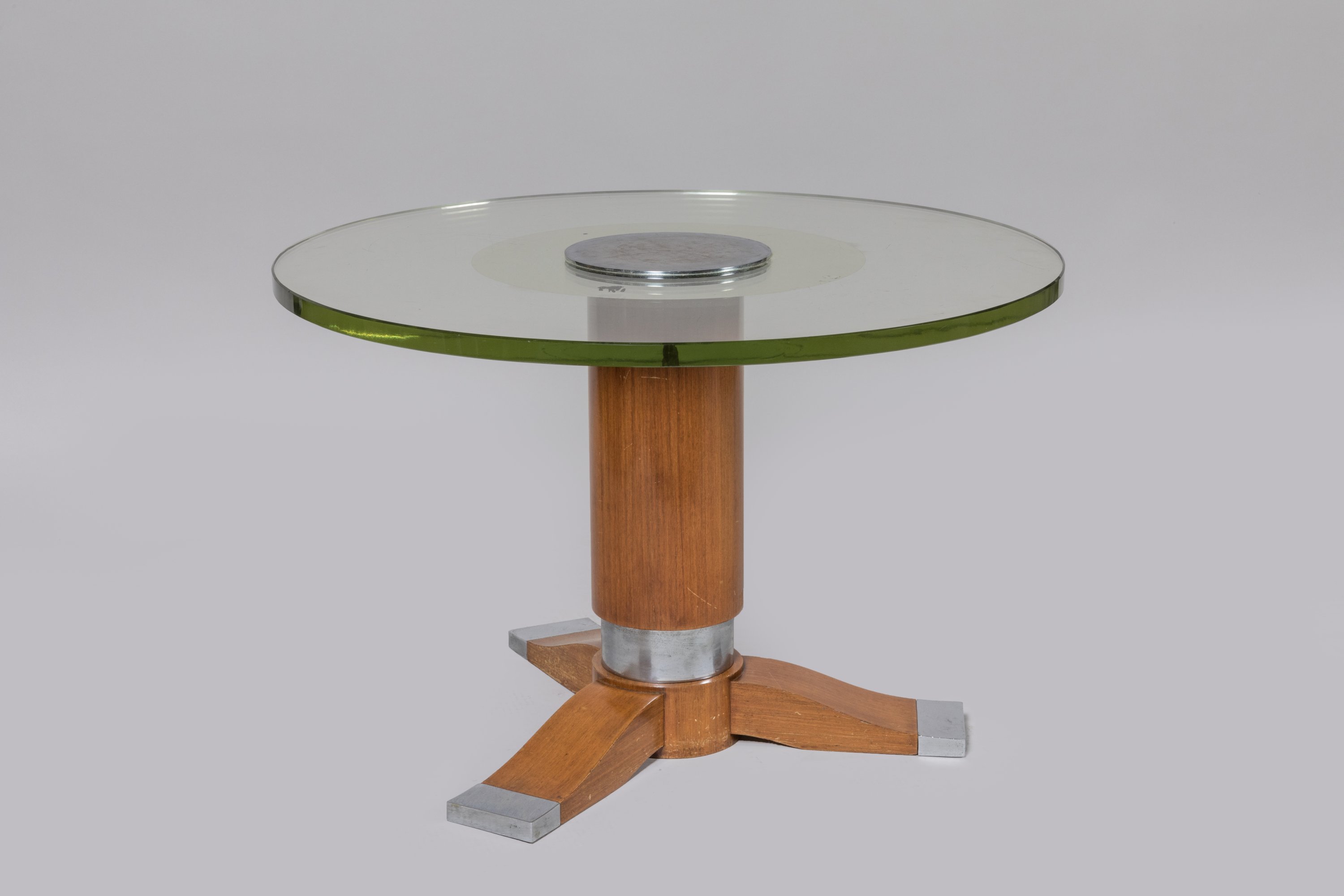 en placage de bois exotique, à épais plateau tournant de verre, fût terminé par un piétement tripode. Sabots et cerclage de laiton argenté.