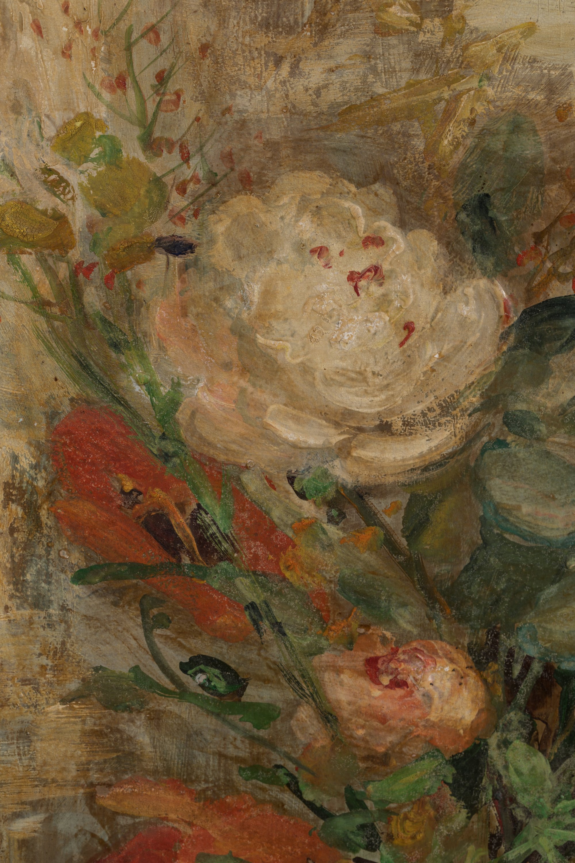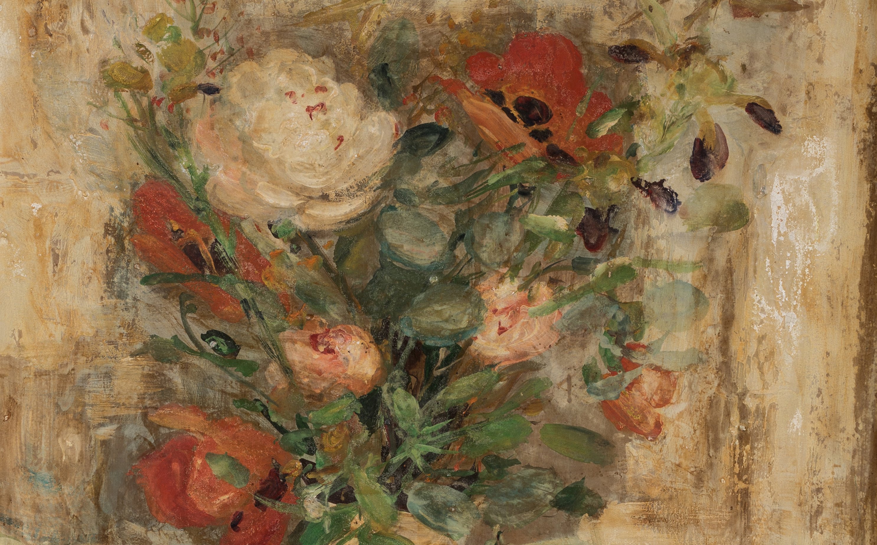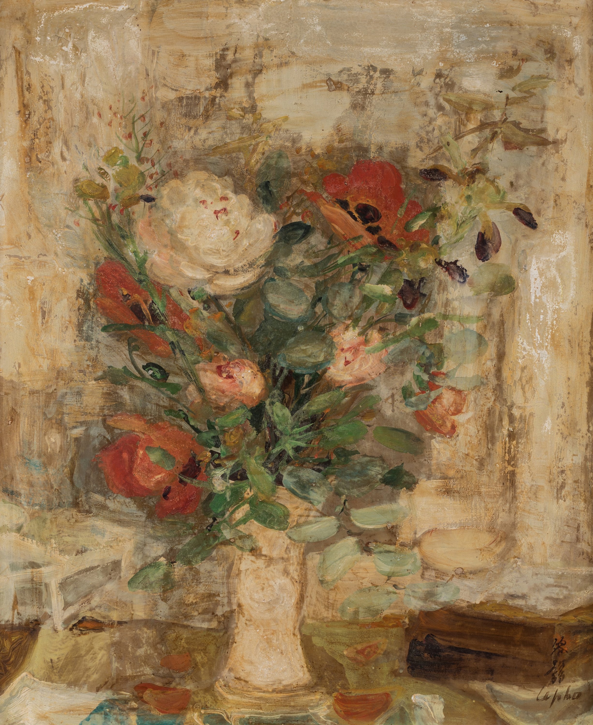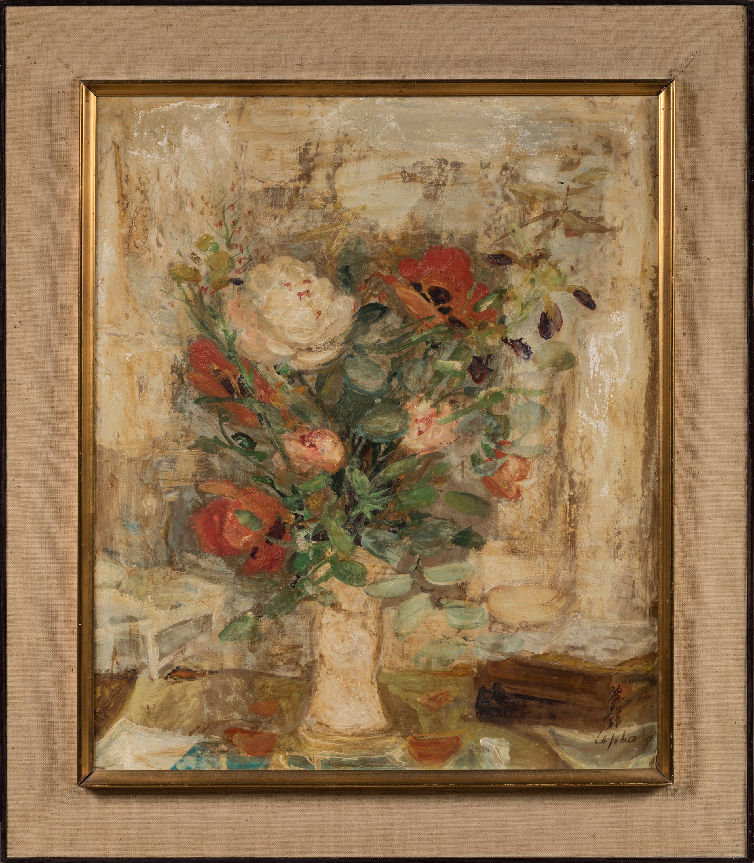 Nourri de l'influence de Matisse par l'intermédiaire de Victor Tardieu, Lê Pho livre des bouquets de fleurs aux compositions étudiées. Nos deux uvres nous frappent par leur support, deux toiles de soie contrecollées sur isorel, la fibre accrochant la peinture d'une façon singulière. Avec leur double signature, cachet en idéogramme et lettres latines, Lê Pho s'installe entre les deux mondes.