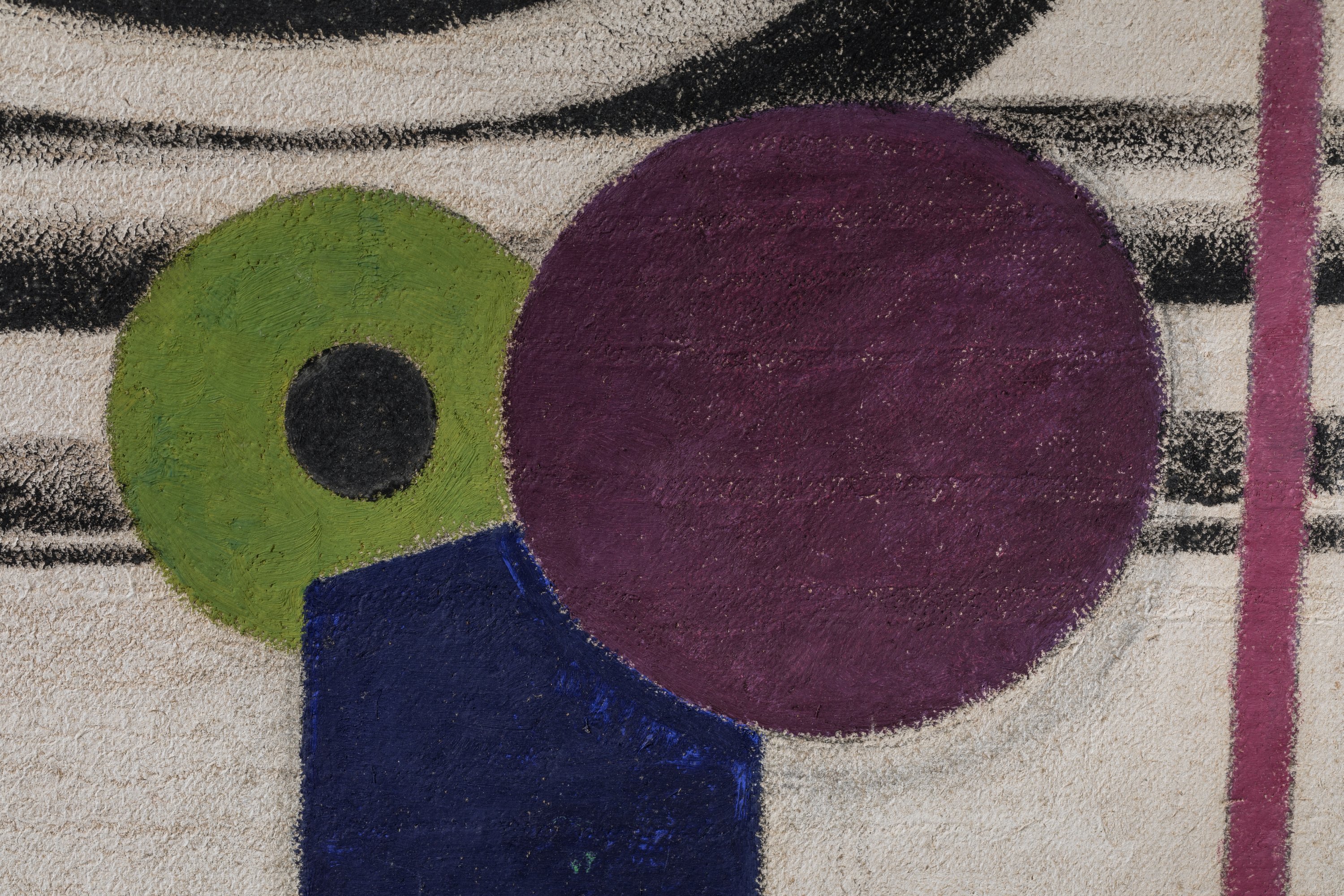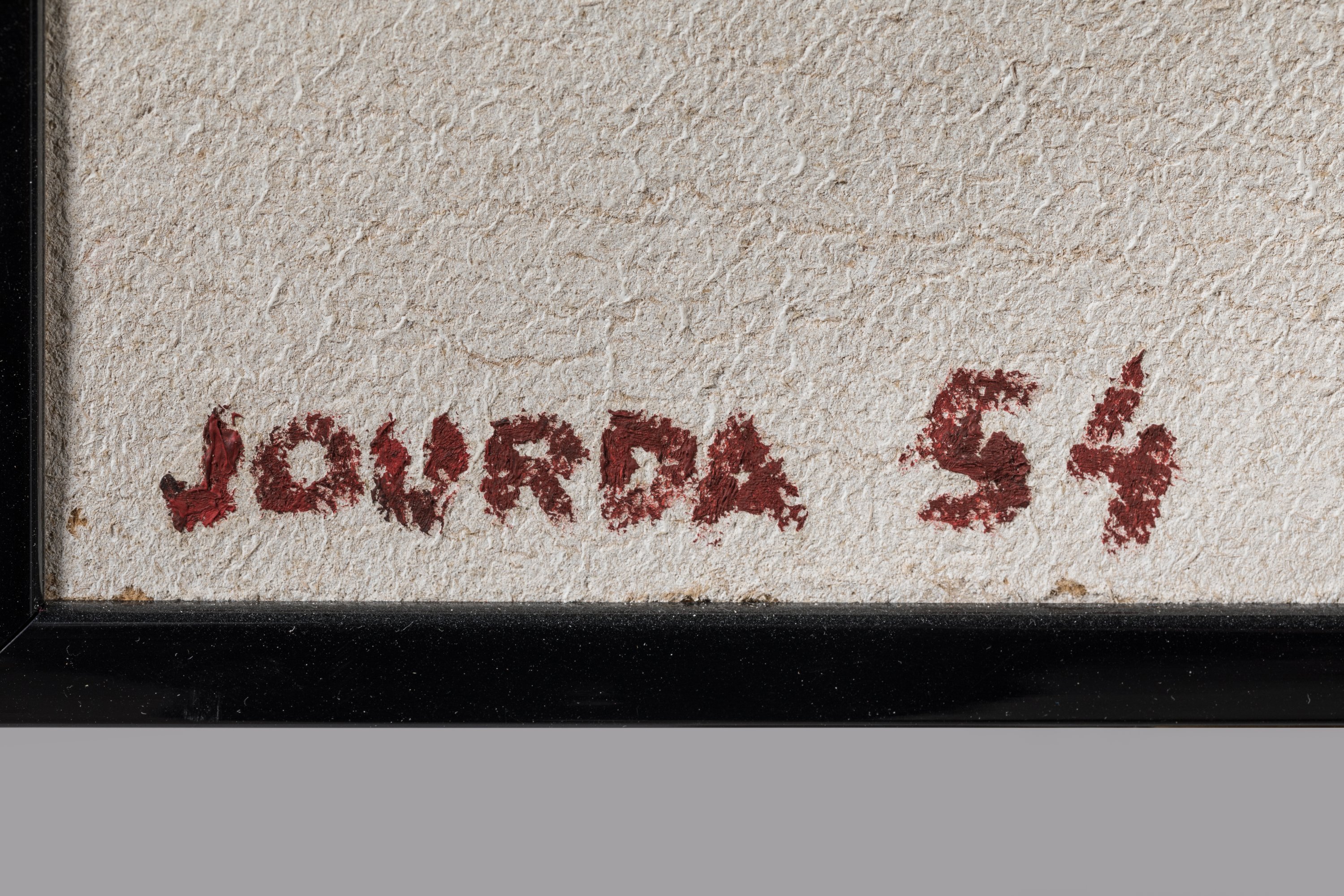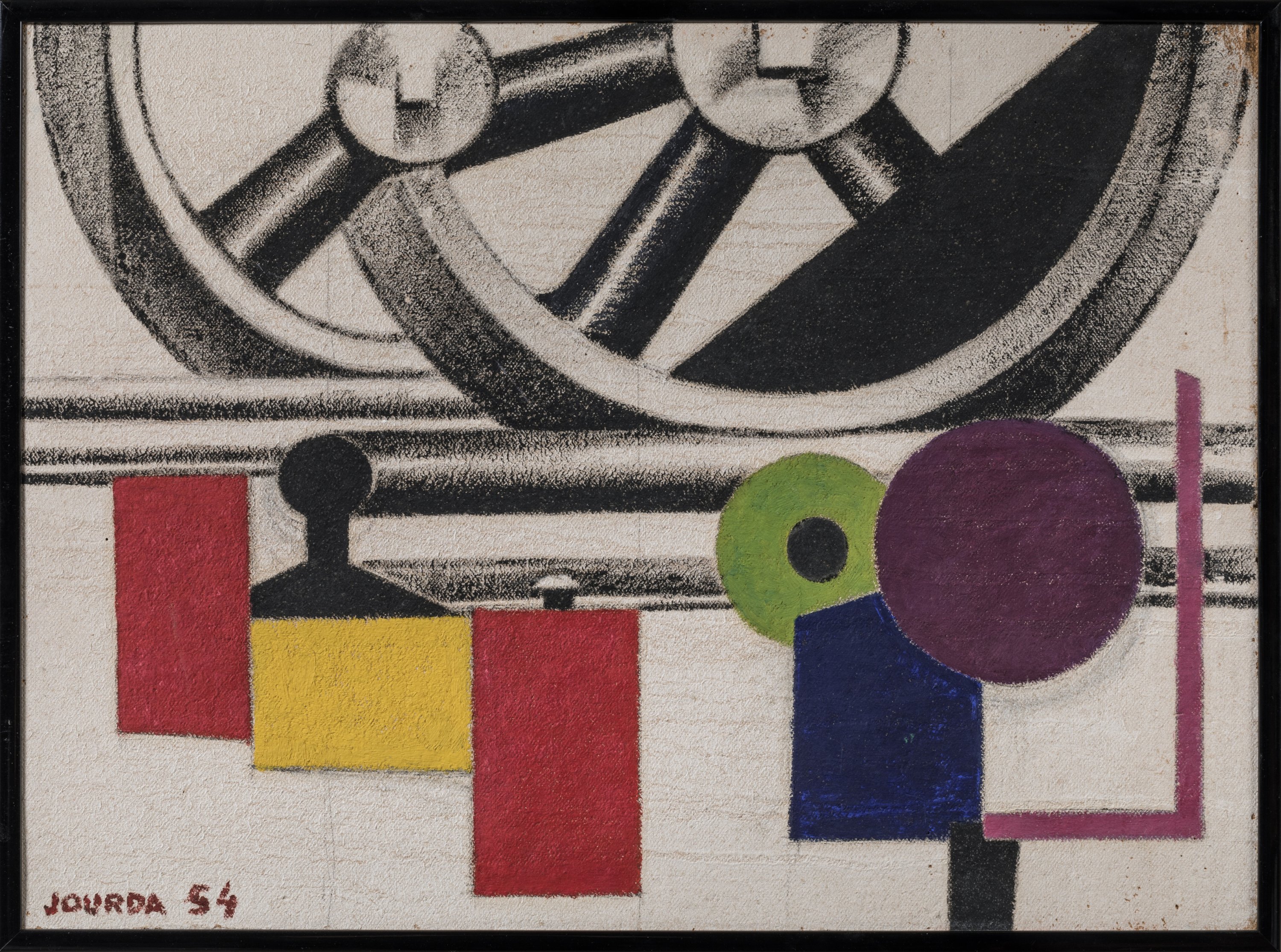 Pierre JOURDA (Français, 1931-2007)Roues, rails, signaux,1954Peinture sur carton, signée et...