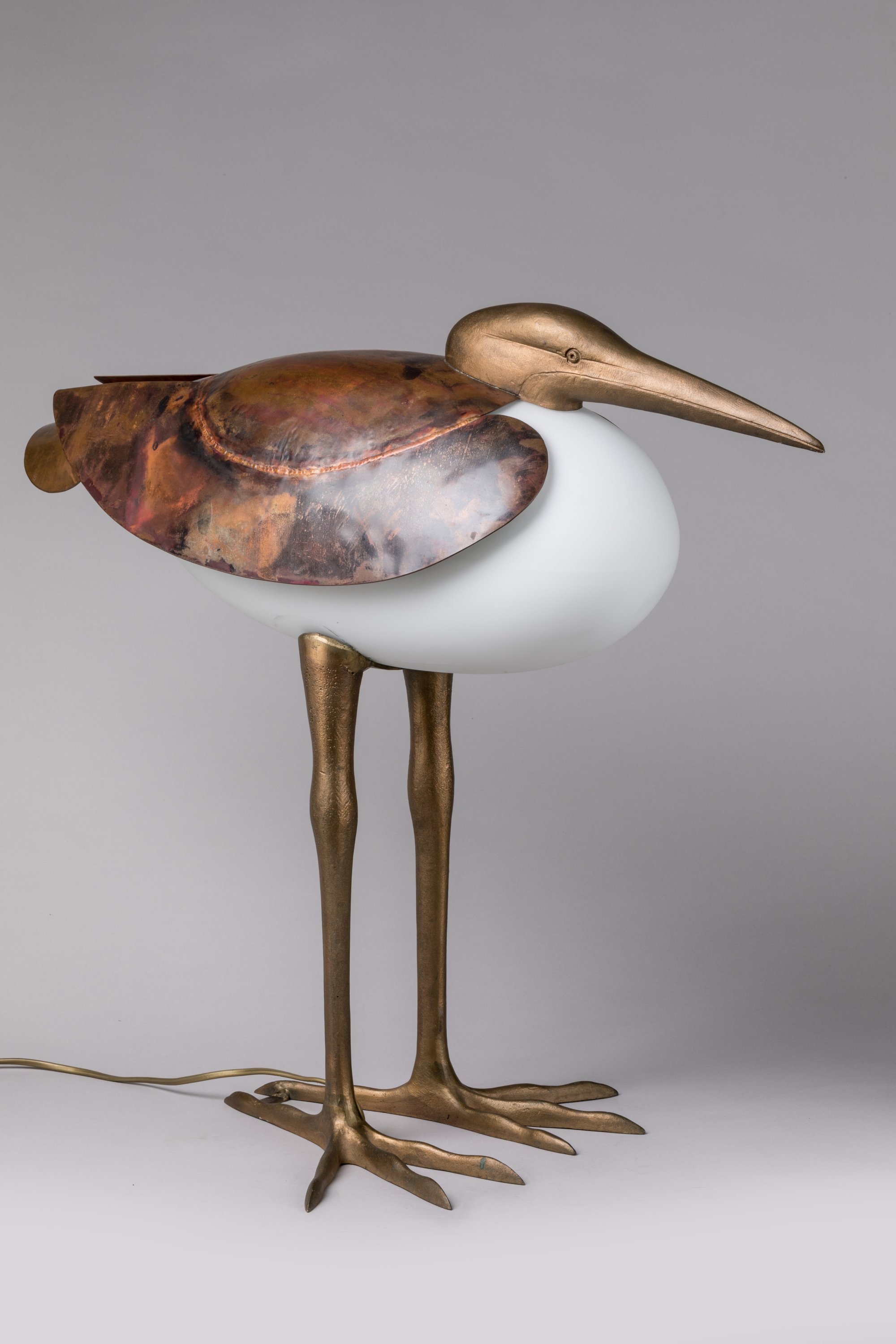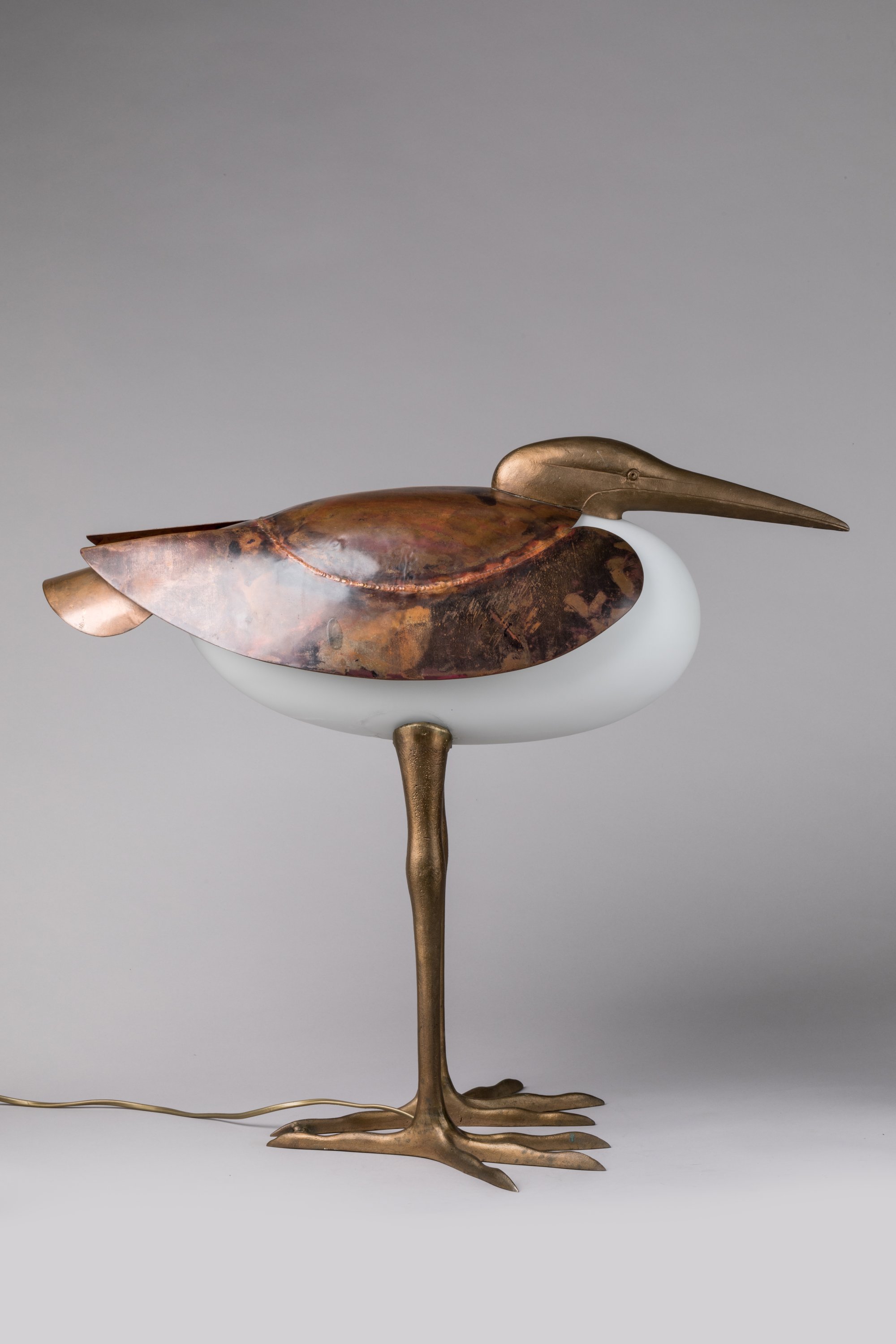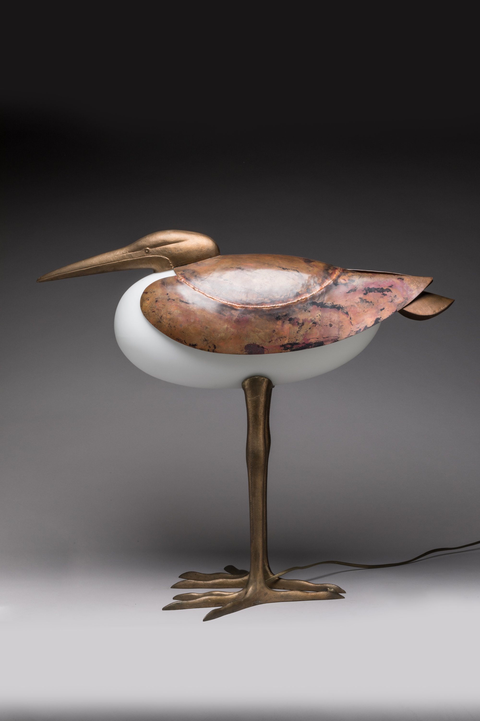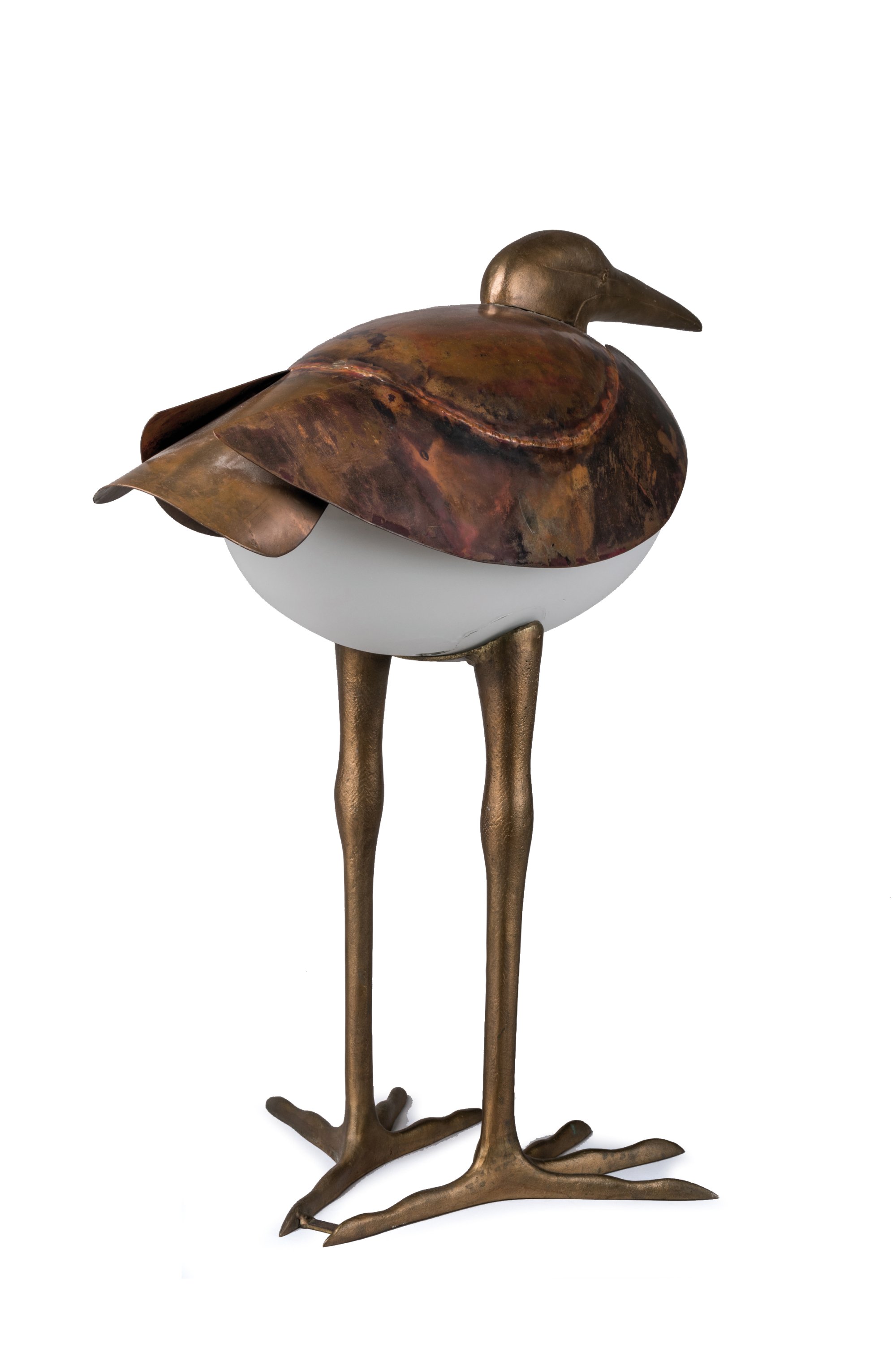Dans leur atelier dUry près de Fontainebleau, le couple na cessé de produire tout au long de sa vie des sculptures/objets devenus mythiques. Cest le cas de cette "lampe échassier", dont la célébrité sest accrue lors de la vente Bergé / Saint-Laurent en 2009 puis grâce à la rétrospective Lalanne du Musée des Arts Décoratifs de Paris en 2010, sans oublier la vente de leur collection chez Sotheby's en 2019. Signe de génie, sa conception apparaît désormais comme une évidence. Elle était pourtant dune grande virtuosité, la gorge même de lanimal est utilisée pour diffuser la lumière. Les ailes faites de métal font alors office dabat-jour, le volatile éclairant en même temps quil produit son ombre.