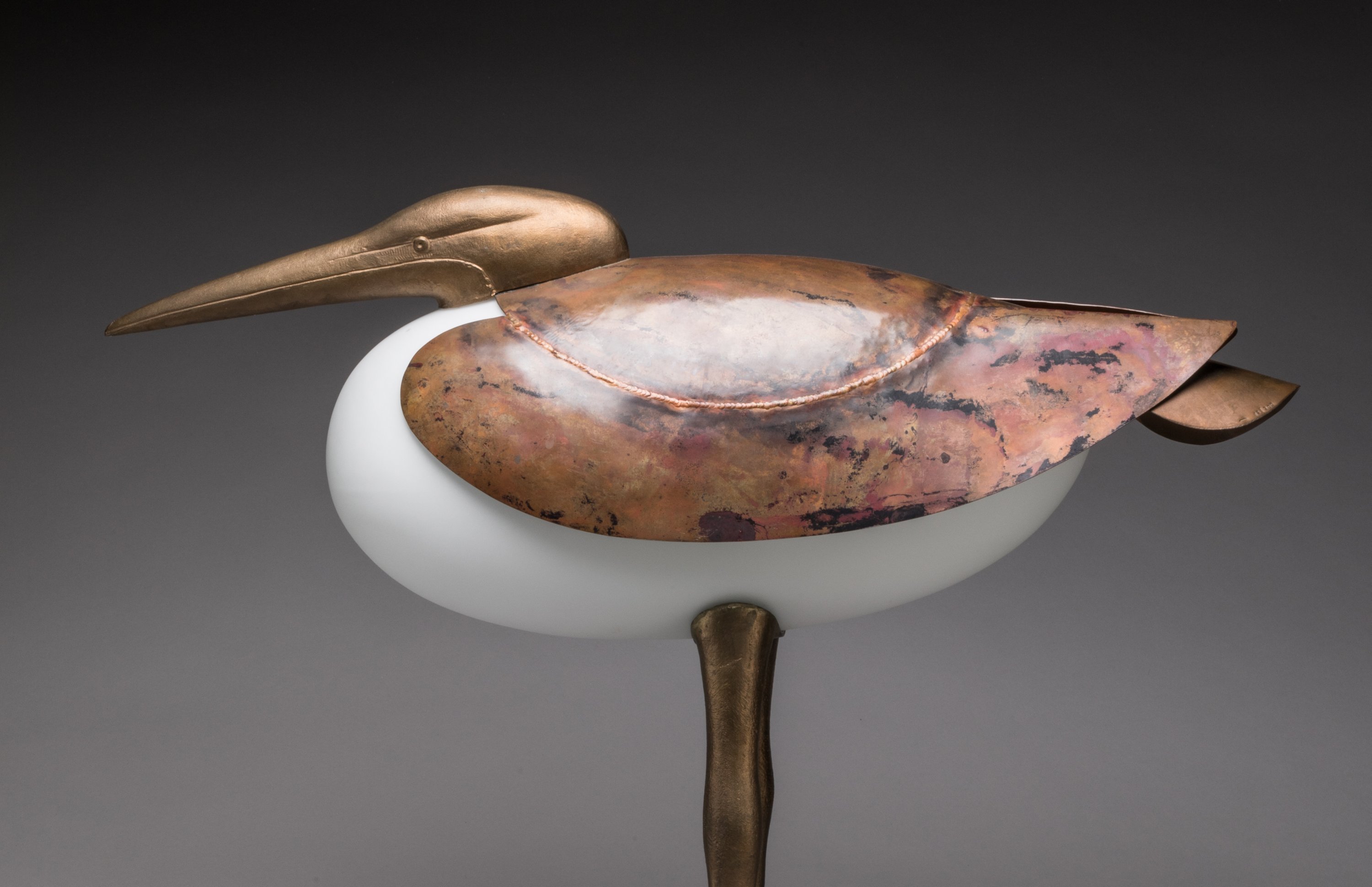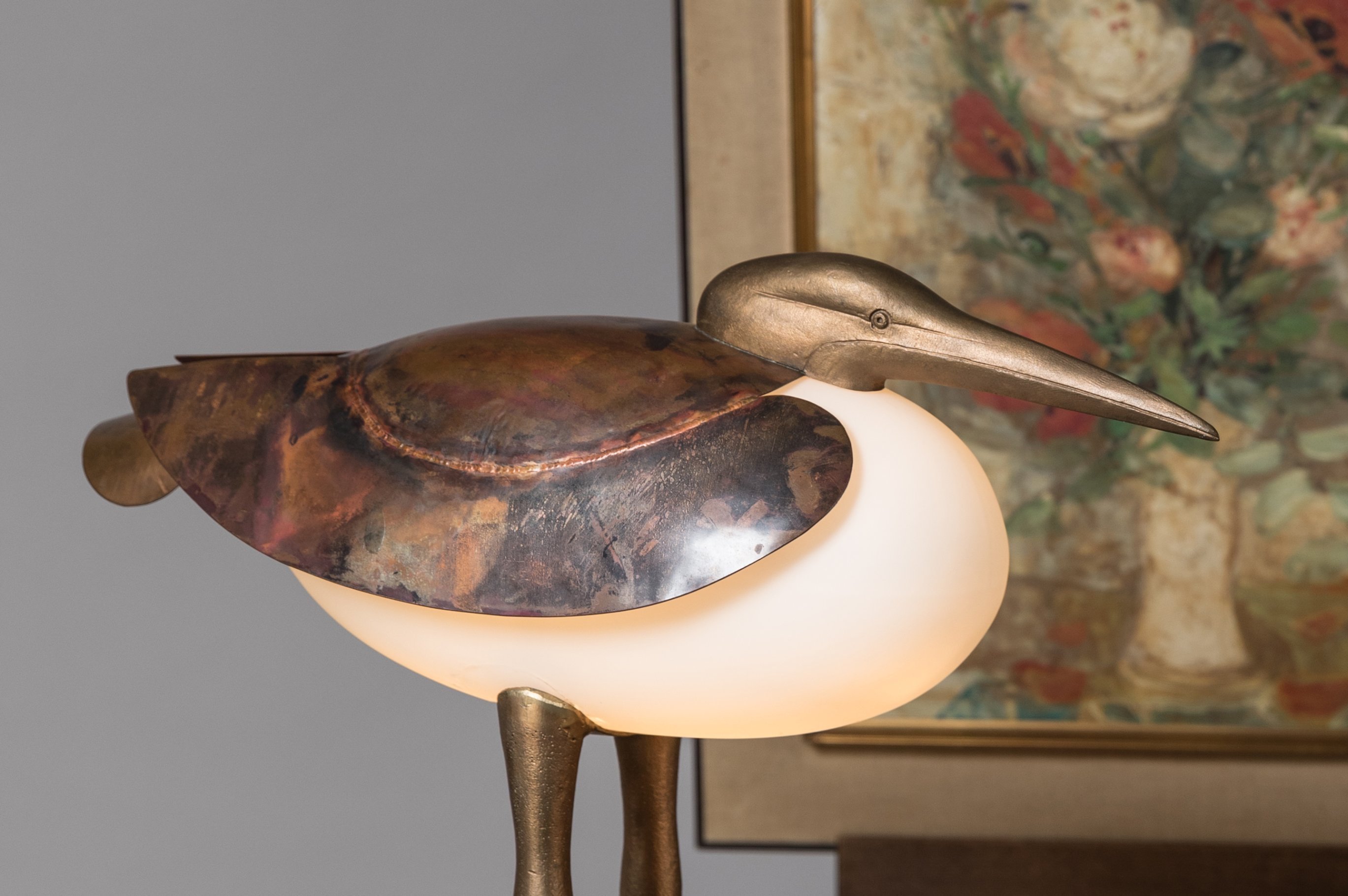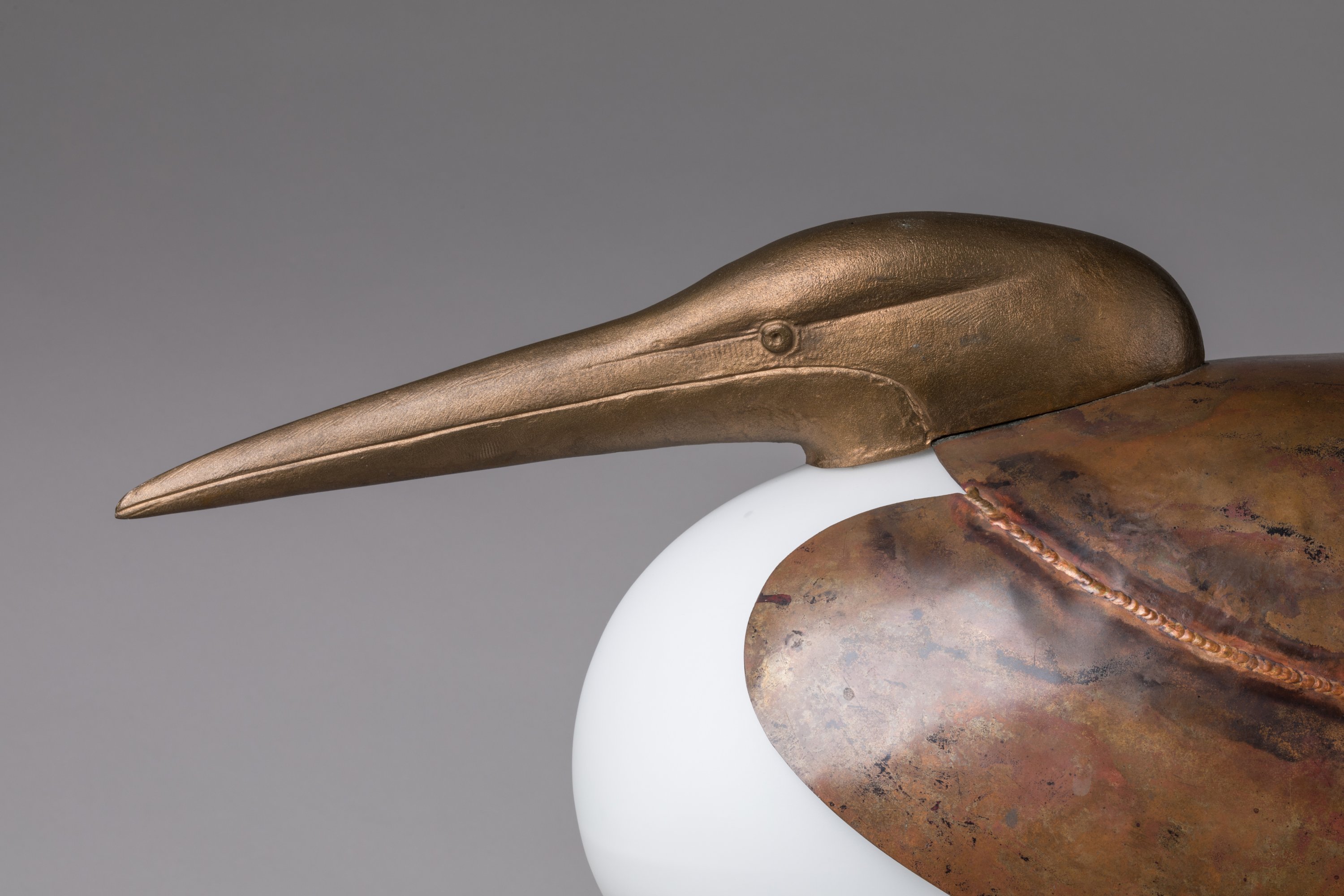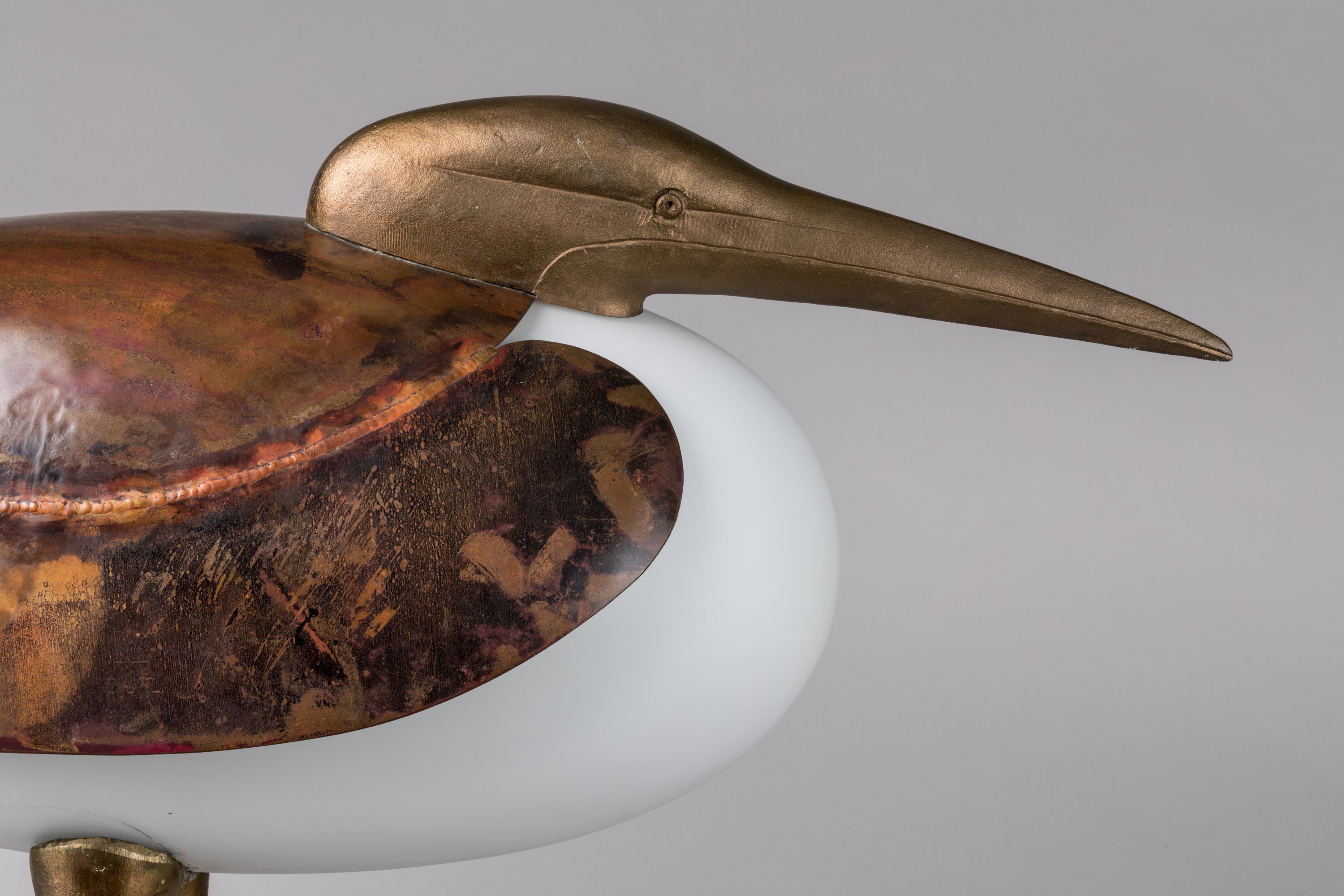 Dans leur atelier dUry près de Fontainebleau, le couple na cessé de produire tout au long de sa vie des sculptures/objets devenus mythiques. Cest le cas de cette "lampe échassier", dont la célébrité sest accrue lors de la vente Bergé / Saint-Laurent en 2009 puis grâce à la rétrospective Lalanne du Musée des Arts Décoratifs de Paris en 2010, sans oublier la vente de leur collection chez Sotheby's en 2019. Signe de génie, sa conception apparaît désormais comme une évidence. Elle était pourtant dune grande virtuosité, la gorge même de lanimal est utilisée pour diffuser la lumière. Les ailes faites de métal font alors office dabat-jour, le volatile éclairant en même temps quil produit son ombre.