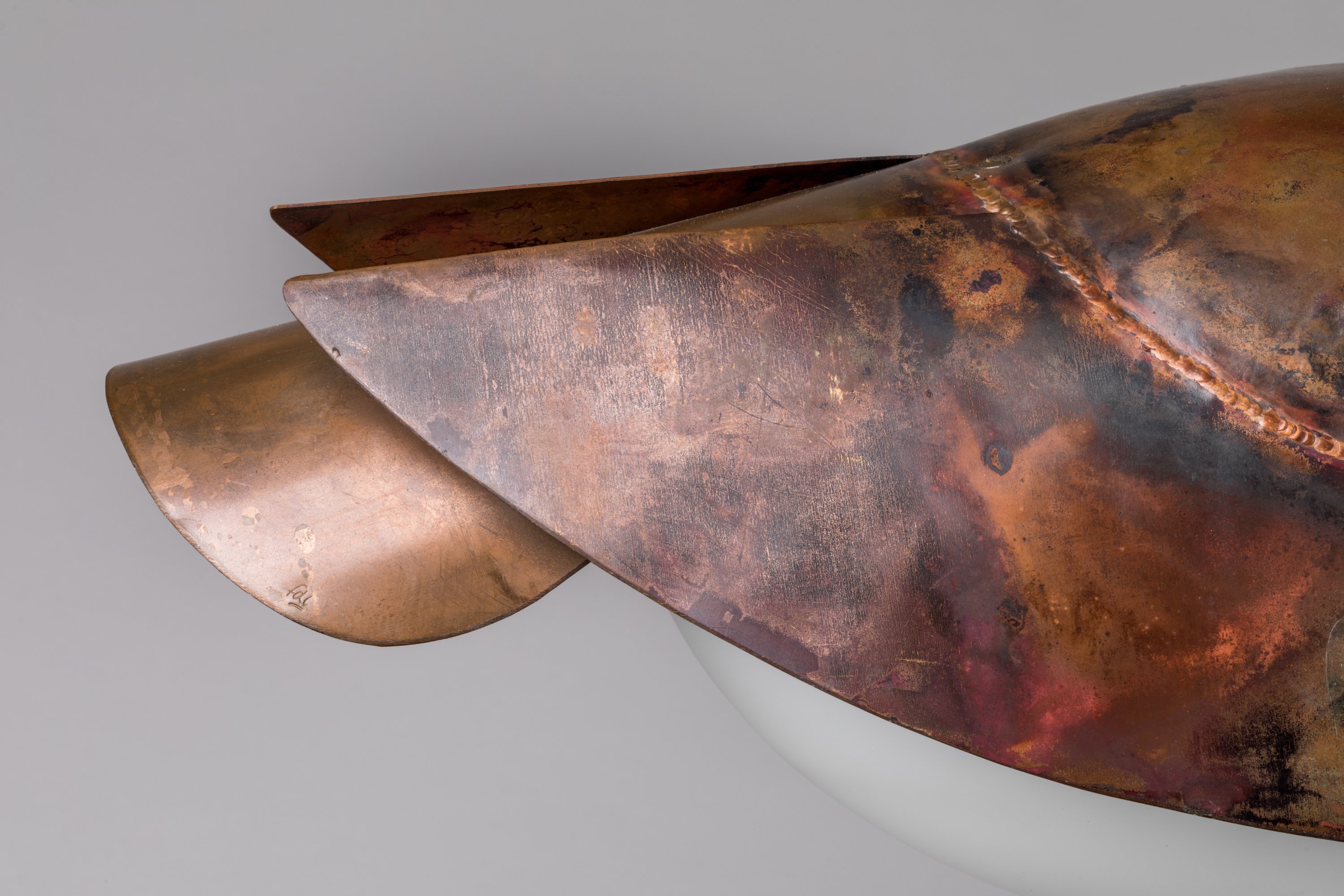 en cuivre à patine rouge, bronze doré et verre sablé.