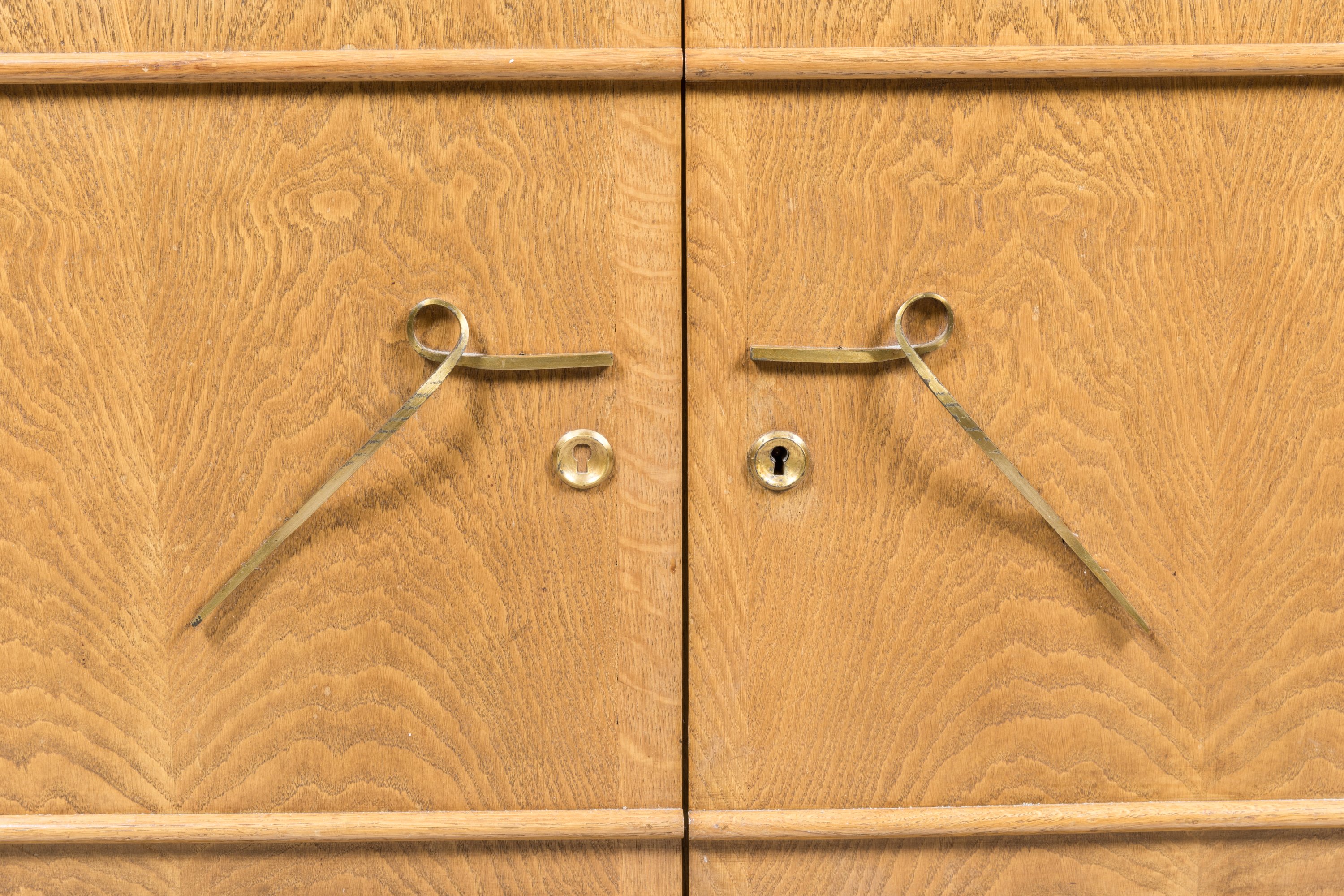 en bois naturel mouluré. Elle ouvre en partie haute par deux portes vitrées coulissantes (accidents) et en partie basse par deux vantaux munis de poignées de tirage et entrées de serrure en bronze doré.
