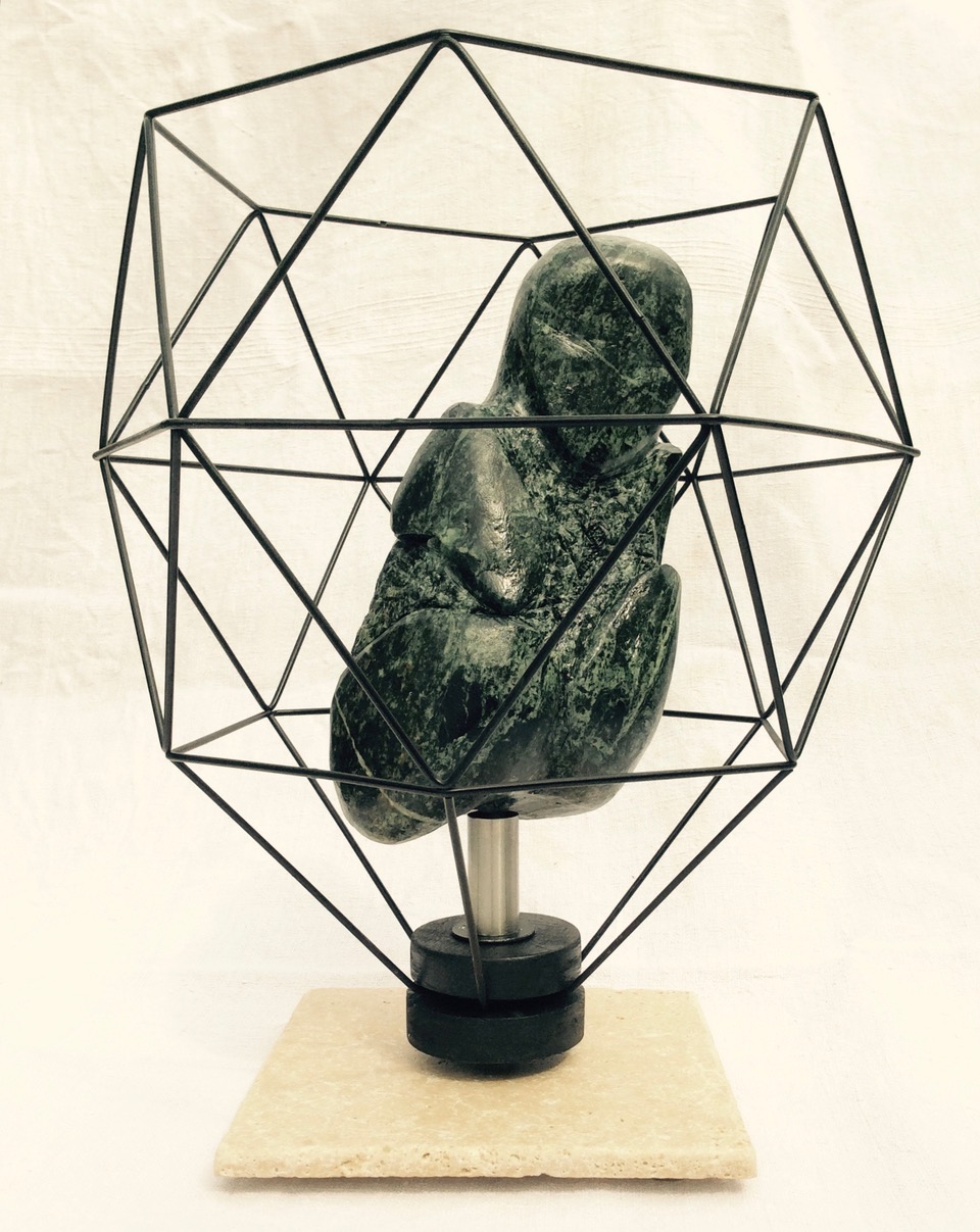 Diorite et cage en fer sur carreau de travertin. Montage rotatif.