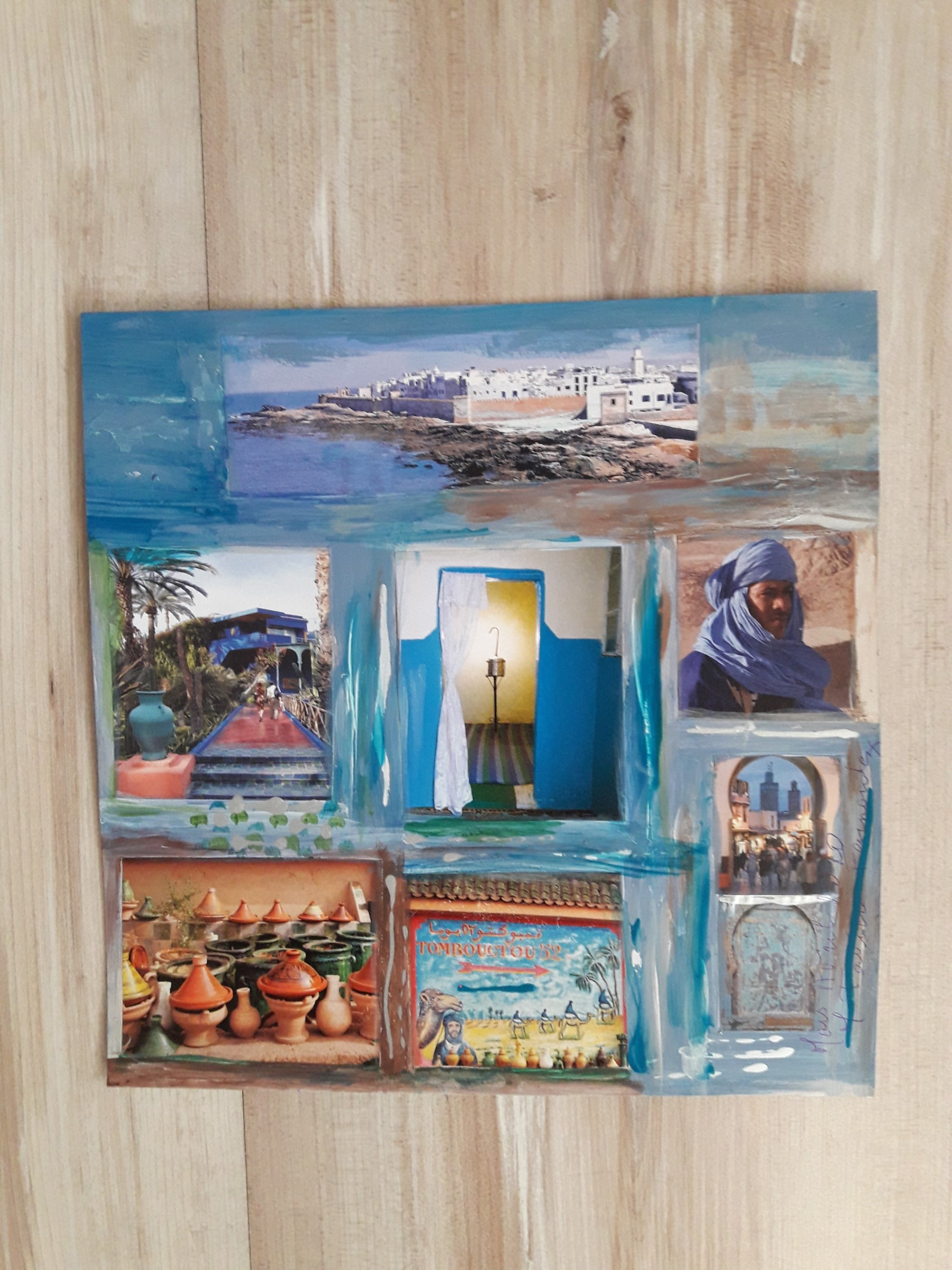 Collage et peinture sur carton recyclé.