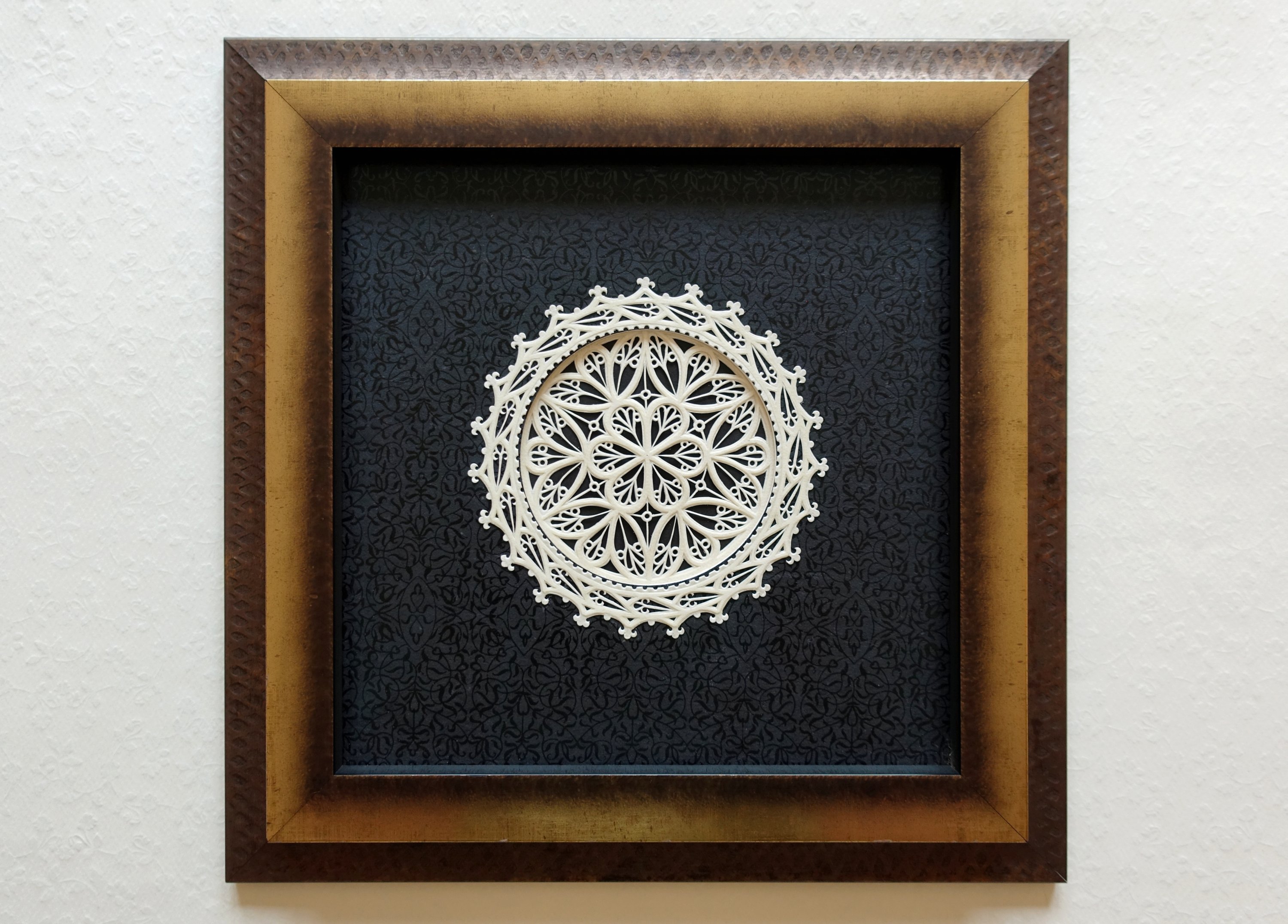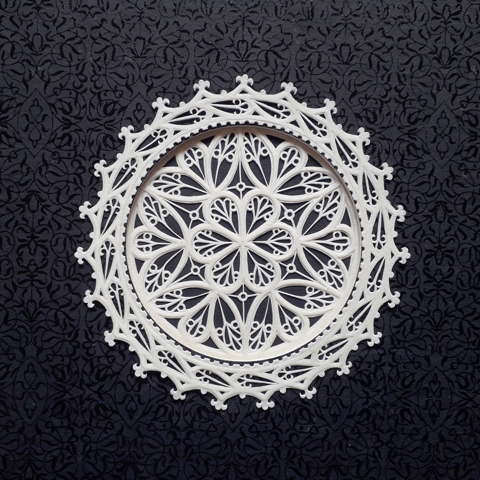 Rosace à deux niveaux avec deux feuilles de parchemin sculptées et superposées par niveau.