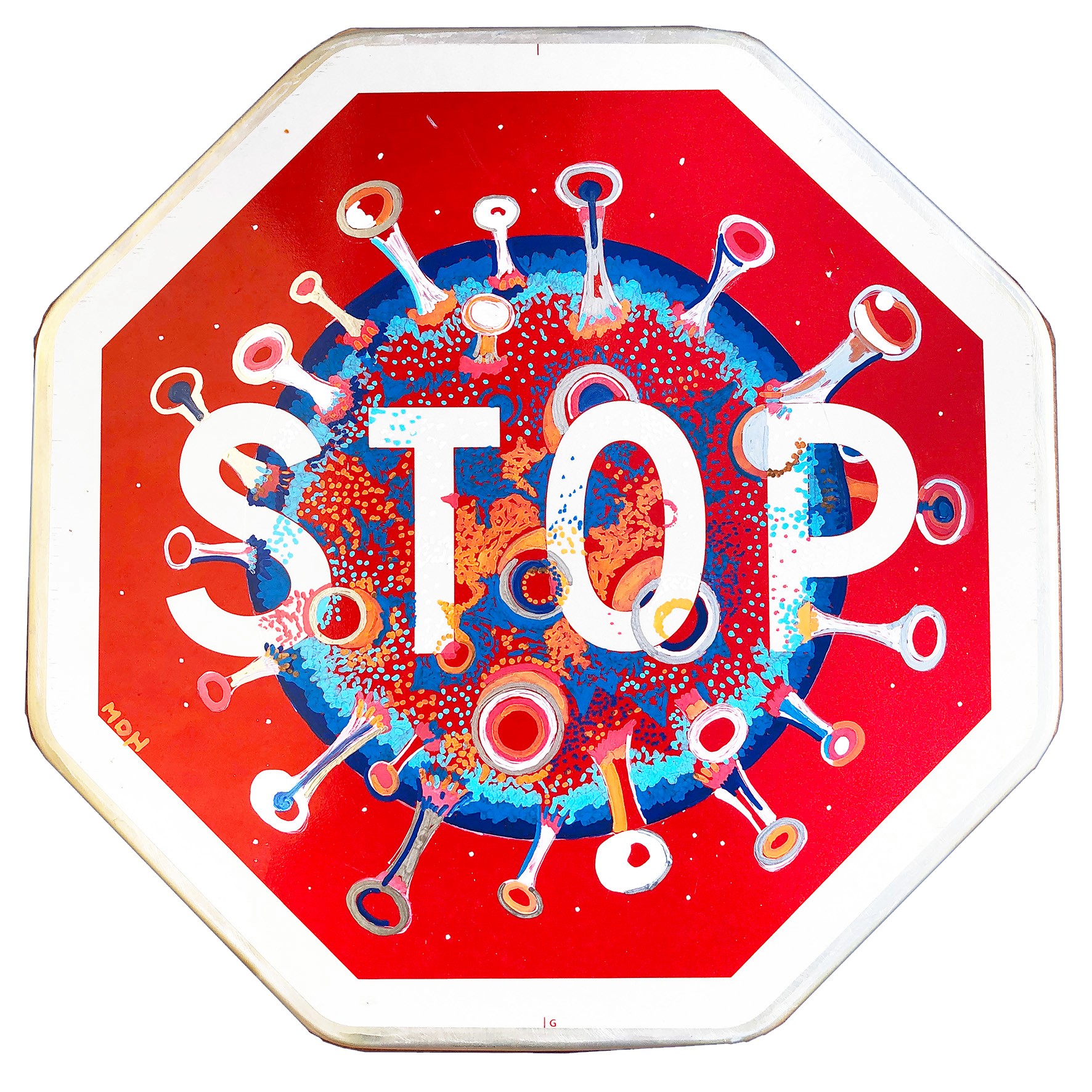 Peinture à l'huile sur panneau routier obsolète, en aluminium filmé.