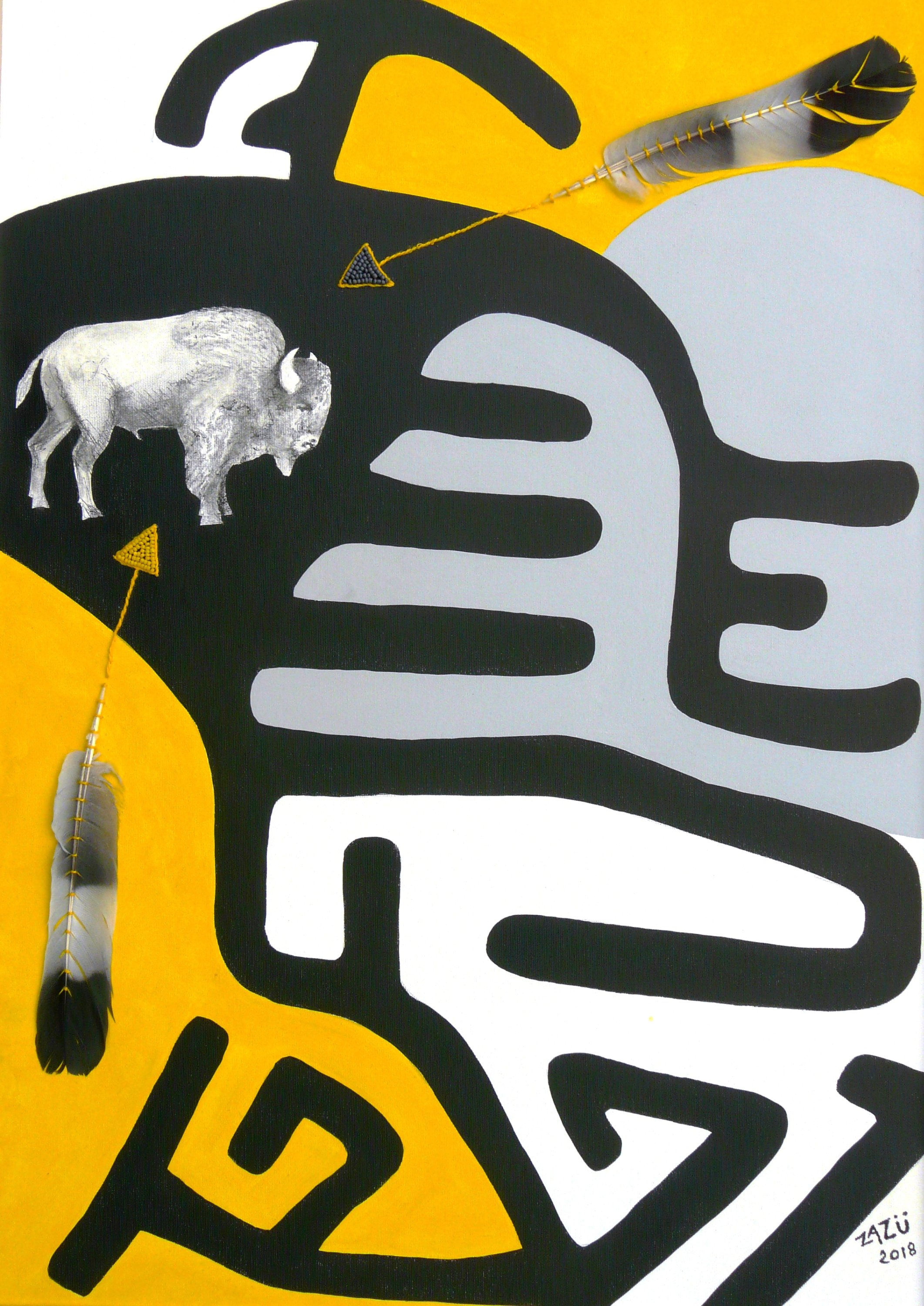 Graphite et acrylique sur toile avec inscrutation de plumes, fil et perles.
