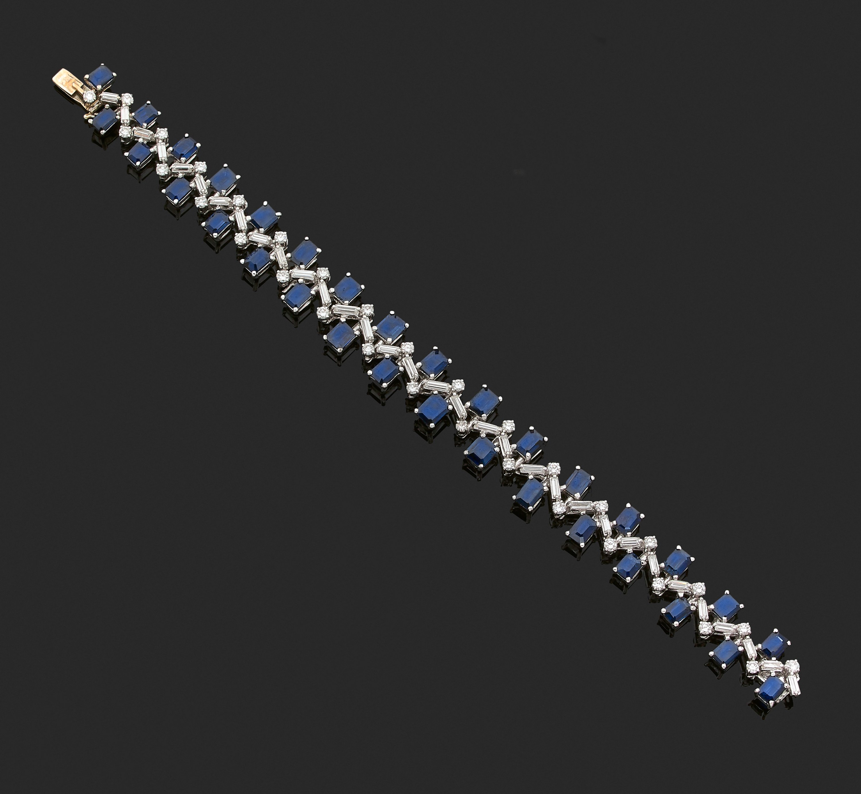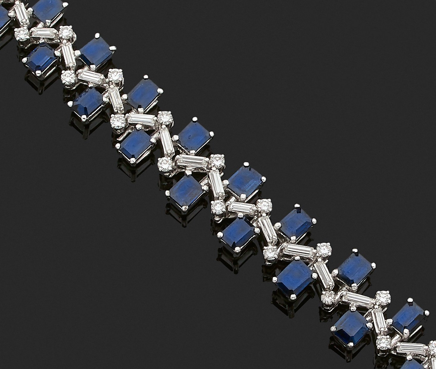 BRACELET ARTICULÉ en or gris 585 millièmes (14 kt), serti de saphirs de forme rectangulaire de part et d'autre d'une ligne mouvementée sertie de diamants baguettes et ronds alternés.
