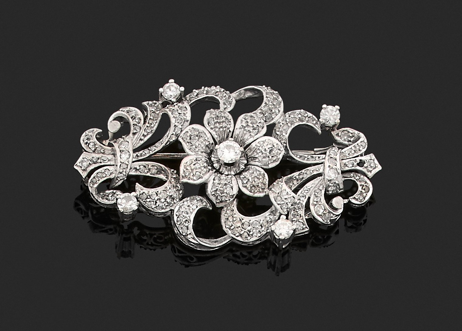 BROCHE en or gris 750 millièmes ajouré à décor d'agrafes et d'une fleur au centre, entièrement sertie de diamants taillés en rose, de taille ancienne et de taille brillant, certains plus importants.