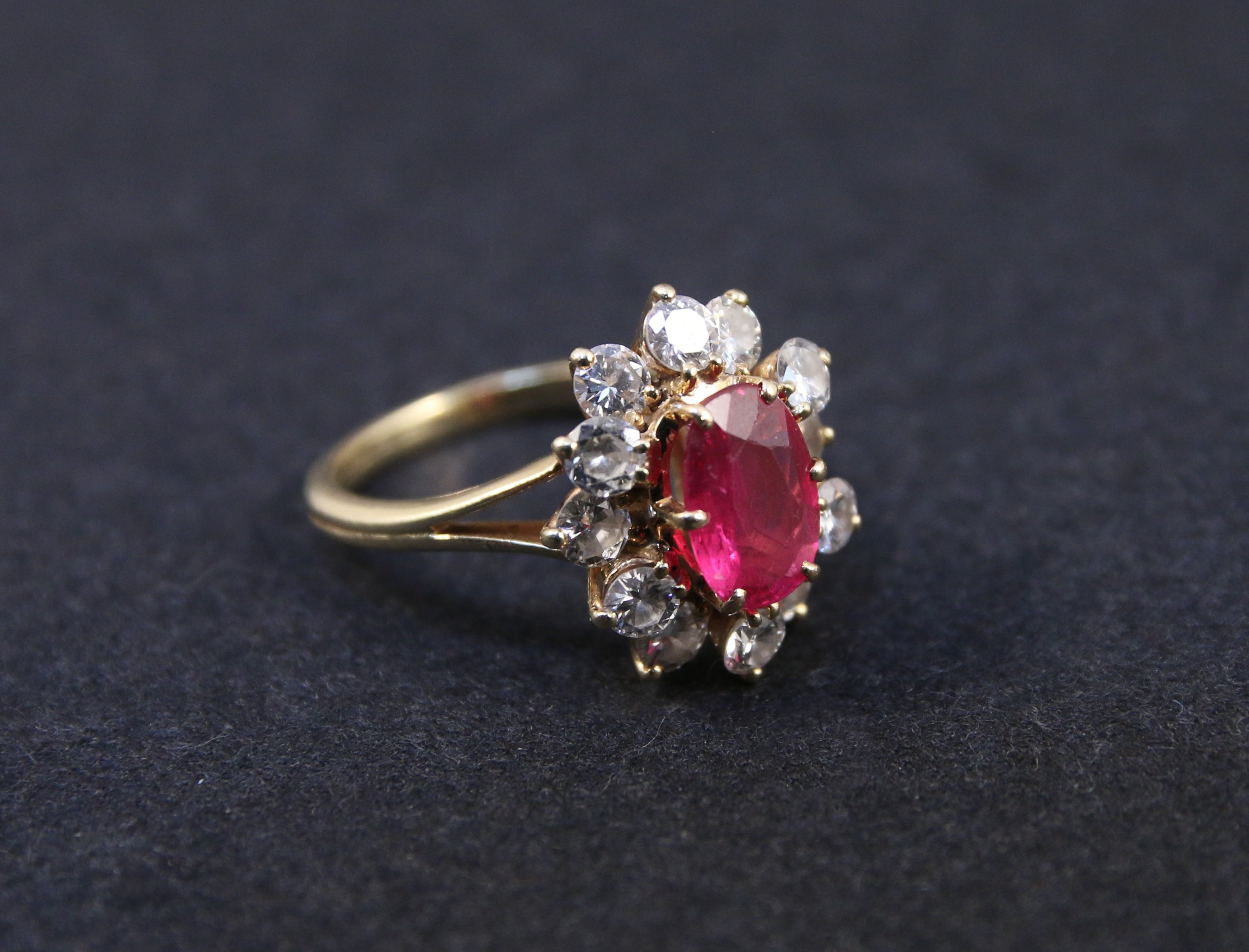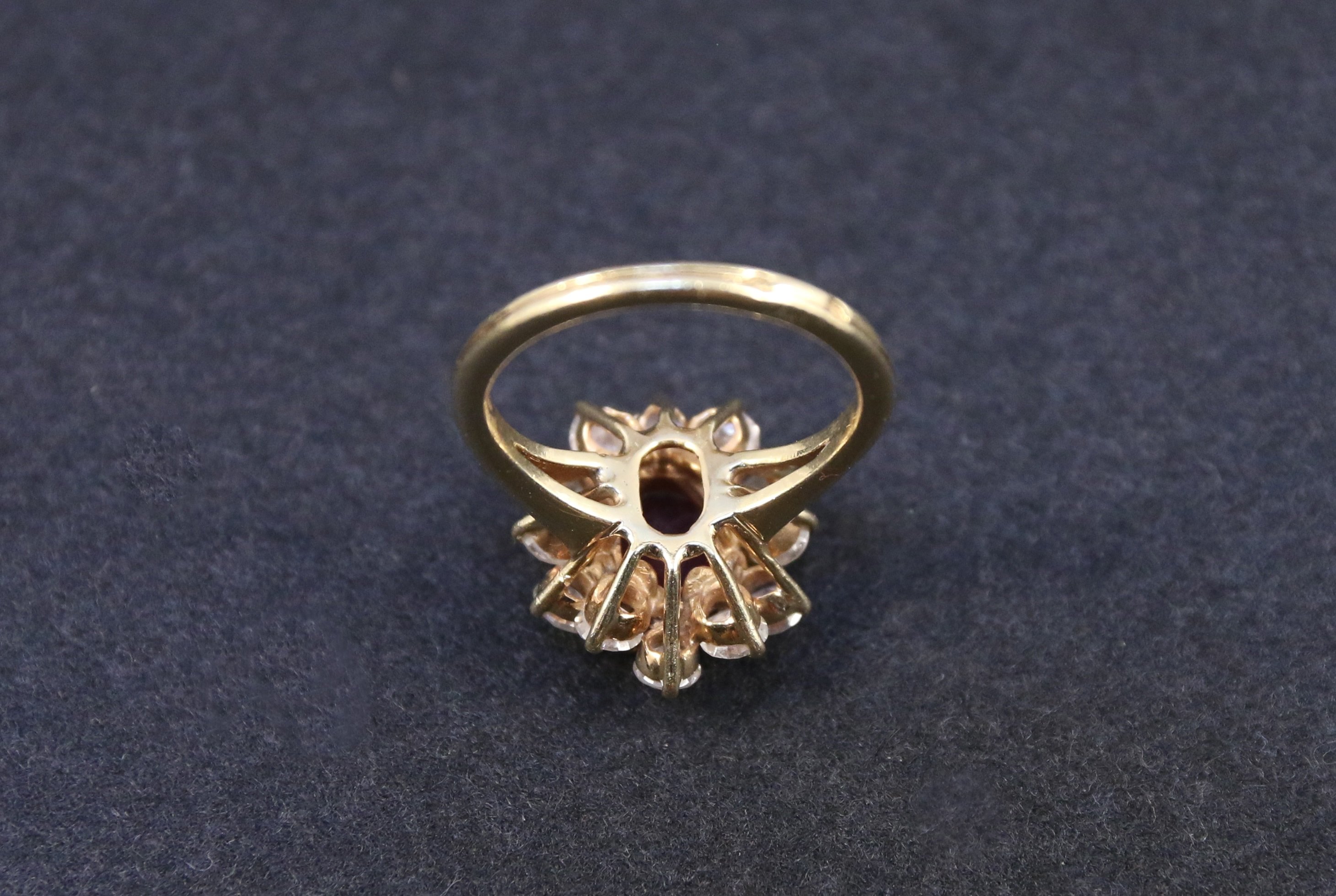 BAGUE en or jaune 750 millièmes ornée au centre d'un rubis ovale dans un entourage de douze diamants ronds de taille brillant.