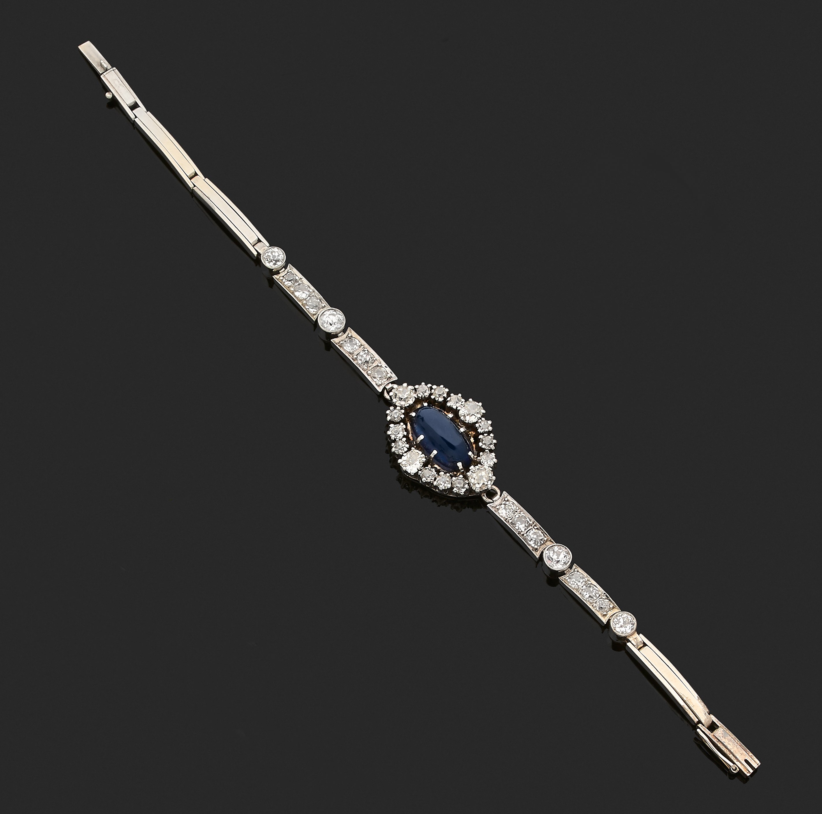 BRACELET ARTICULÉ en or gris 750 millièmes, les maillons allongés, certains ornés de diamants ronds de taille ancienne, retenant au centre un motif serti d'une pierre de synthèse bleue cabochon dans un entourage de diamants ronds et coussin de taille ancienne.