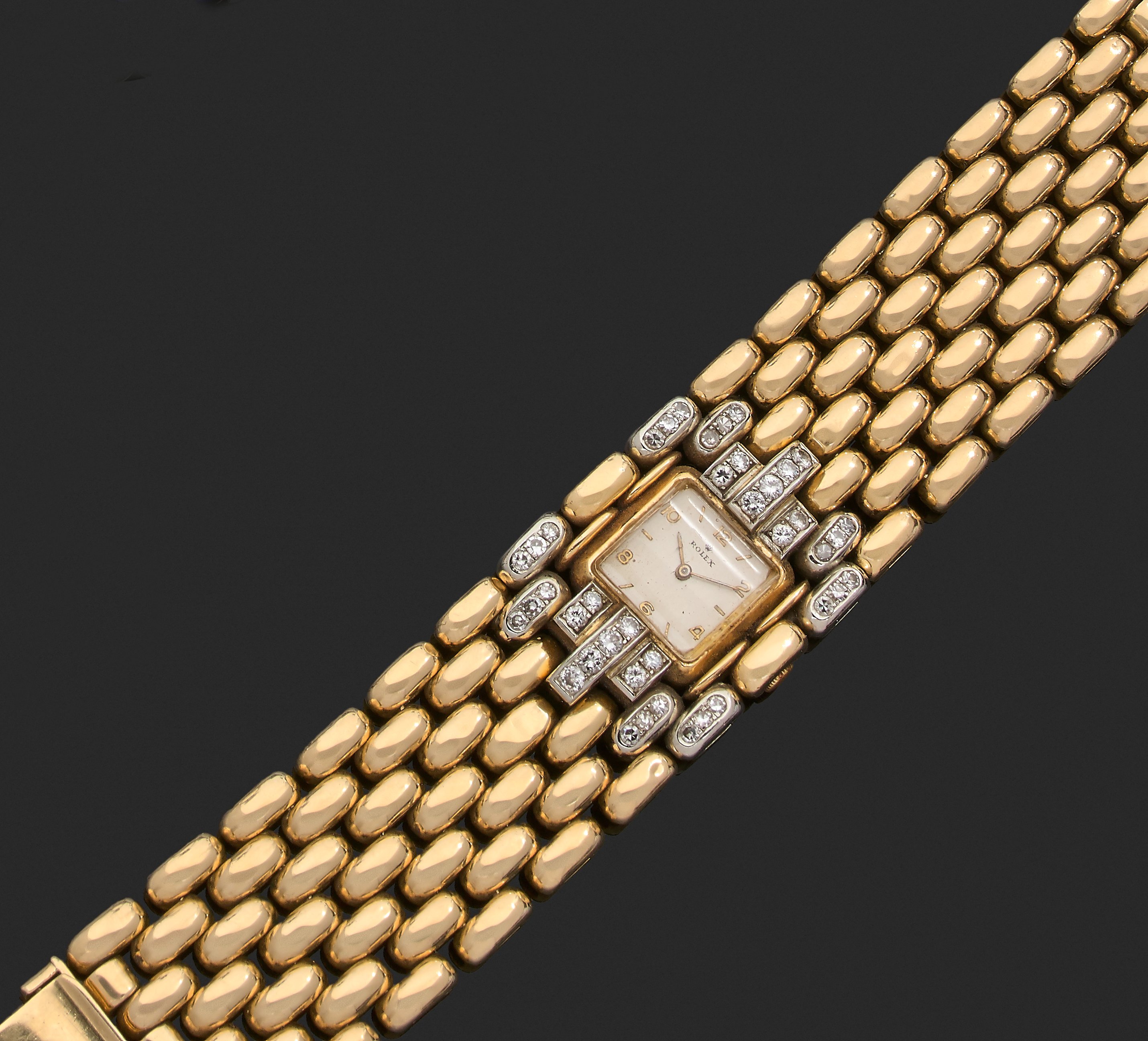 Large BRACELET ruban ARTICULÉ en or et platine, orné au centre d'une montre bracelet carrée à mouvement mécanique dans des attaches serties de brillants et diamants huit-huit. Le fermoir monogrammé. Le cadran, la platine de la montre et le boitier signés Rolex.