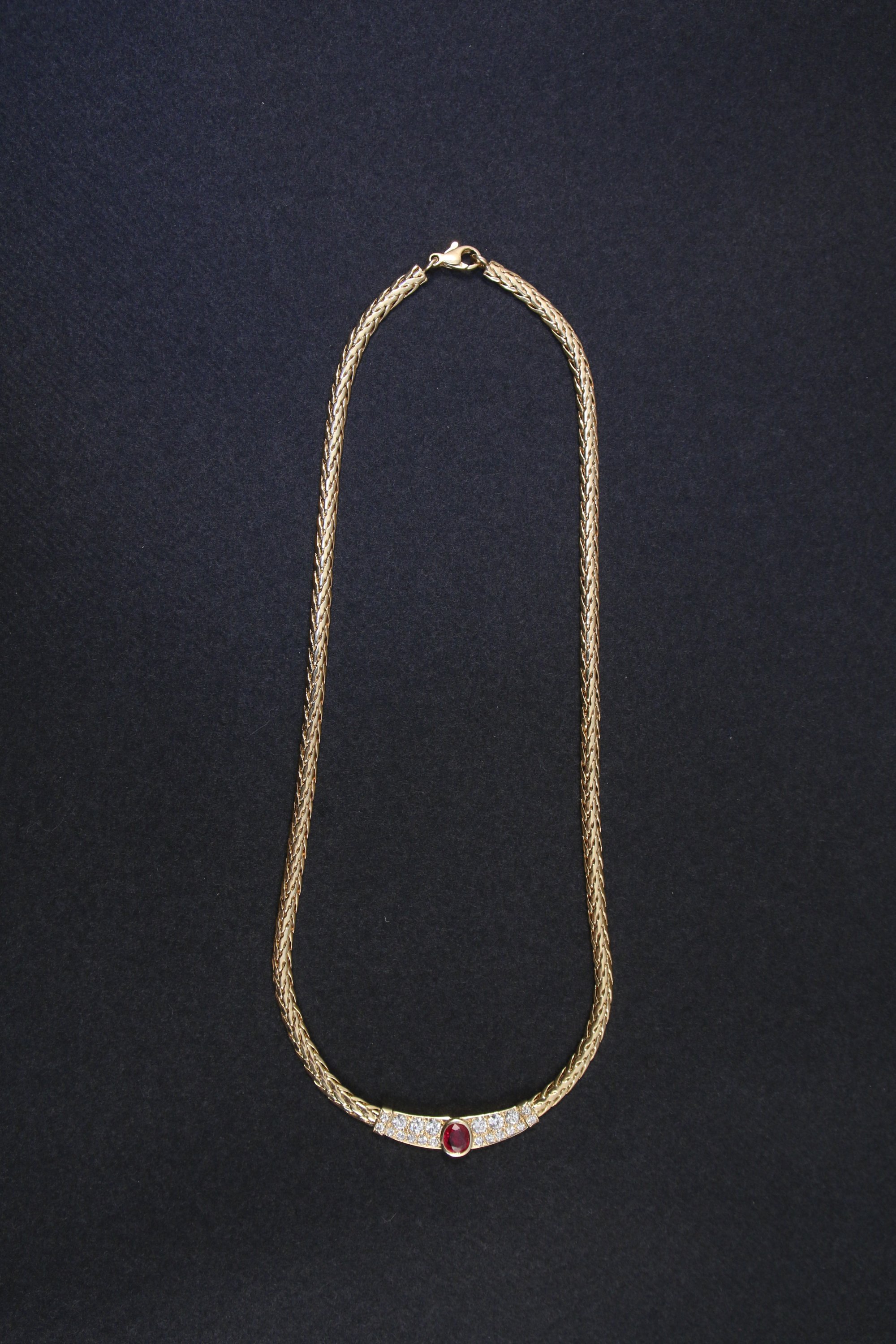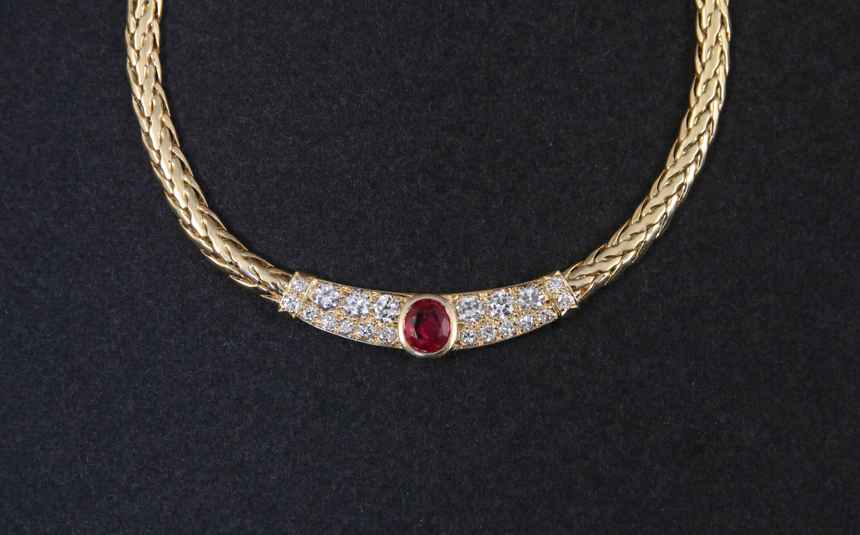 COLLIER SOUPLE en or jaune 750 millièmes, les maillons à décor de chevrons retenant au centre un motif orné d'un rubis coussin serti-clos entre des lignes de diamants ronds de taille brillant.