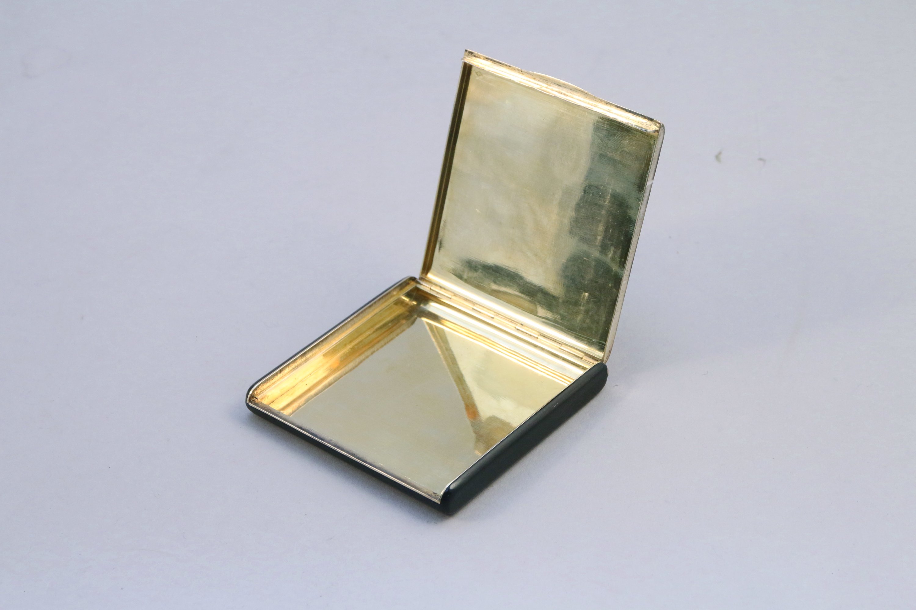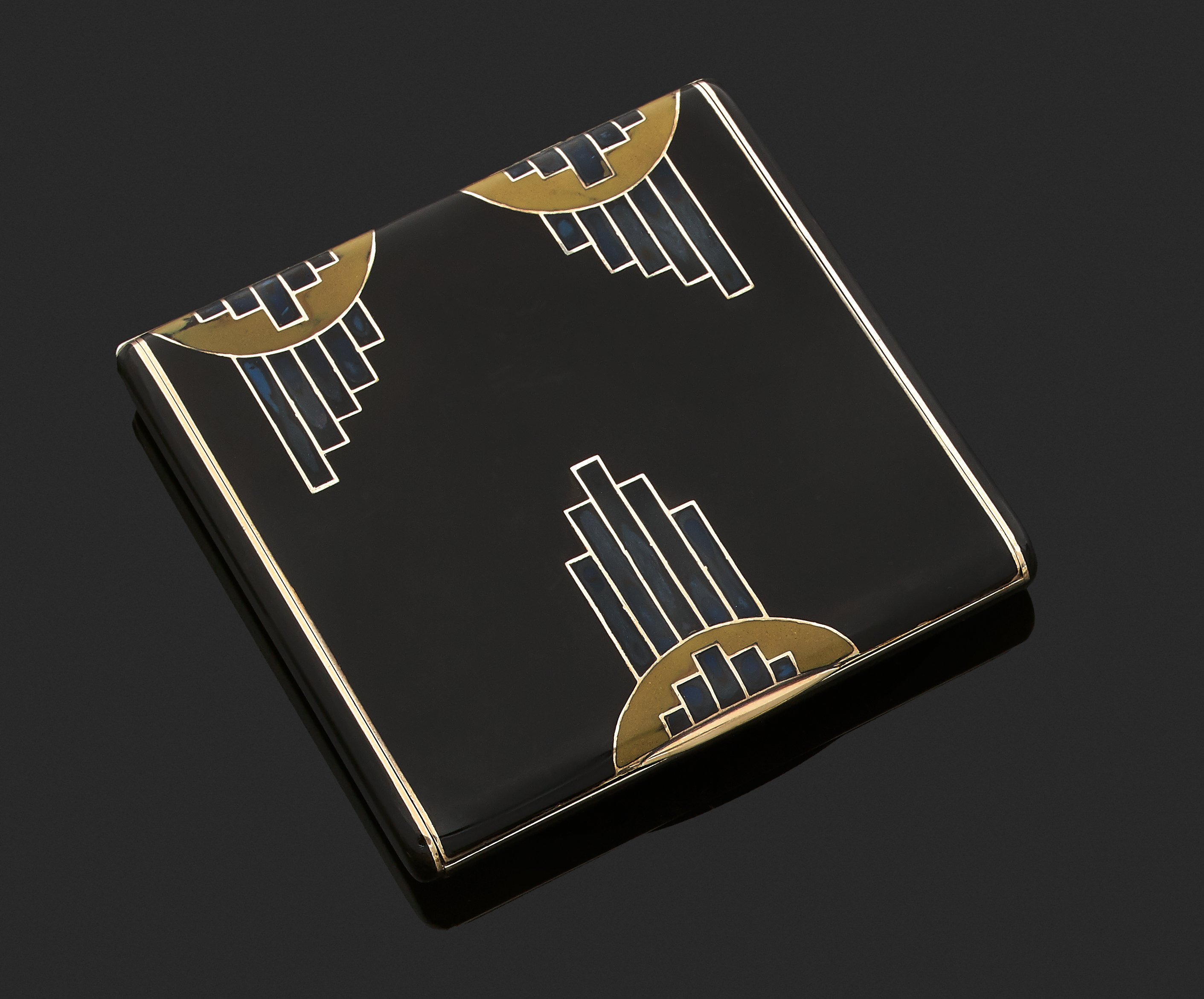 ÉTUI à CIGARETTES en or et argent (poinçon de l'alliage or et argent) de forme carrée, laqué noir, le couvercle décoré de motifs géométriques émaillés bleu et jaune.
