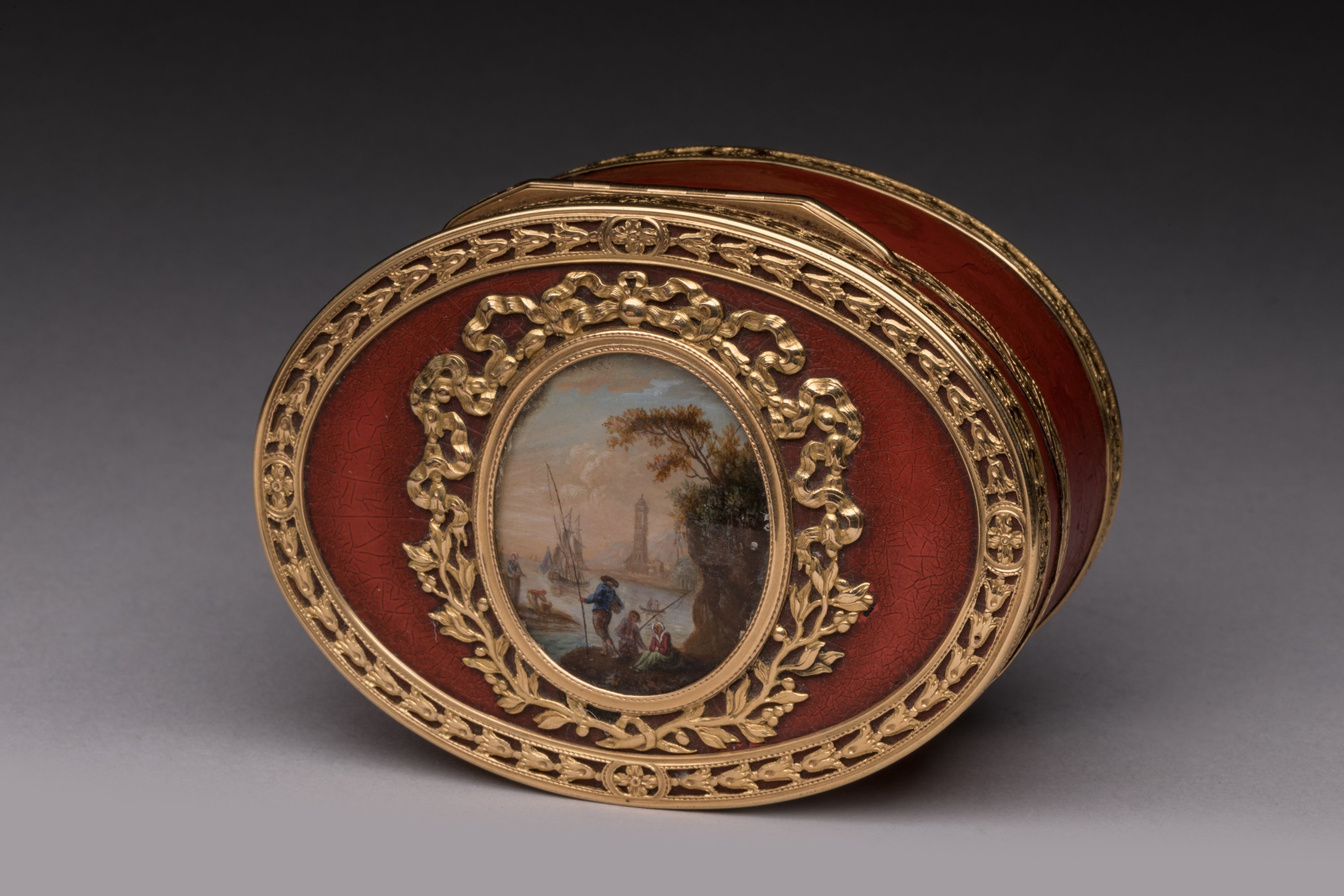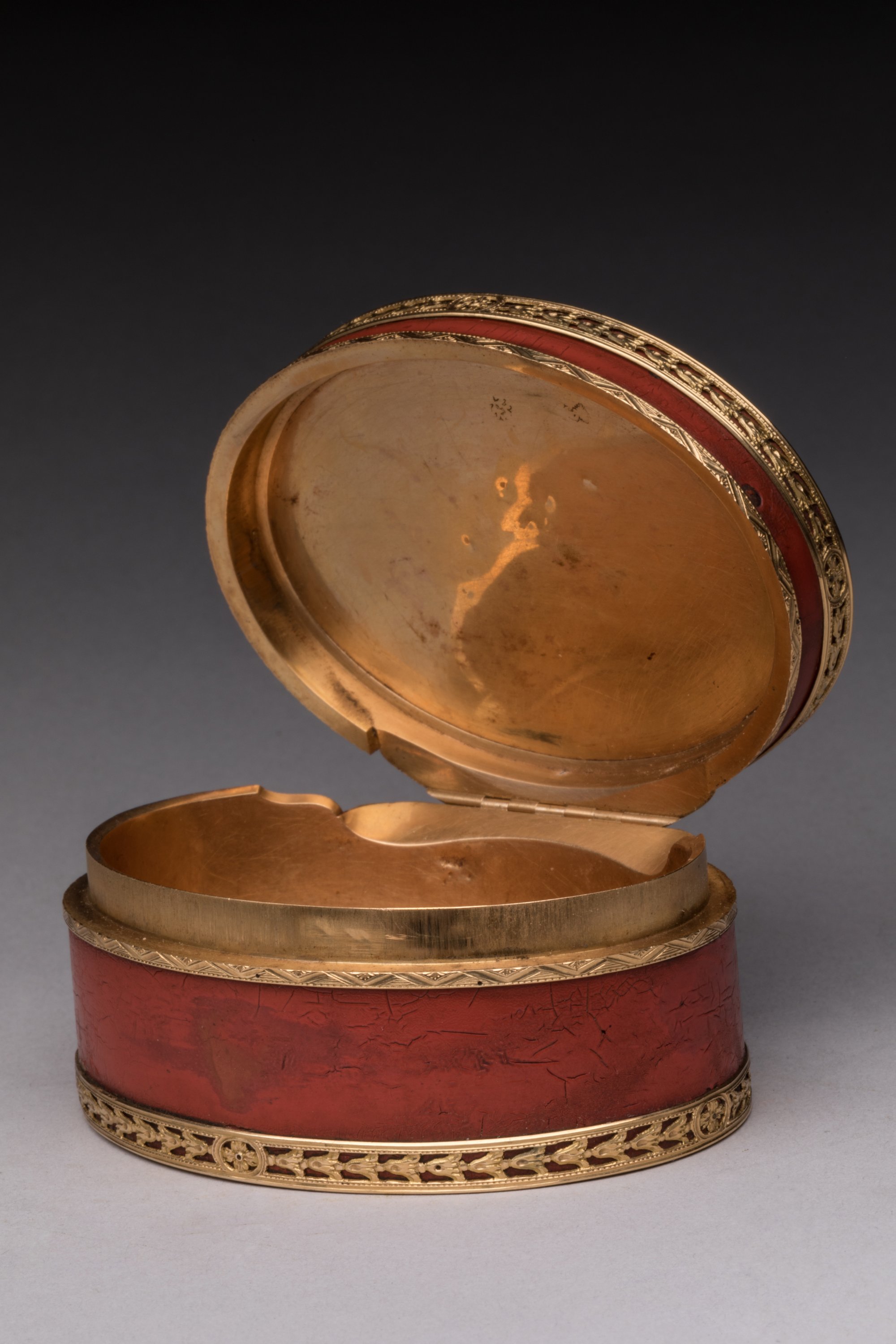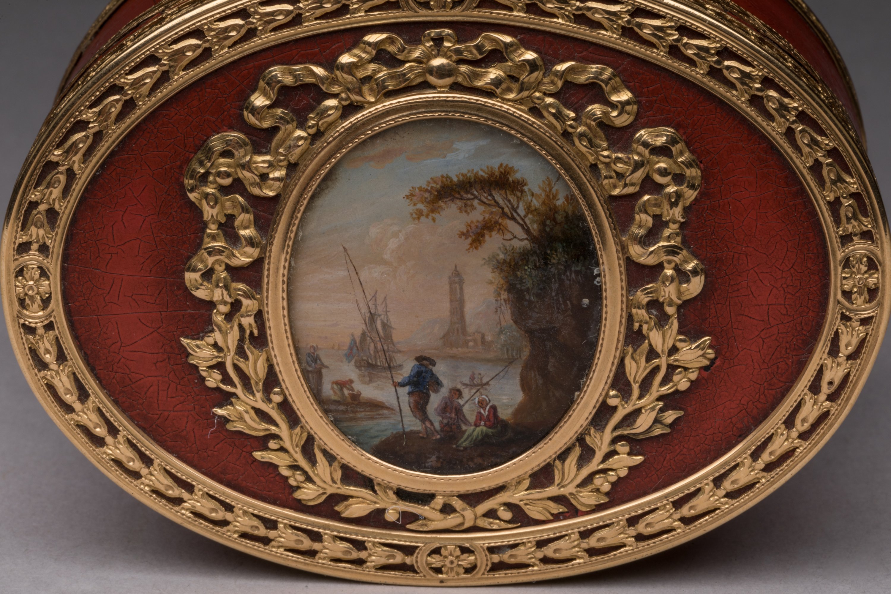 en or jaune de forme ovale, le couvercle orné d'une miniature figurant une scène de port avec une ville du Nord. Frise en or ajourée de motifs de fleurs, le médaillon entouré de rubans et de rinceaux. Fond à décors rouge antique en vernis dit Martin.