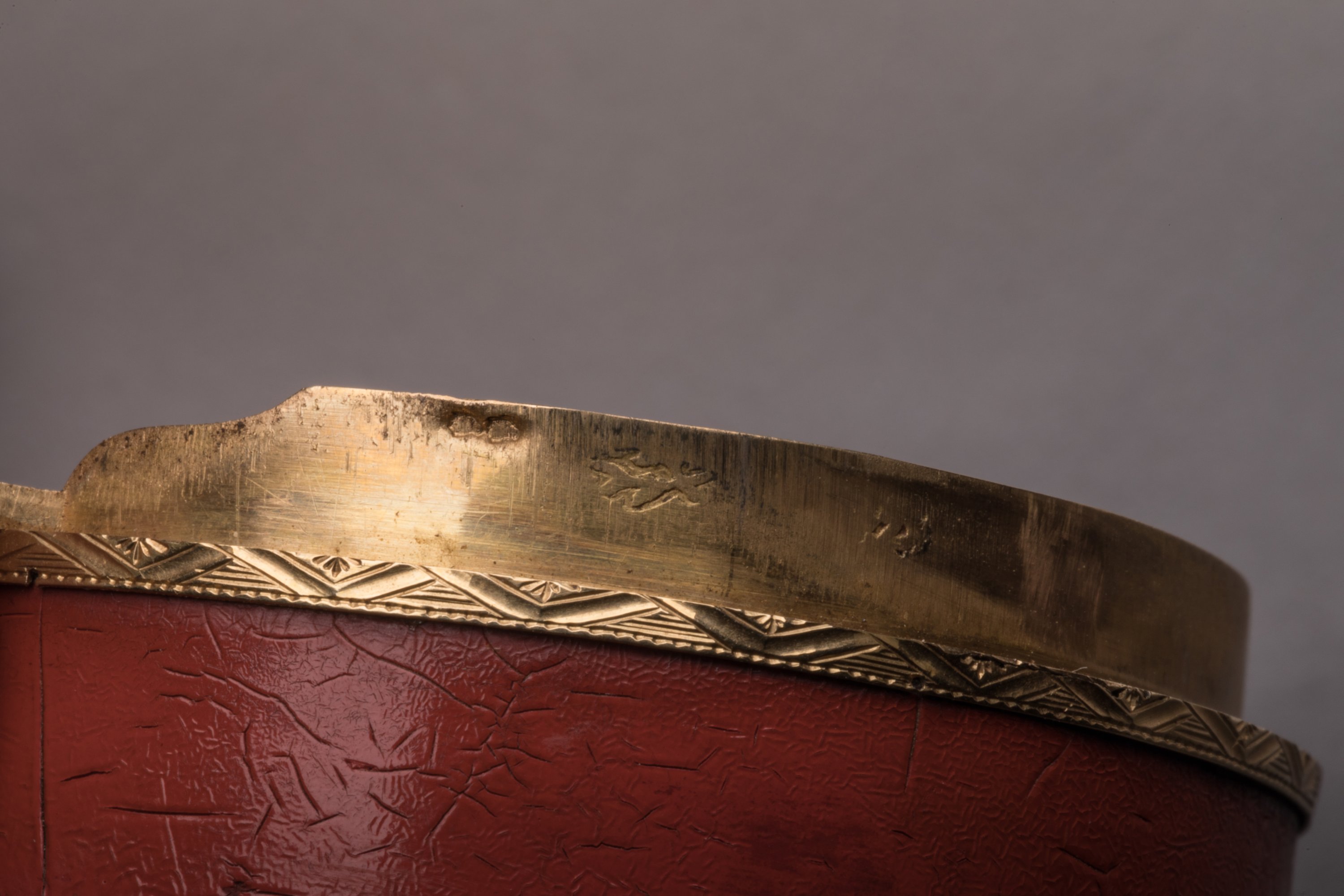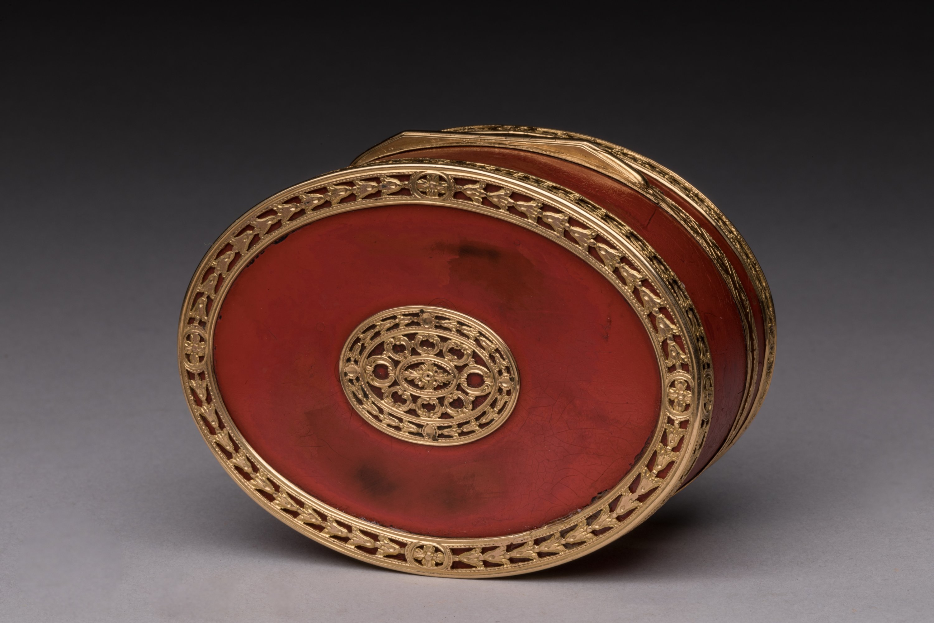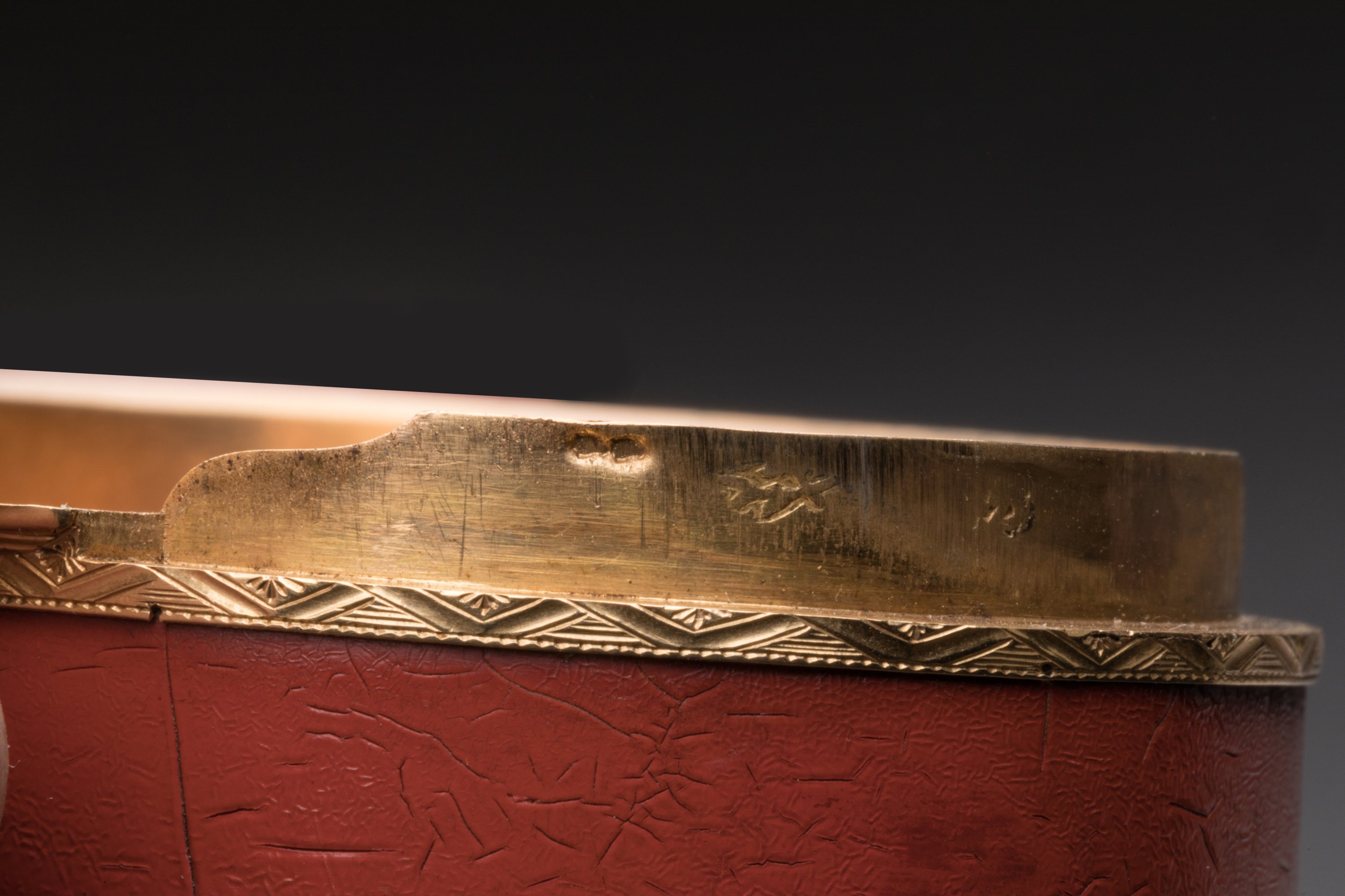 en or jaune de forme ovale, le couvercle orné d'une miniature figurant une scène de port avec une ville du Nord. Frise en or ajourée de motifs de fleurs, le médaillon entouré de rubans et de rinceaux. Fond à décors rouge antique en vernis dit Martin.