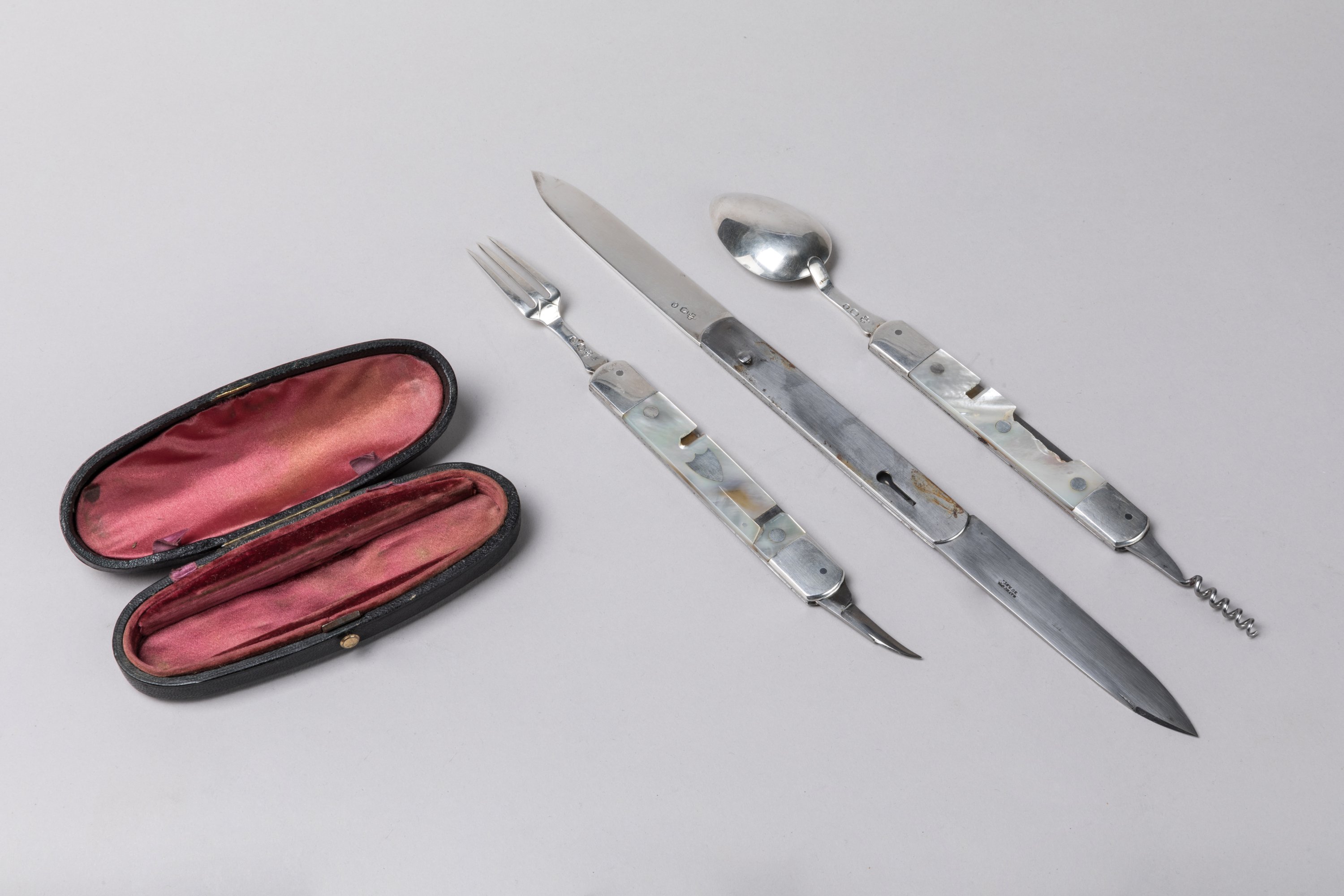 Travel kit containing silver cutlery. Late Empire period early Restoration period.