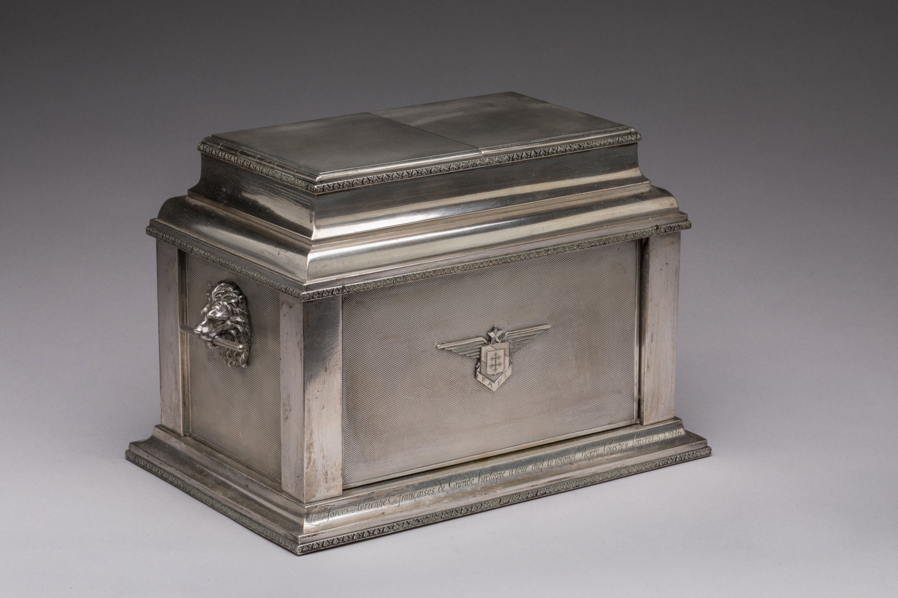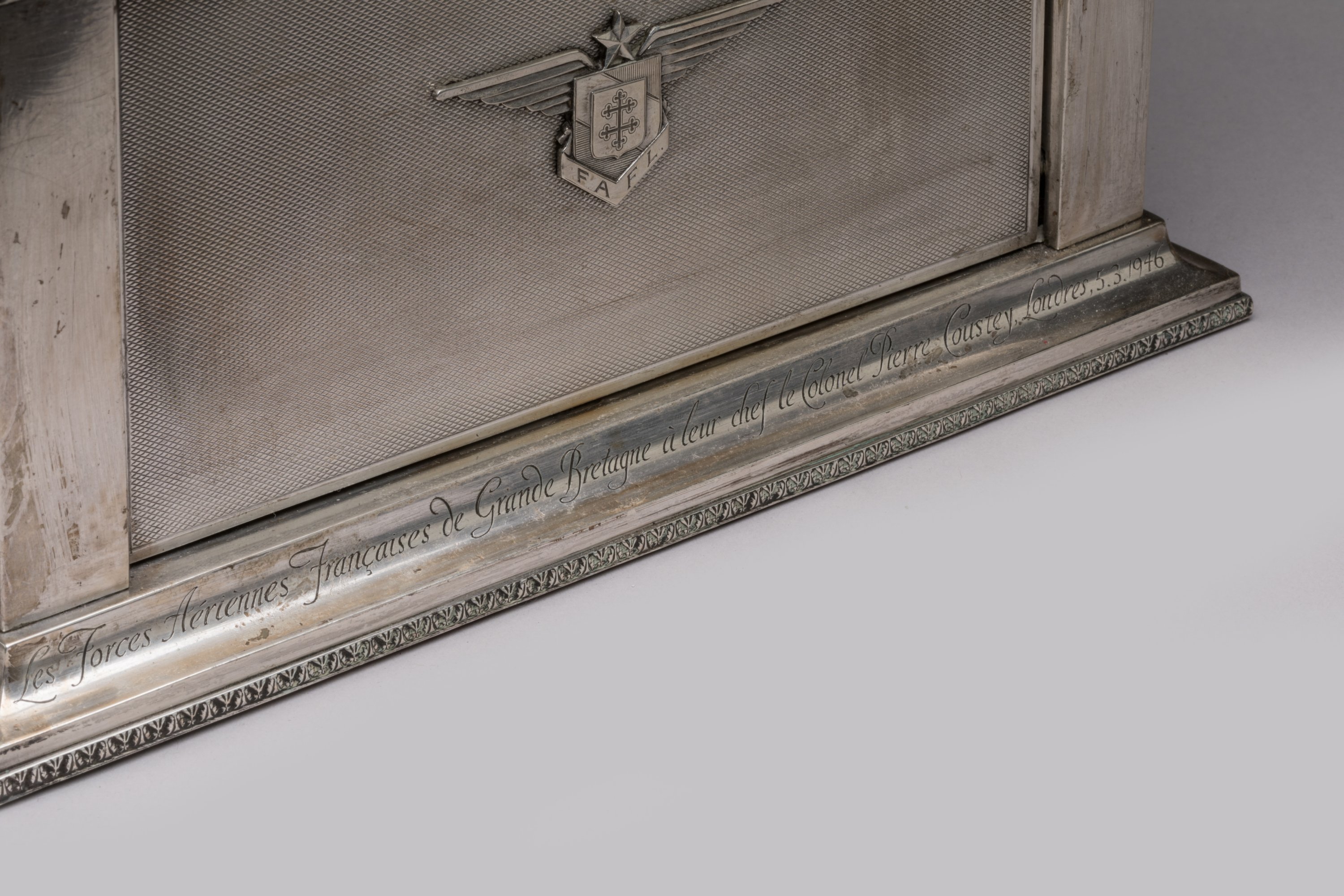 Inscription gravée: "les Forces Aériennes Françaises de Grande Bretagne à leur chef le Colonel Pierre Coustey, Londres 5.3.1946 "