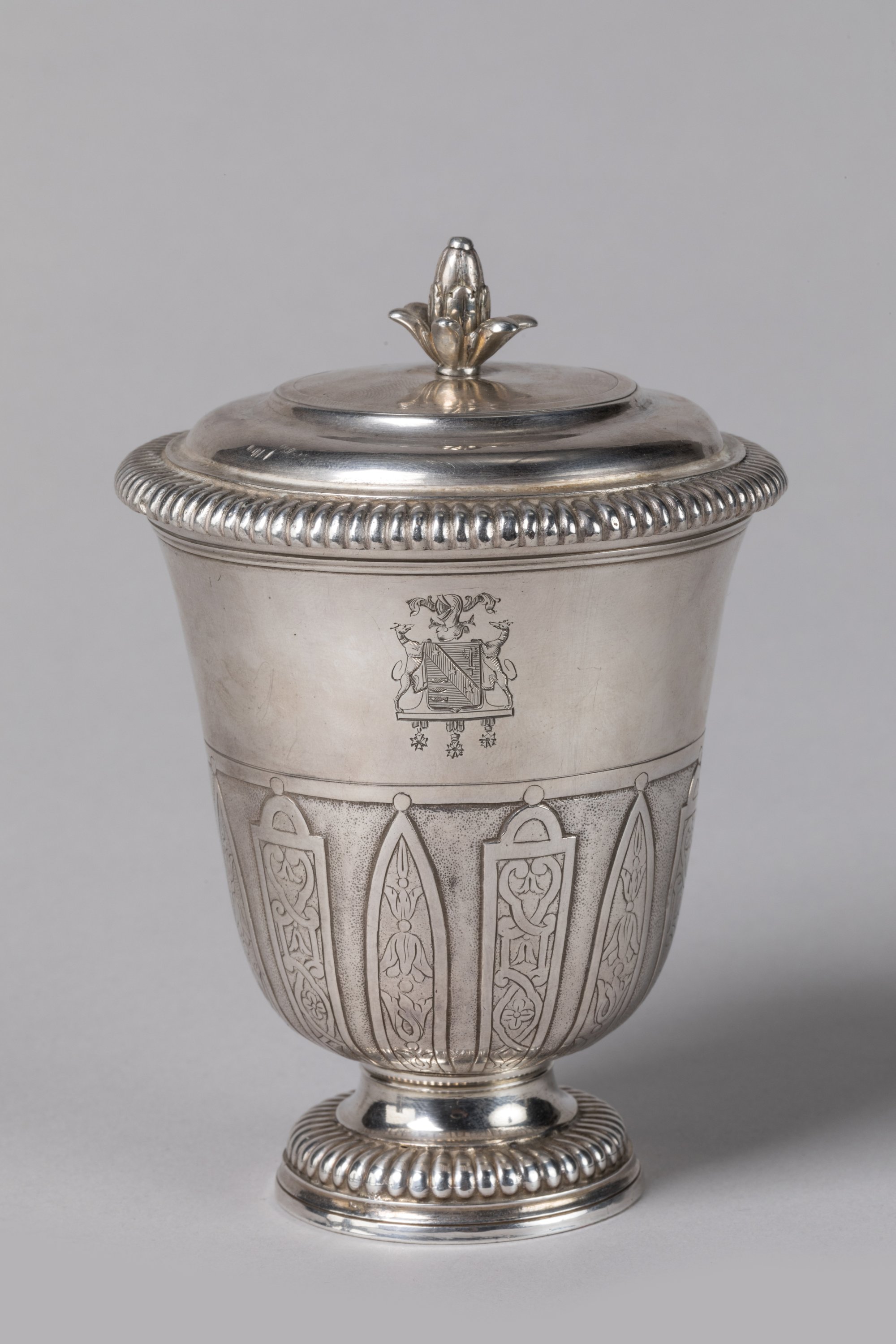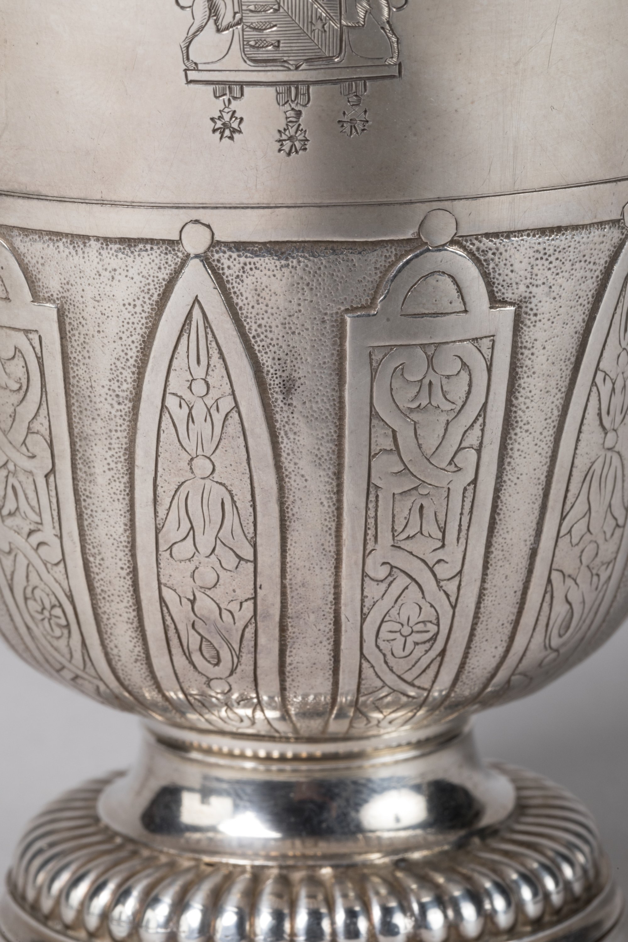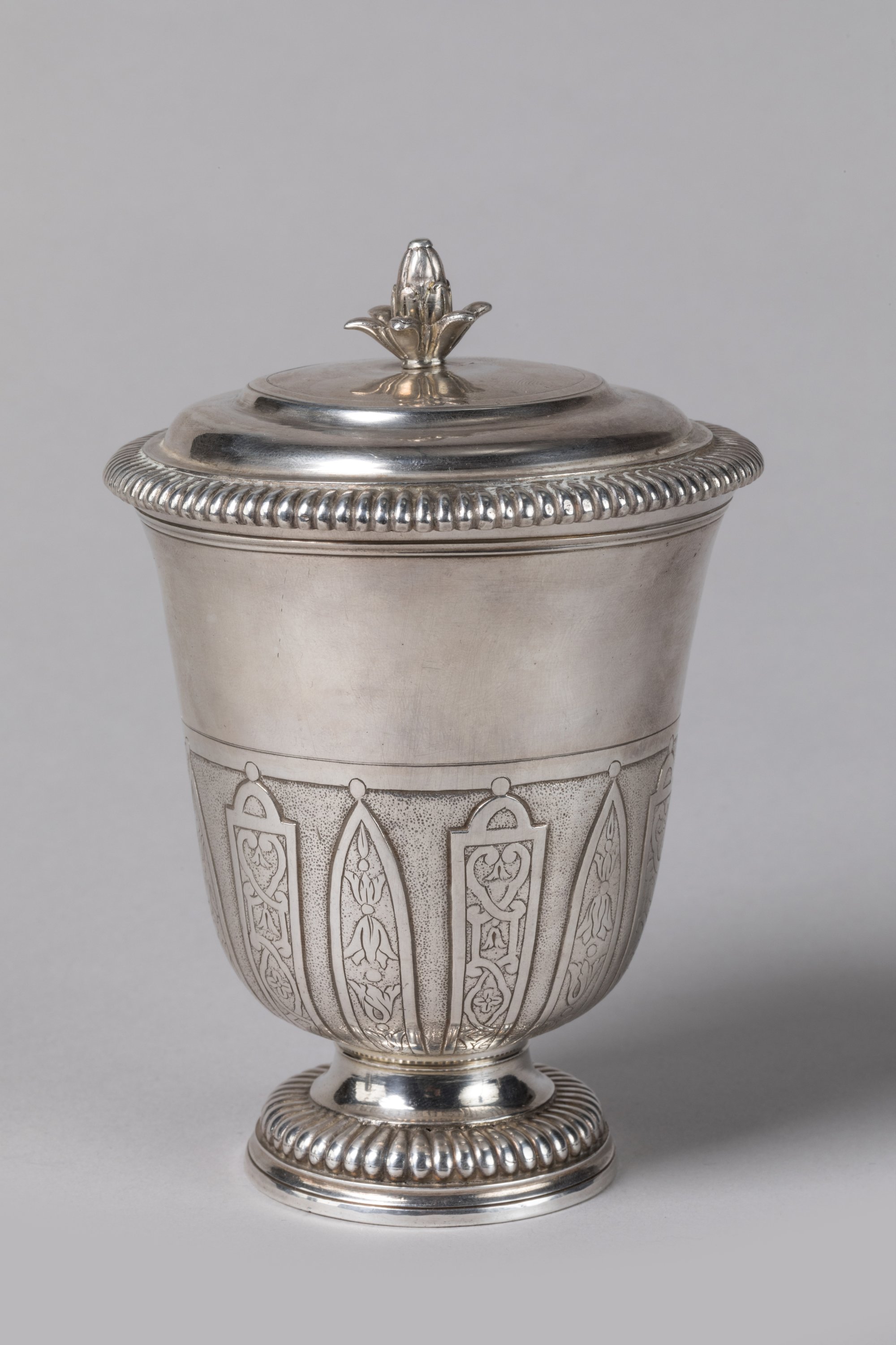 en argent, orné à mi-corps de motifs de lambrequins alternant avec des feuilles lancéolées. Piédouche à frise godronnée. Le col souligné de filets.