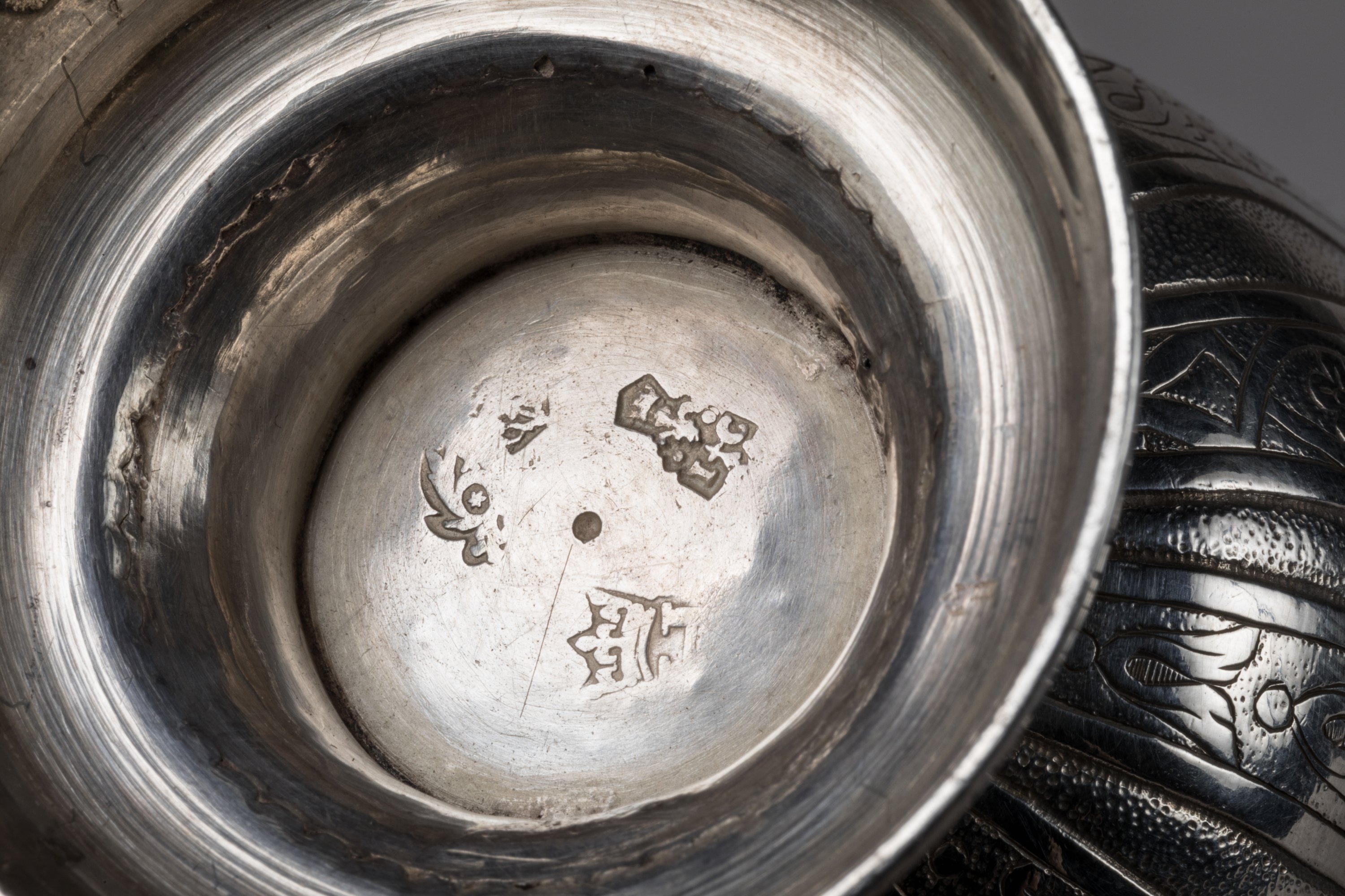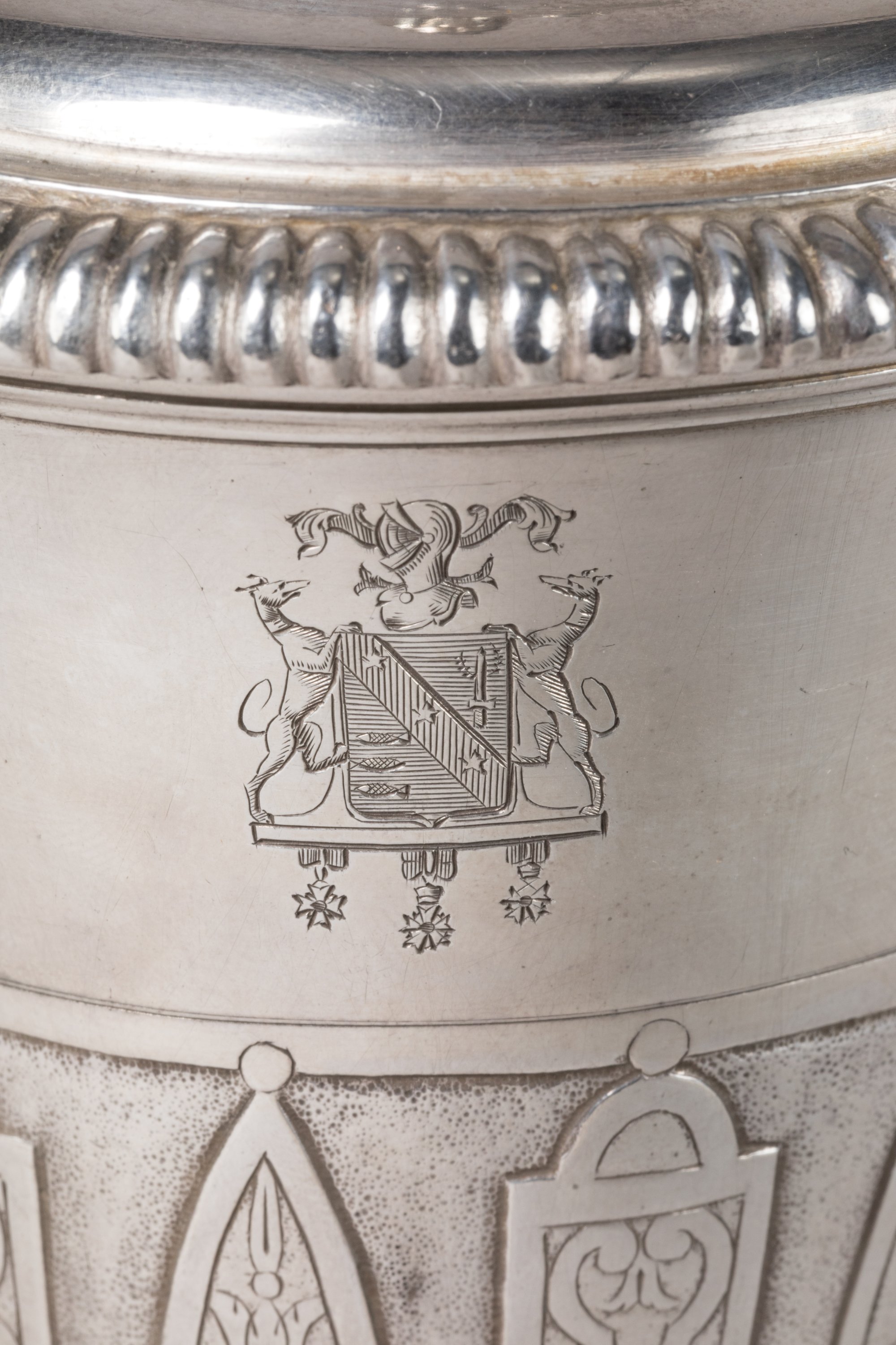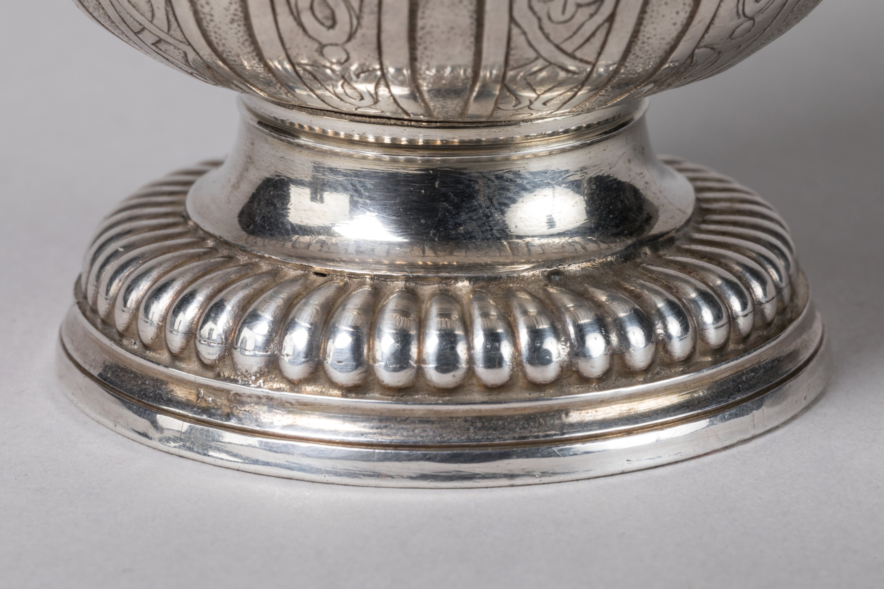 en argent, orné à mi-corps de motifs de lambrequins alternant avec des feuilles lancéolées. Piédouche à frise godronnée. Le col souligné de filets.