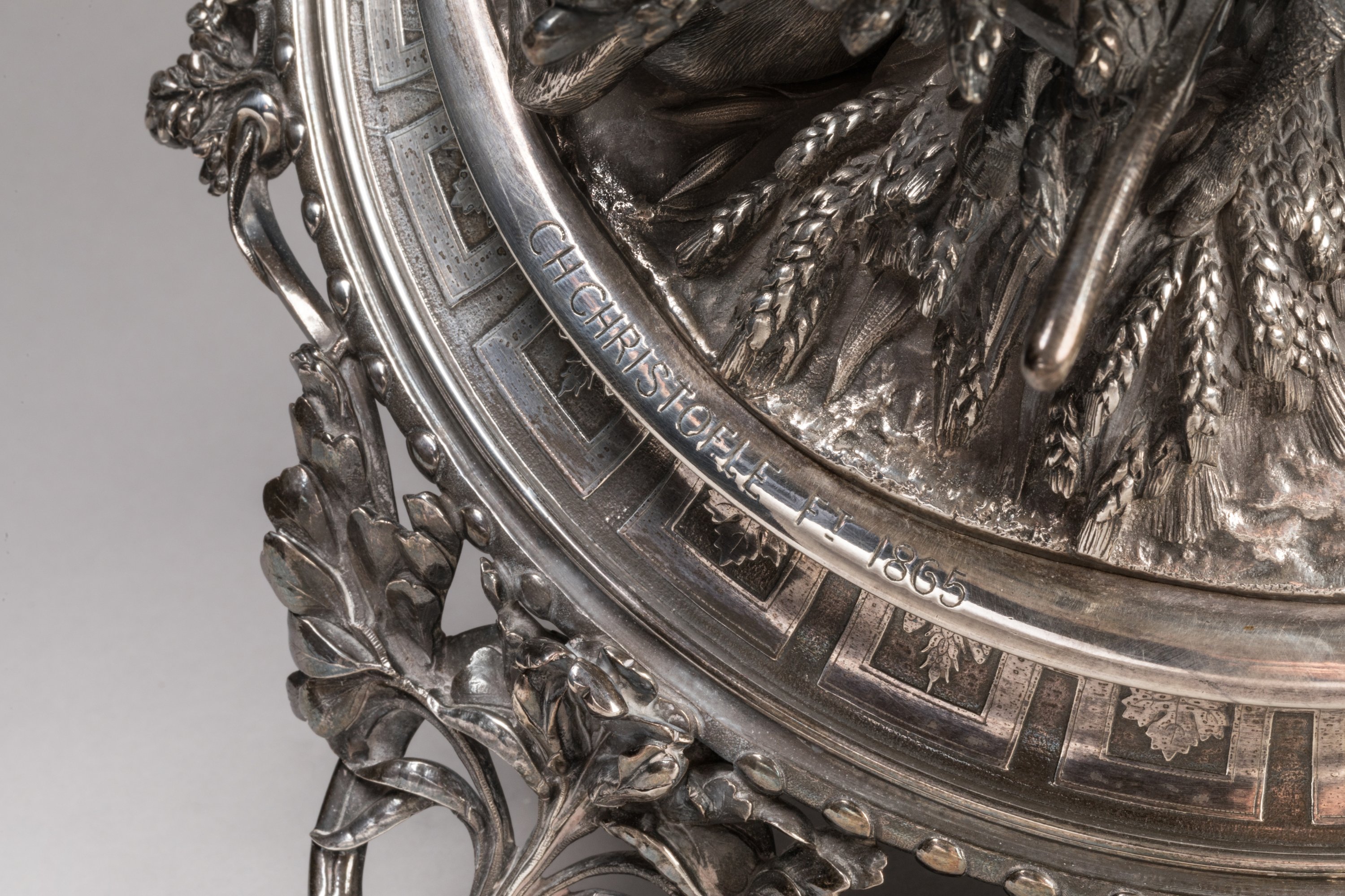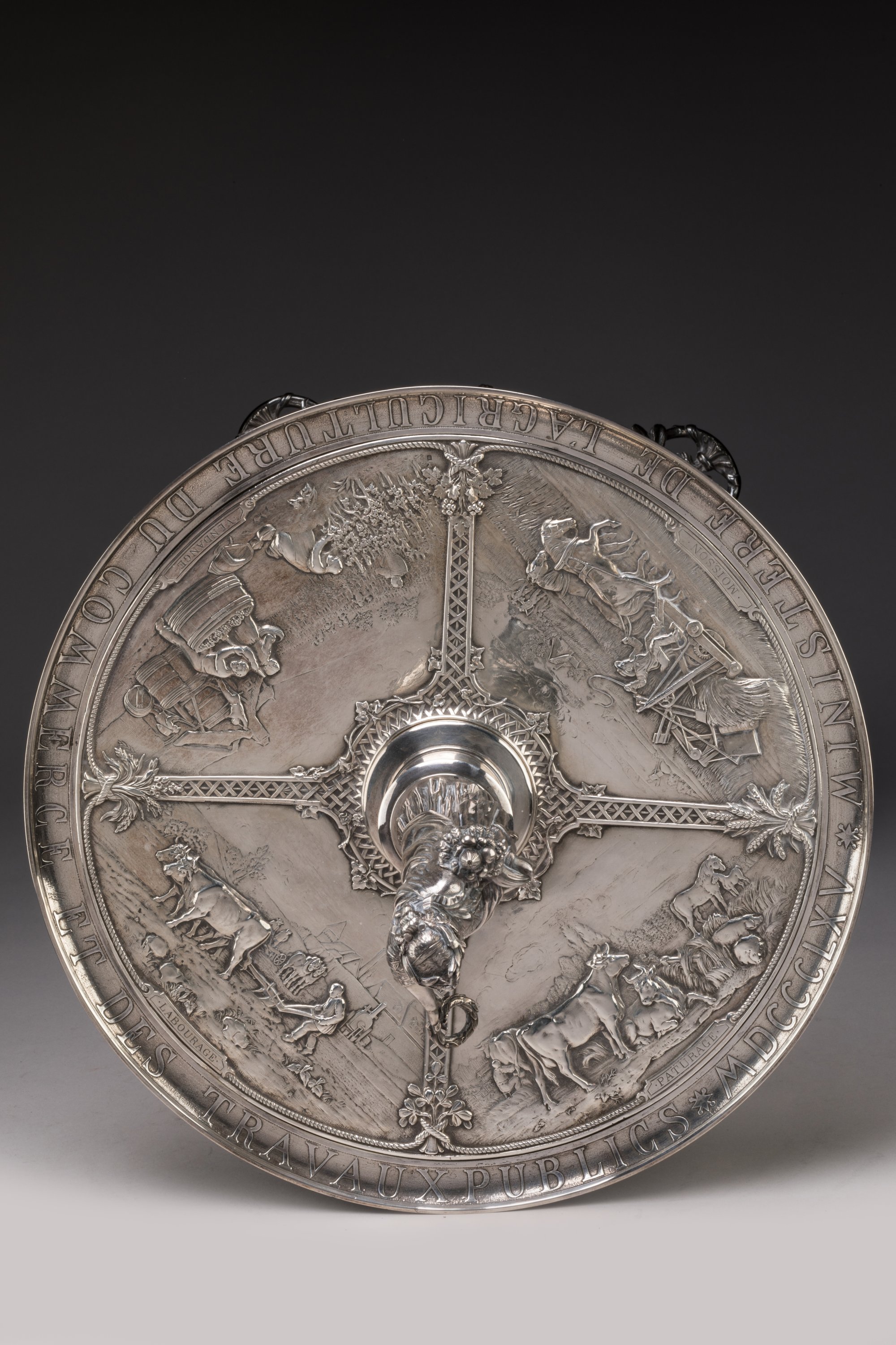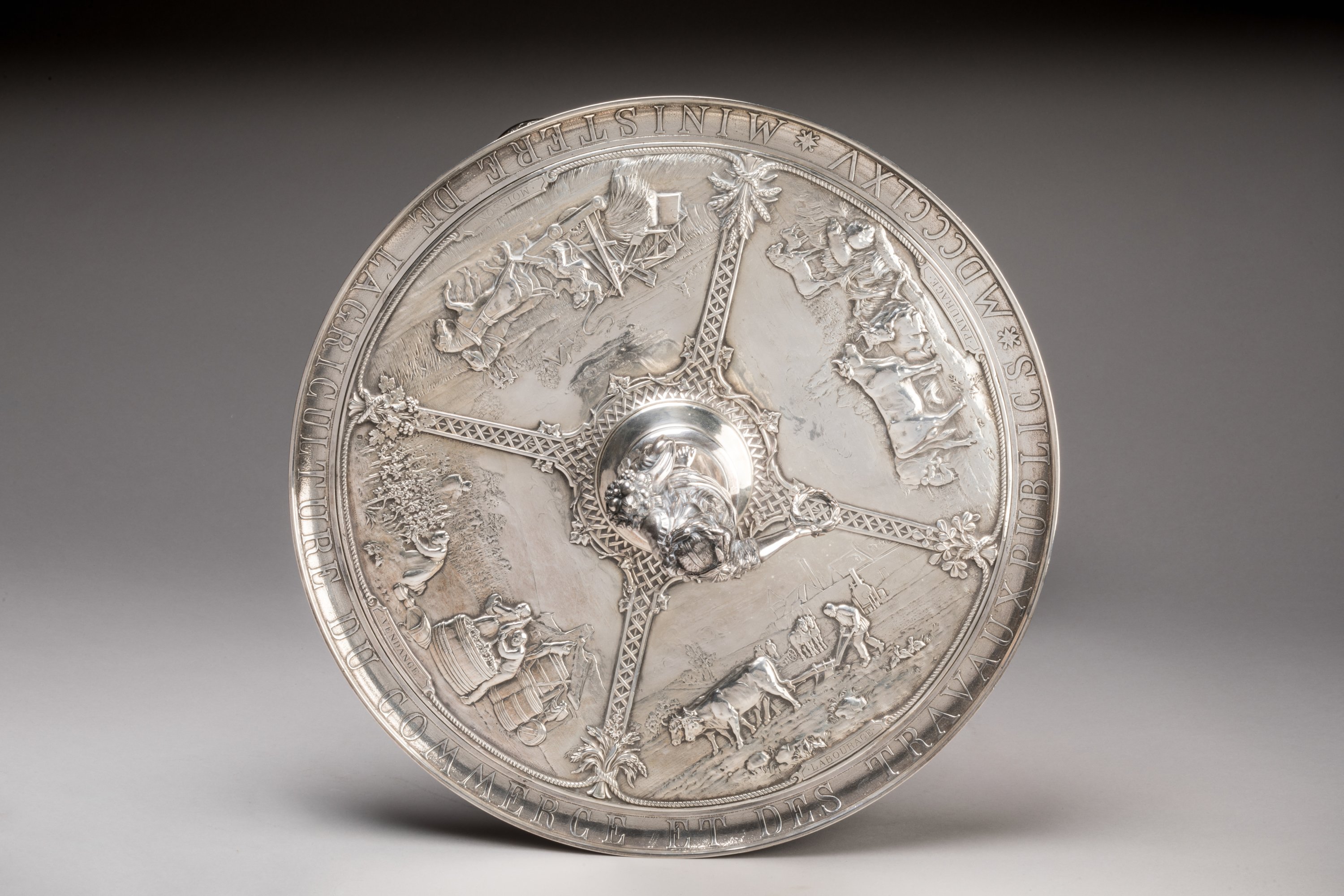 Important Christofle silver prize cup with allegorical decoration of grazing, harvesting, yielding and ploughing.