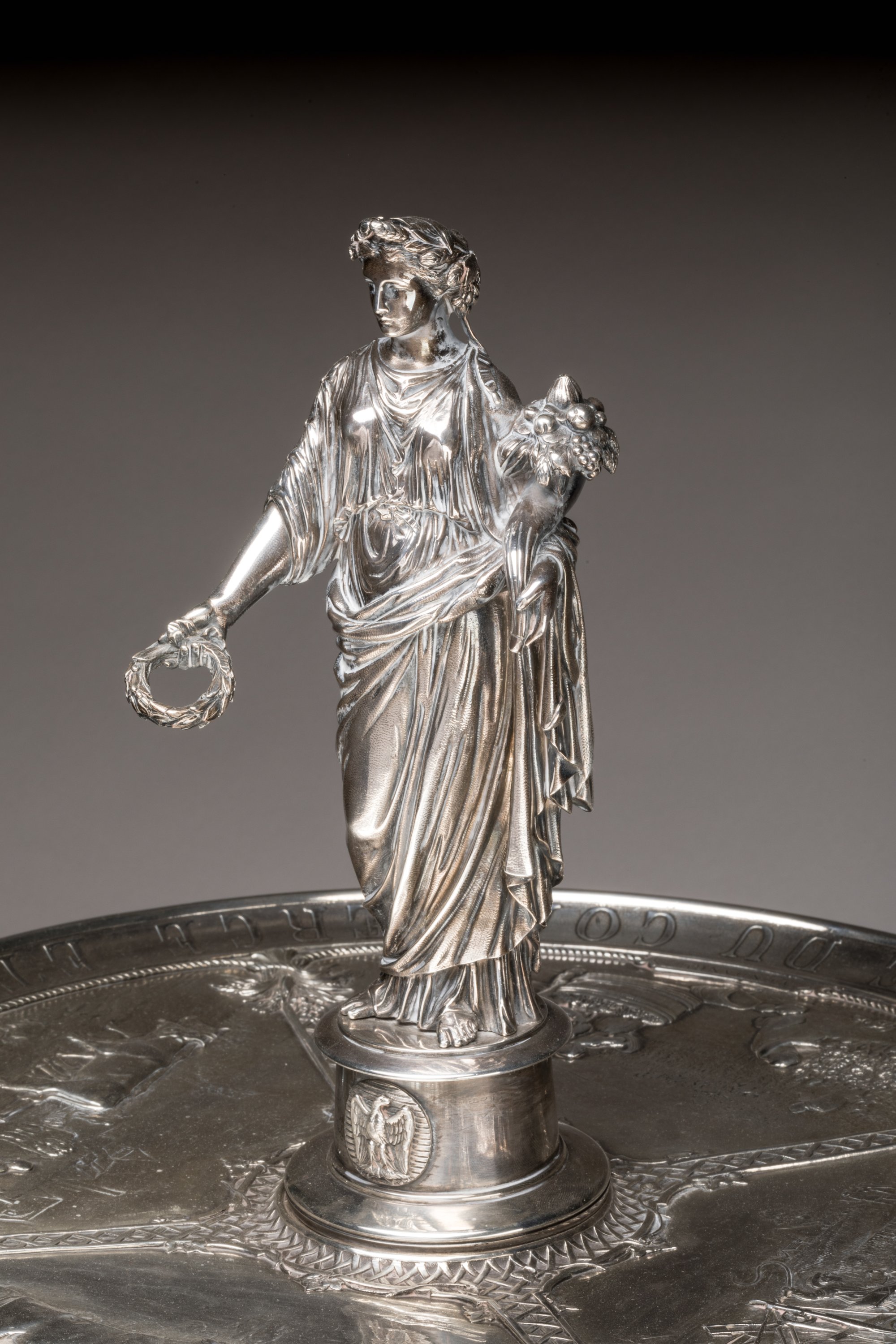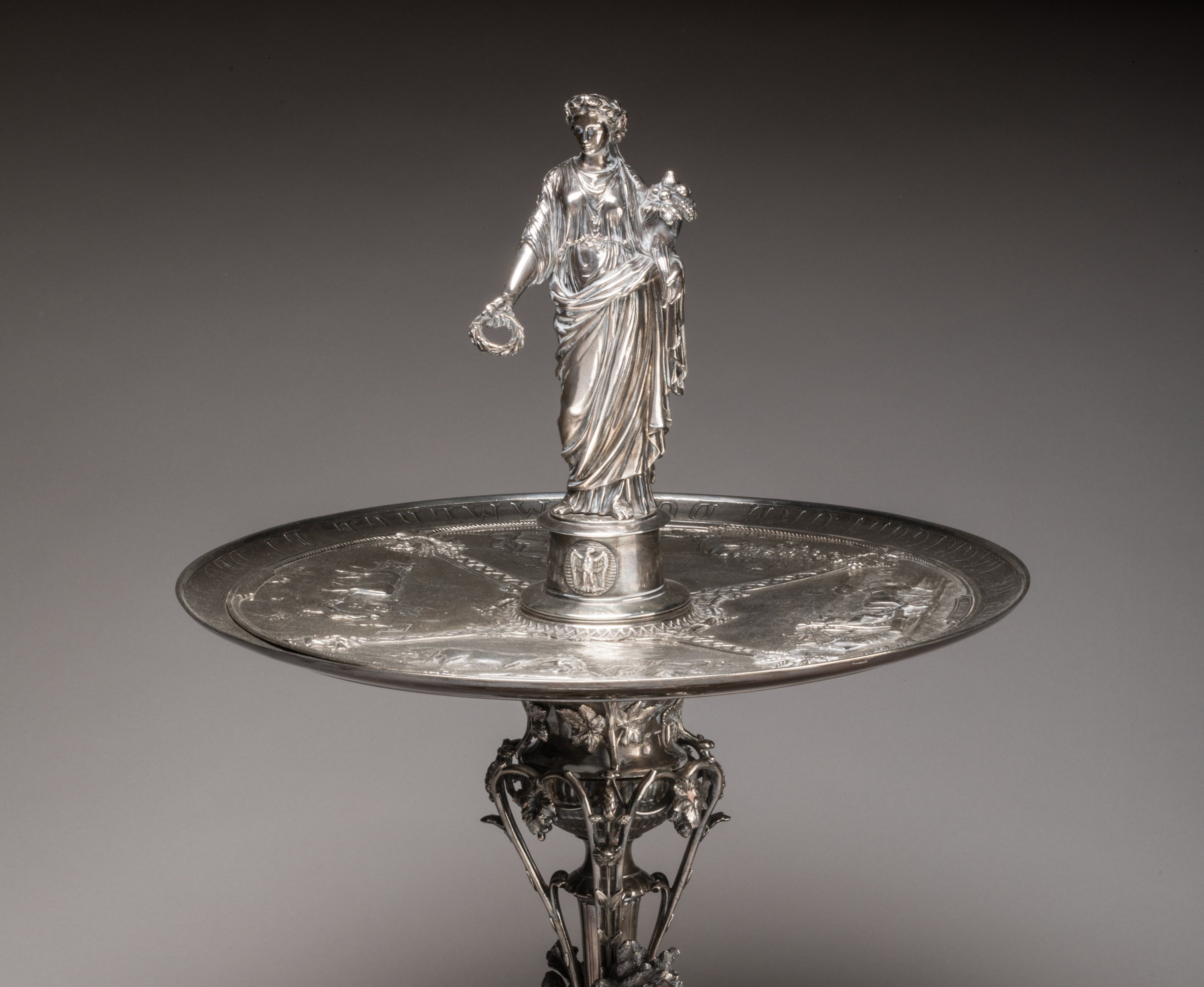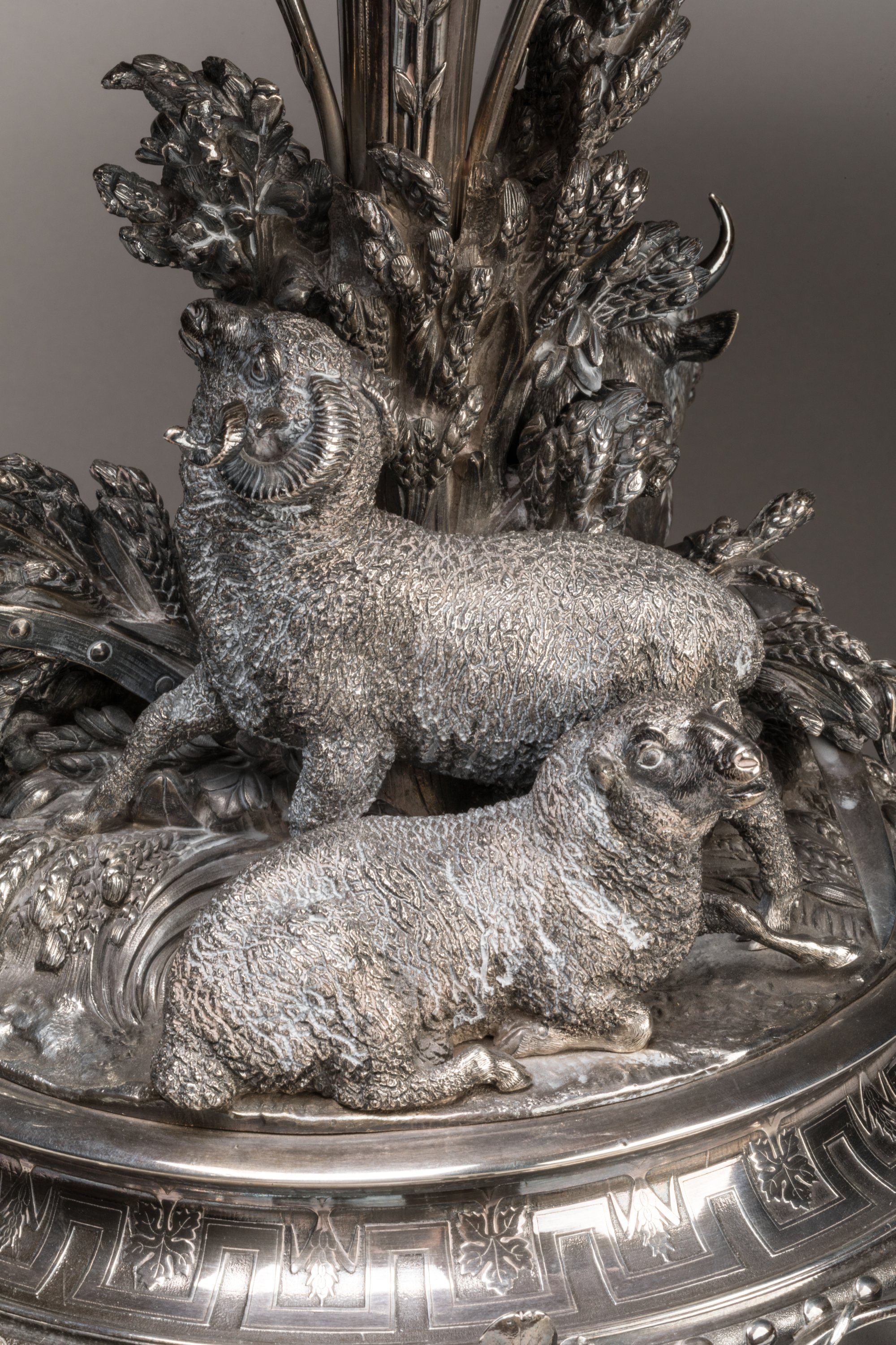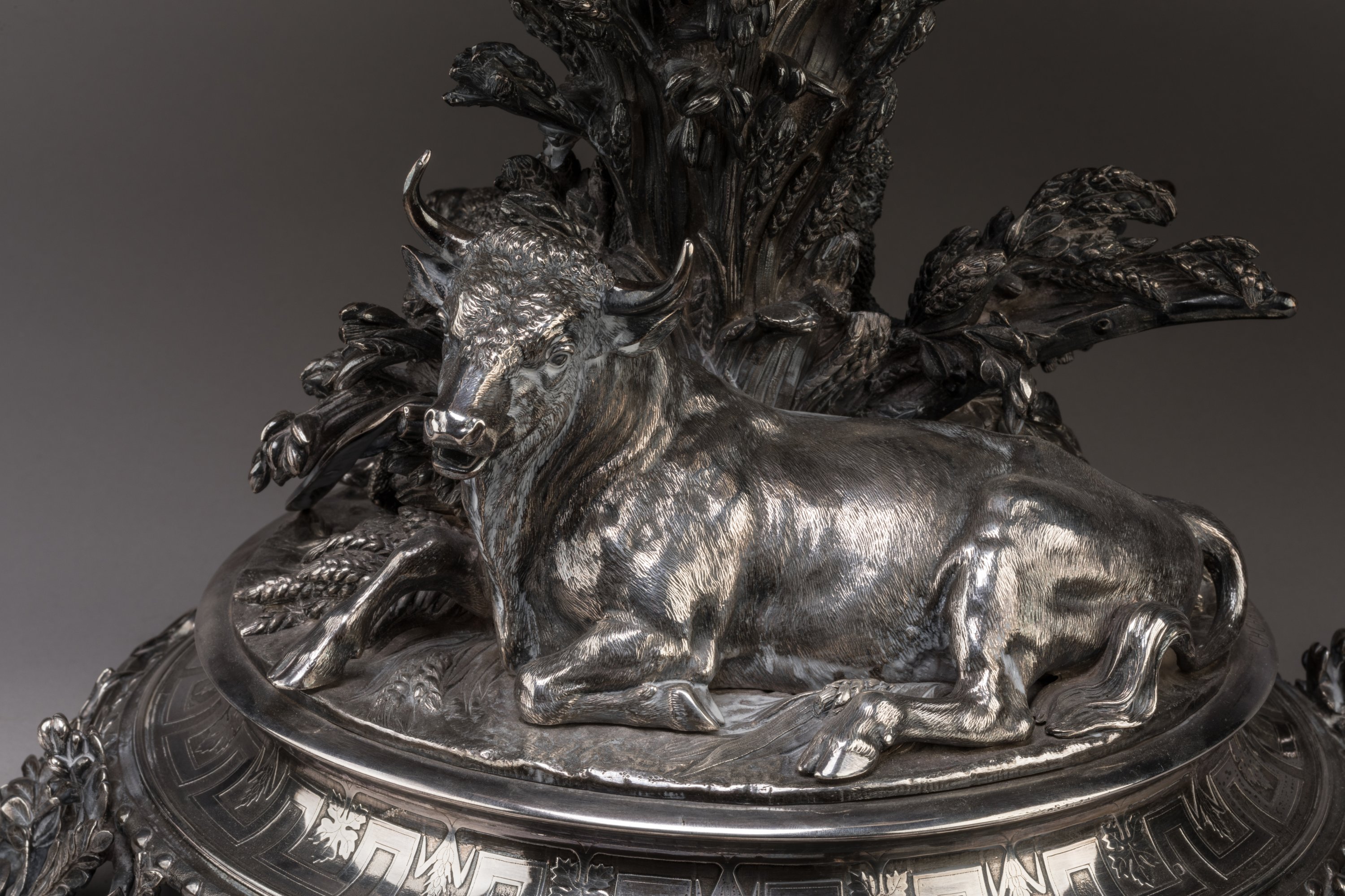 Important Christofle silver prize cup with allegorical decoration of grazing, harvesting, yielding and ploughing.