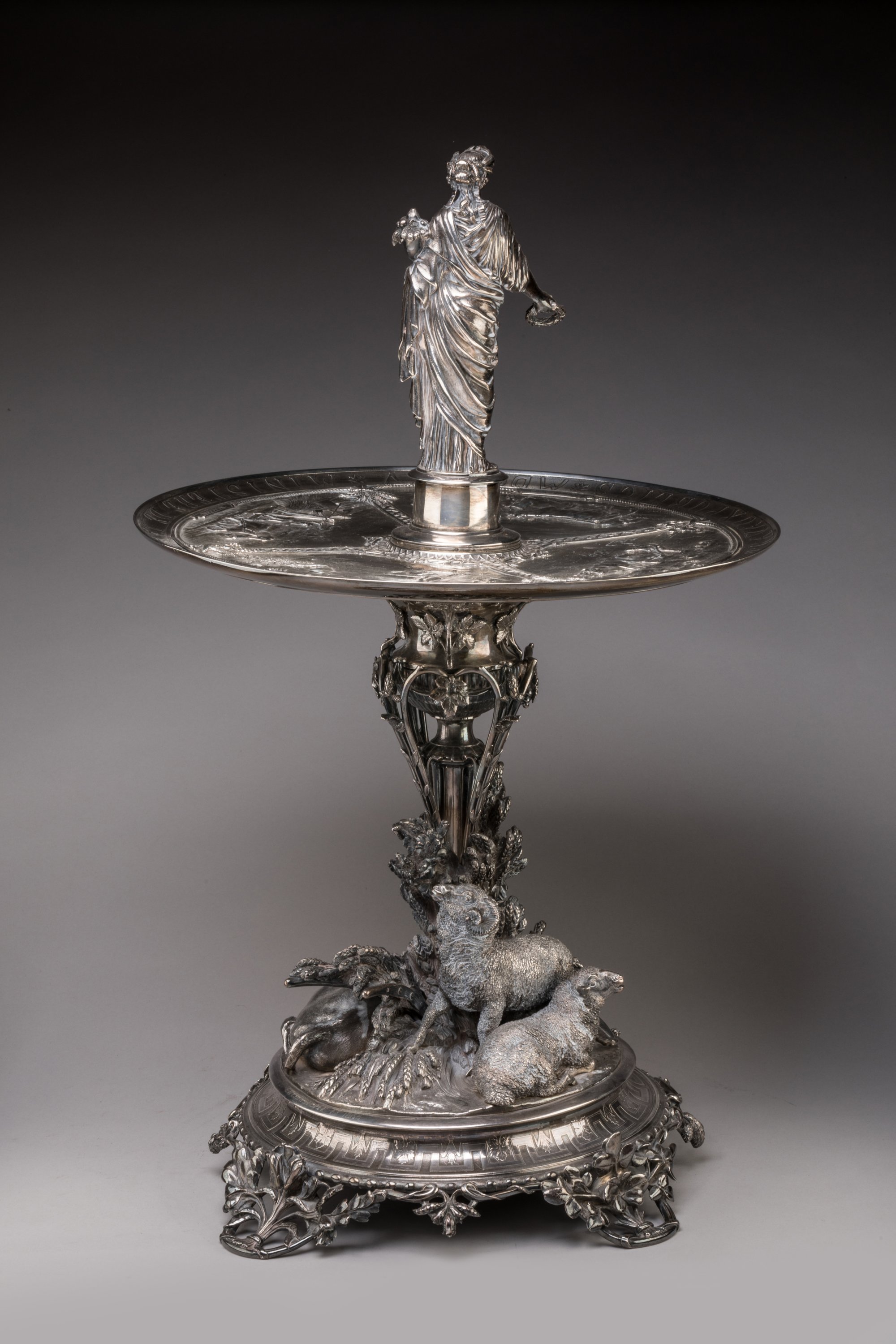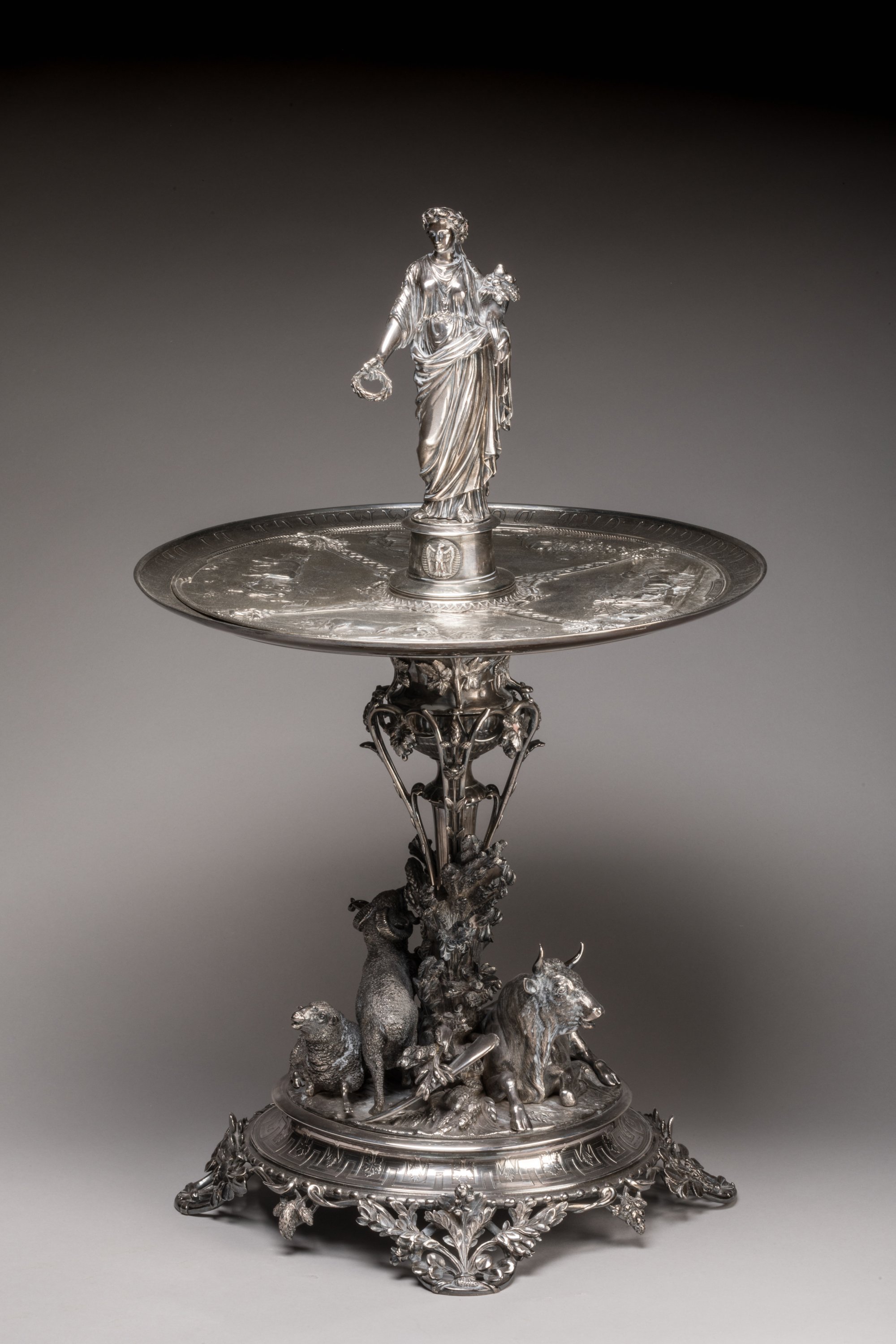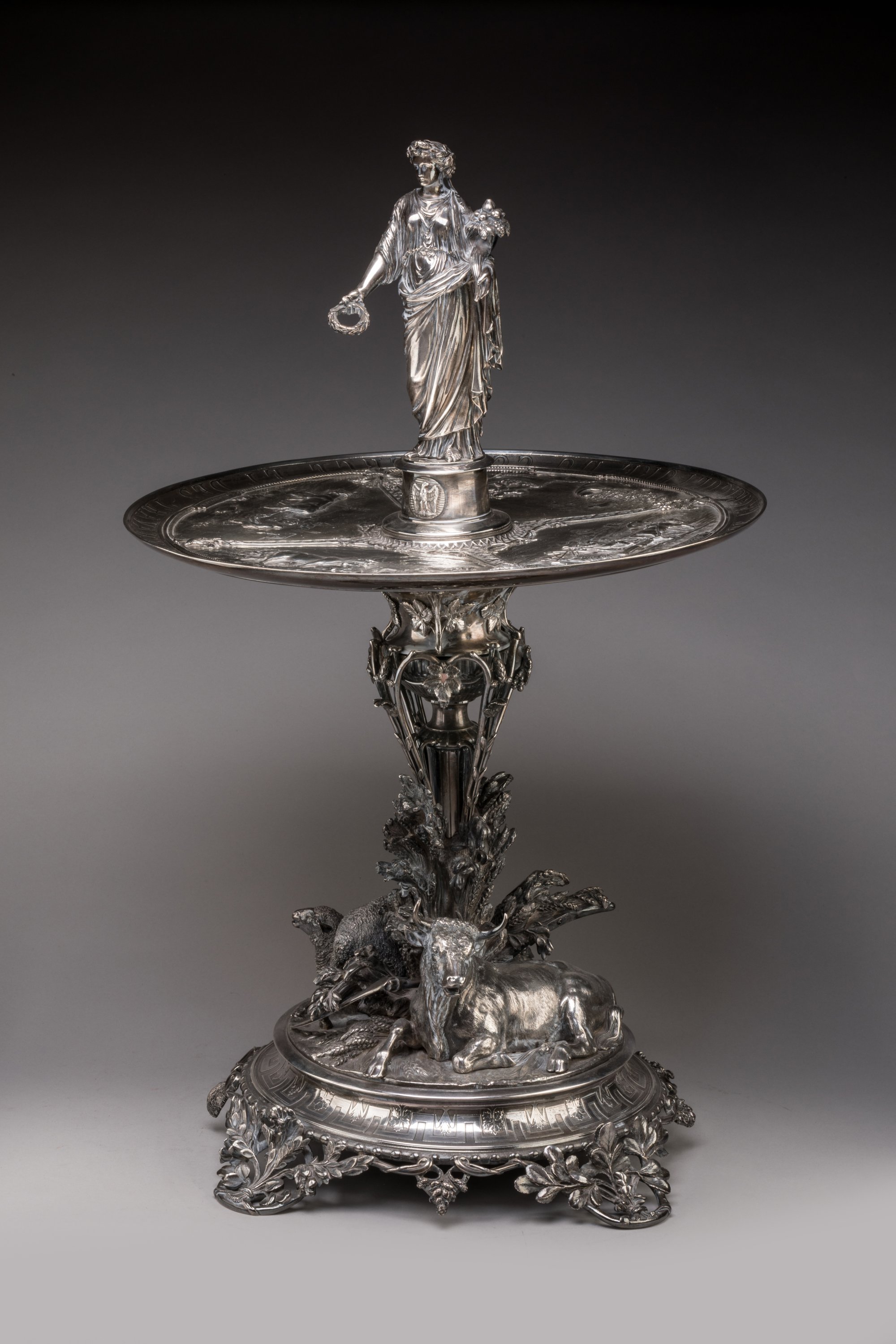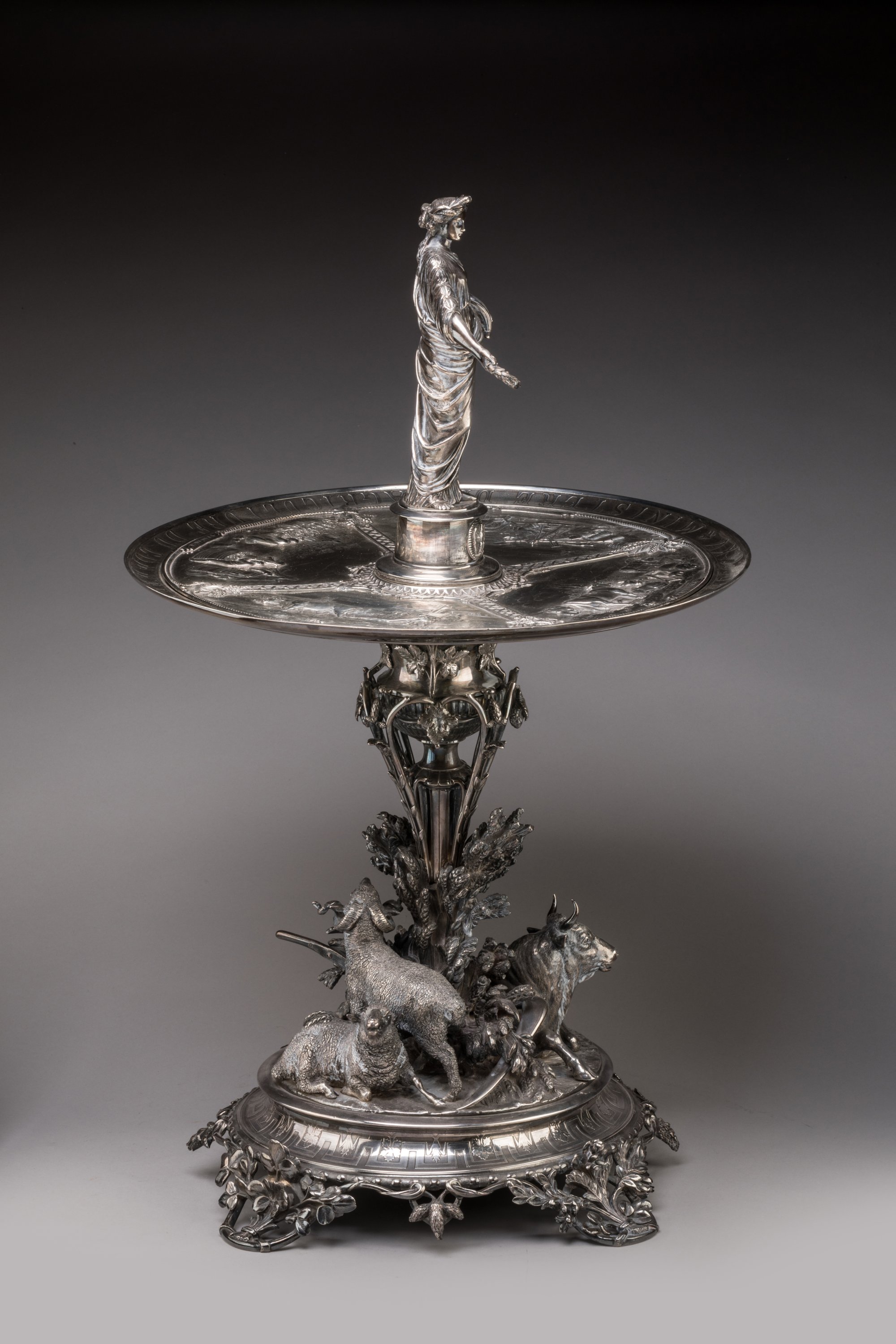 Le modèle de notre trophée est présenté pour la première fois à l'Exposition universelle de Londres de 1862. Outre Charles Christofle, qui obtient à l'occasion de cette manifestation une nouvelle distinction, les sculpteurs Eugène Capy et Pierre-Louis Rouillard collaborent à la réalisation de cette importante pièce d'orfèvrerie. Le premier livre le modèle de Cérès, tandis que le second s'investit dans la réalisation des animaux et vraisemblablement des bas-reliefs. Il semble cependant que le prototype de cette pièce ait été conçu au moins un an auparavant, comme le laisse suggérer les recueils photographiques des pièces d'orfèvreries de la maison Christofle (archives Christofle). Au Salon de 1861, Charles Christofle expose effectivement une " coupe or et argent " qui est donnée par le Ministère de l'Agriculture aux concours régionaux de la même année. Comme pour notre trophée, Eugène Capy participe à ce projet. En revanche, le sculpteur Auguste Madroux qui prête son concours au prototype, est remplacé par Pierre-Louis Rouillard.