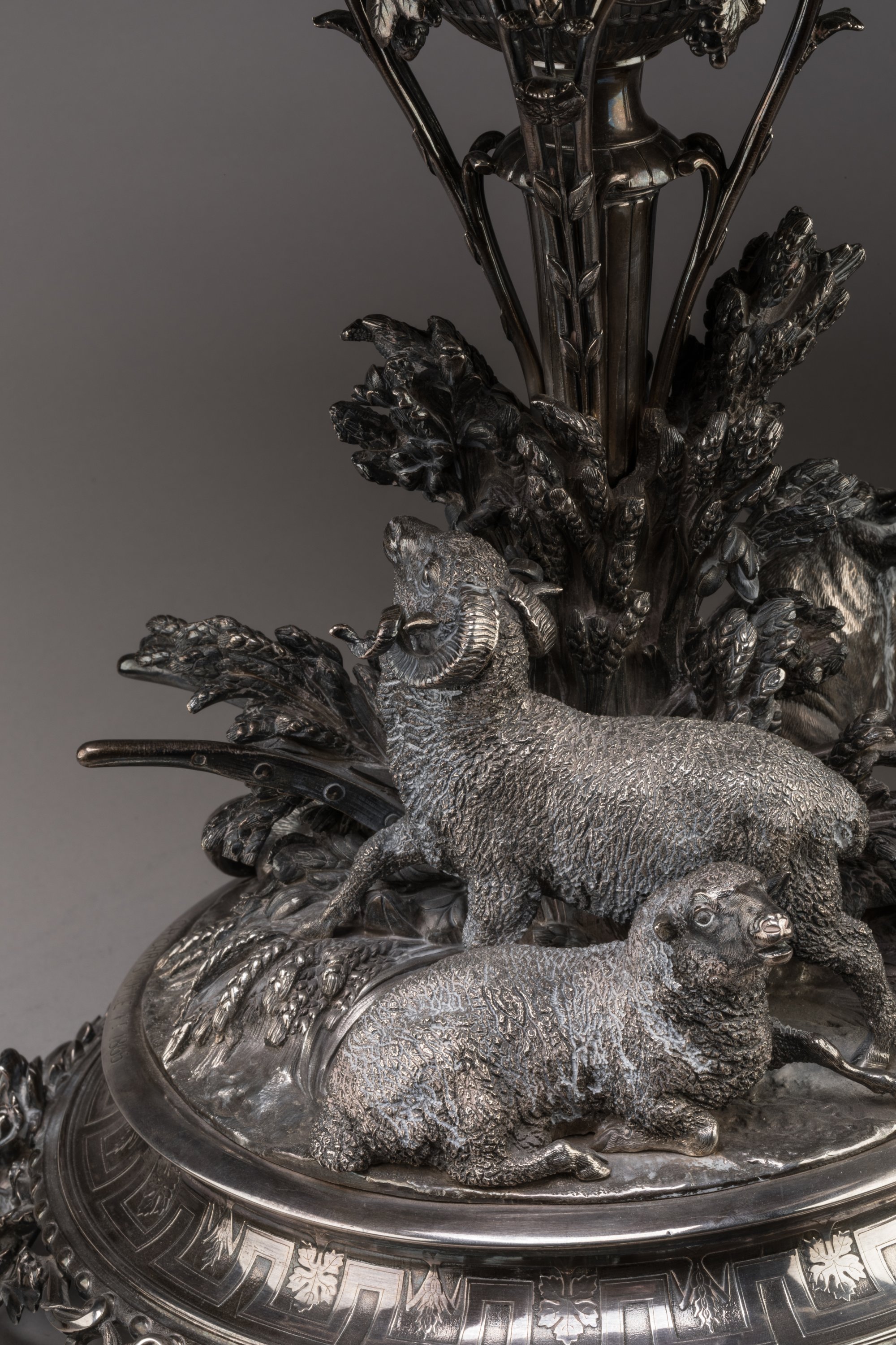 La base circulaire à aile concave moulurée d'oves et au décor crénelé alternant épis de blé et feuilles de vigne, pose sur quatre pieds ajourés de gerbes de feuillages de plantes fourragères: trèfle, lotier, sainfoin, luzerne. Un buf, un bélier, une brebis, une faucille et des gerbes de plantes fourragères y sont représentés en ronde-bosse.