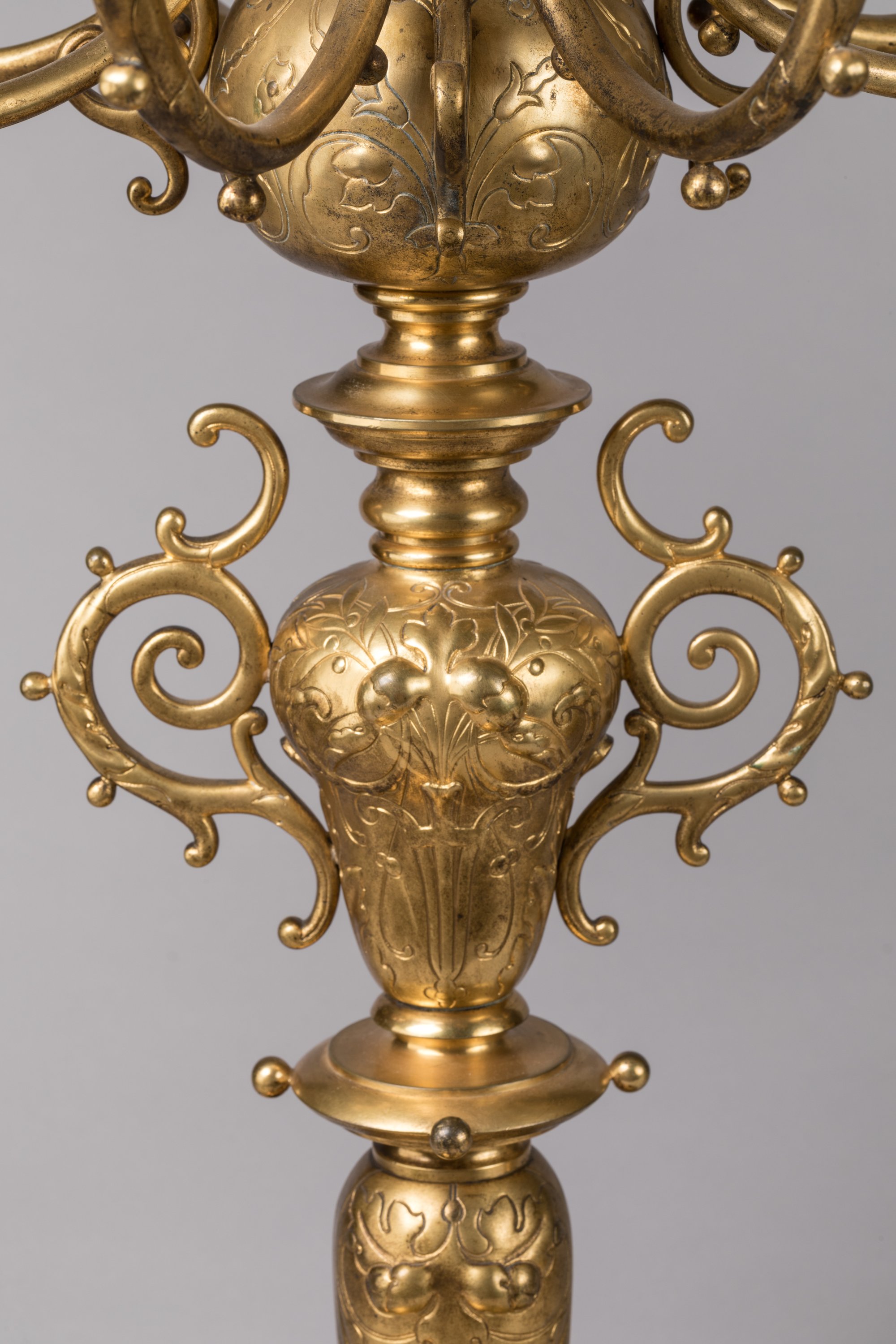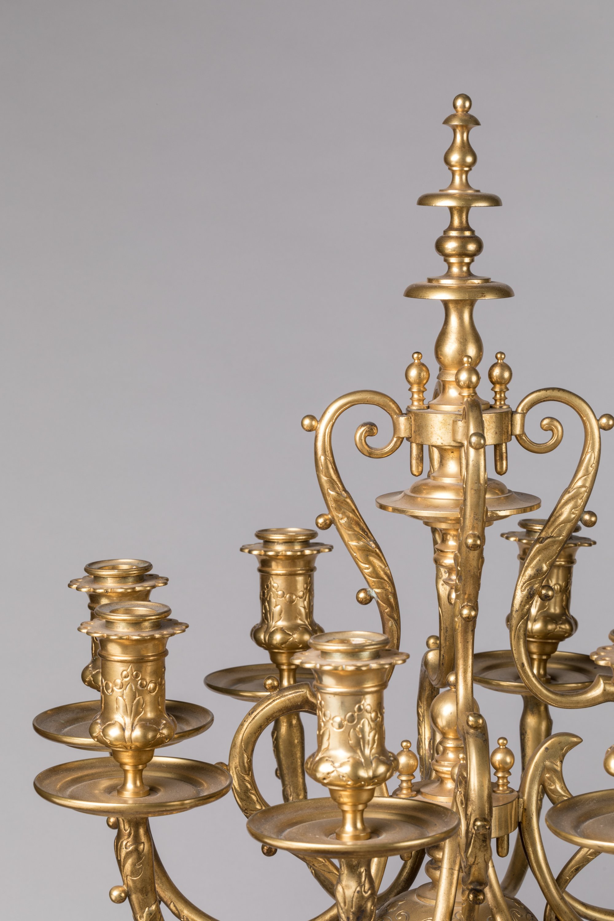 en bronze doré et ciselé à huit bras de lumière, coiffés d'une toupie supportée par quatre consoles à décor de feuilles d'acanthe et petites boules en relief, les bobèches à décor de feuillage surmonté d'une guirlande circulaire. Le fût orné de motifs de rinceaux, feuilles d'acanthe et bouquets de fleurs inscrits dans des vases présente deux anses stylisées. La base circulaire ornée de rinceaux. Dix-sept coupelles en verre.