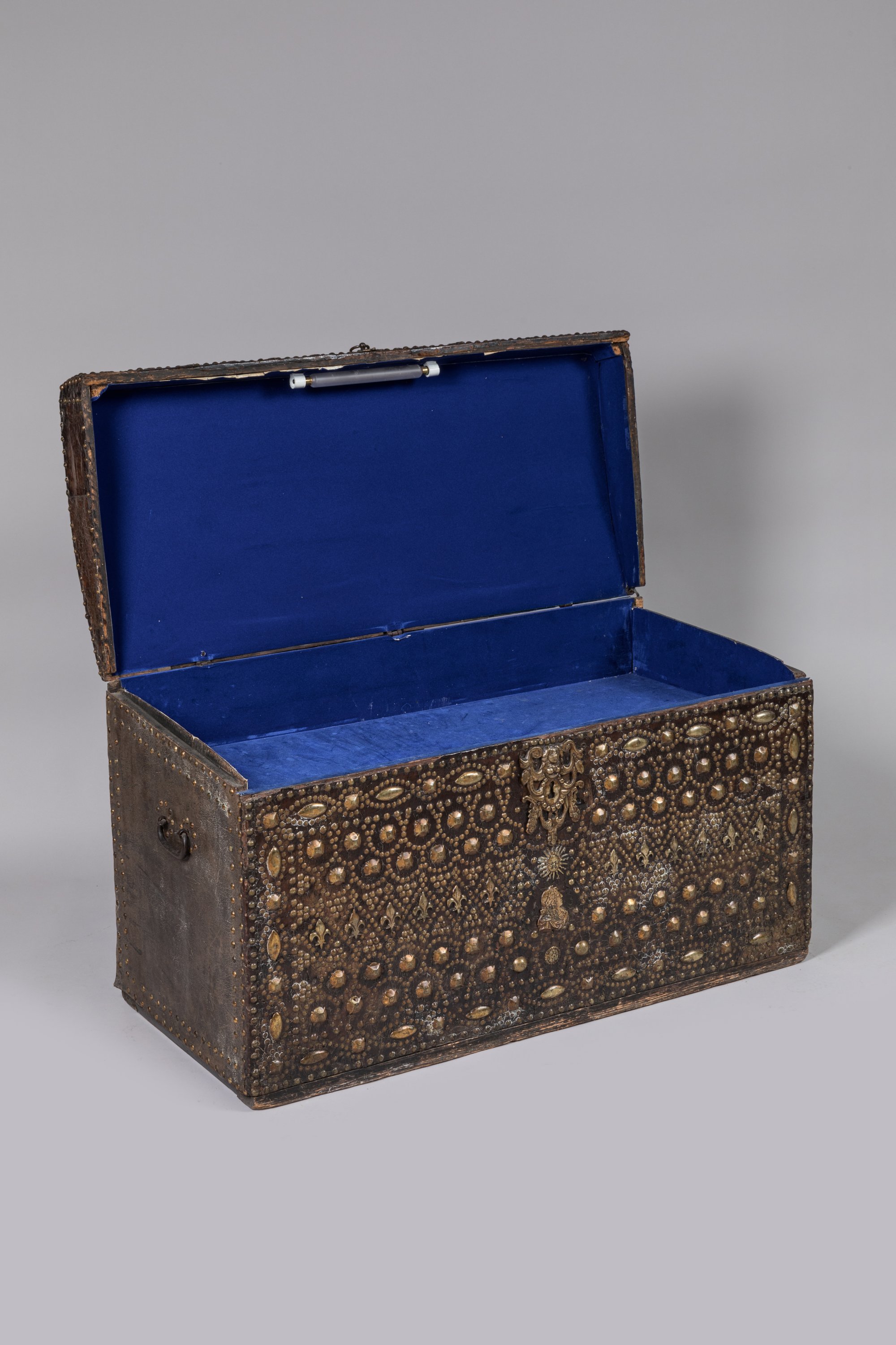 Sur une âme en bois gainé d'un cuir, prend place un décor cloué en laiton et bronze de rangs de fleurs de lys, cabochons et de motifs géométriques. Prise annulaire aux bustes de femmes accolés et entrée de serrure figurant un grotesque, surmontant l'astre solaire et le profil de Louis XIV. Poignées latérales en fer forgé.