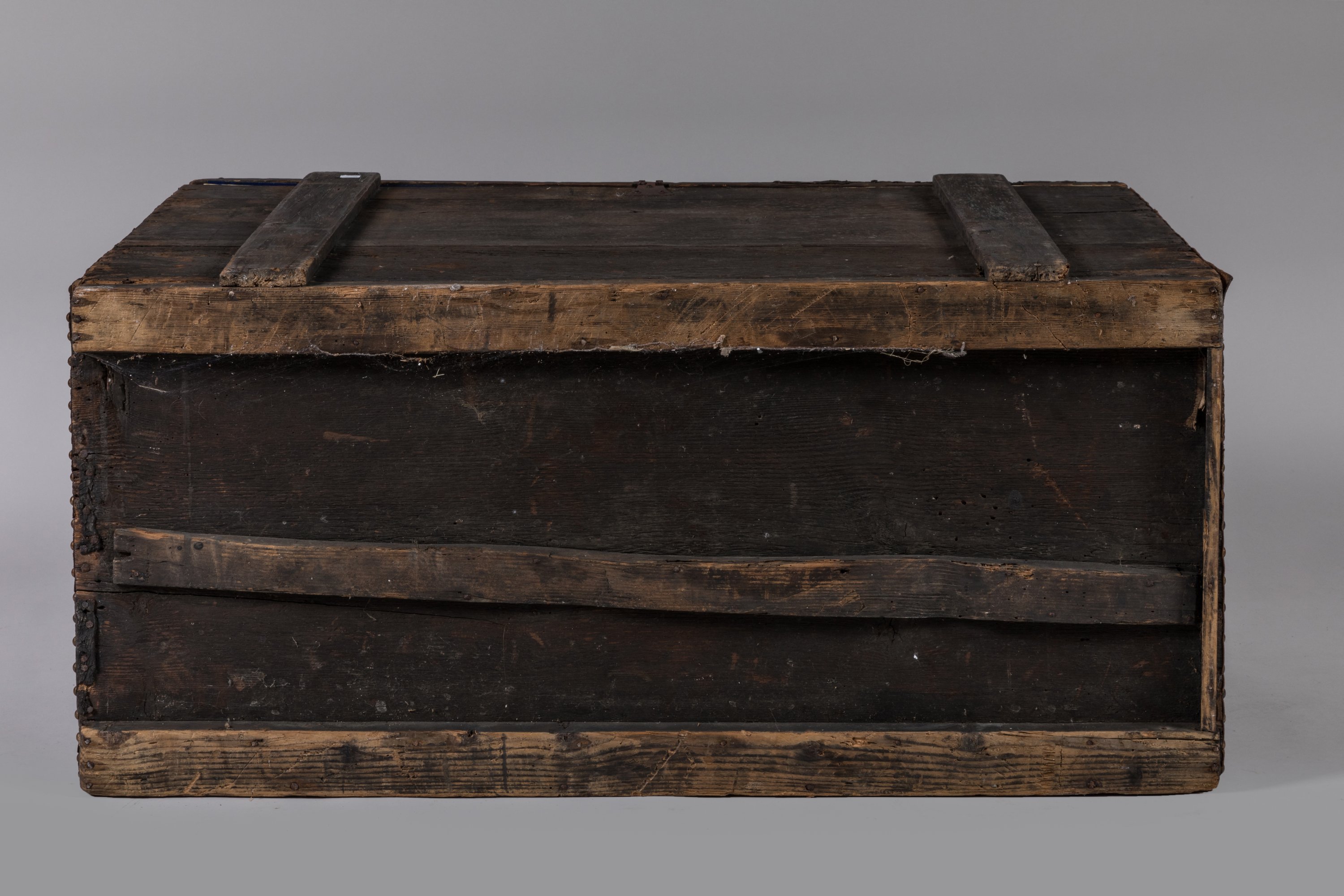 Compte tenu des nombreux emblèmes propres au Roi (fleurs de lys, effigie du Roi, l’emblème du soleil et la richesse des motifs géométriques) cette malle a pu être utilisée par Louis XIV.