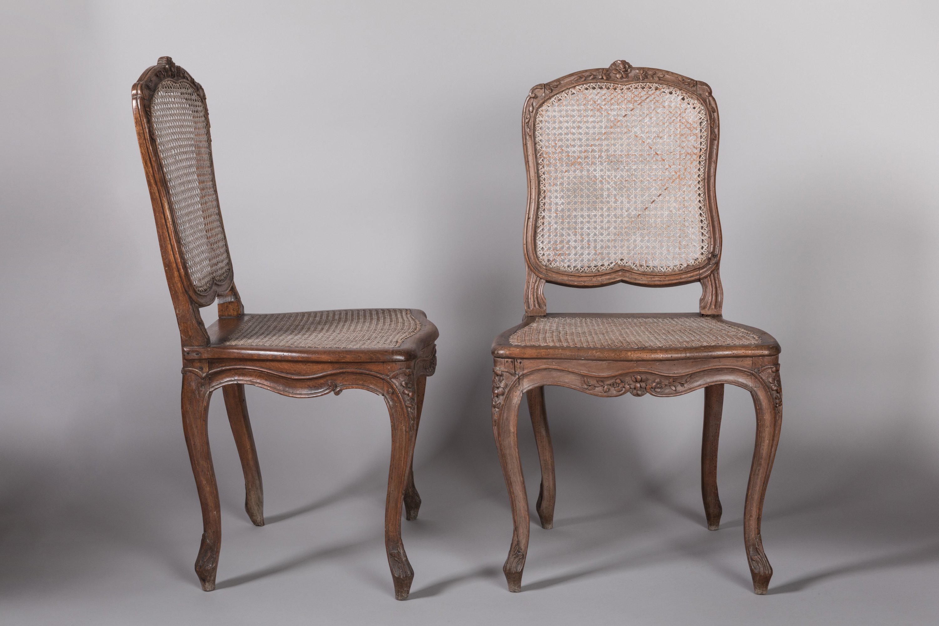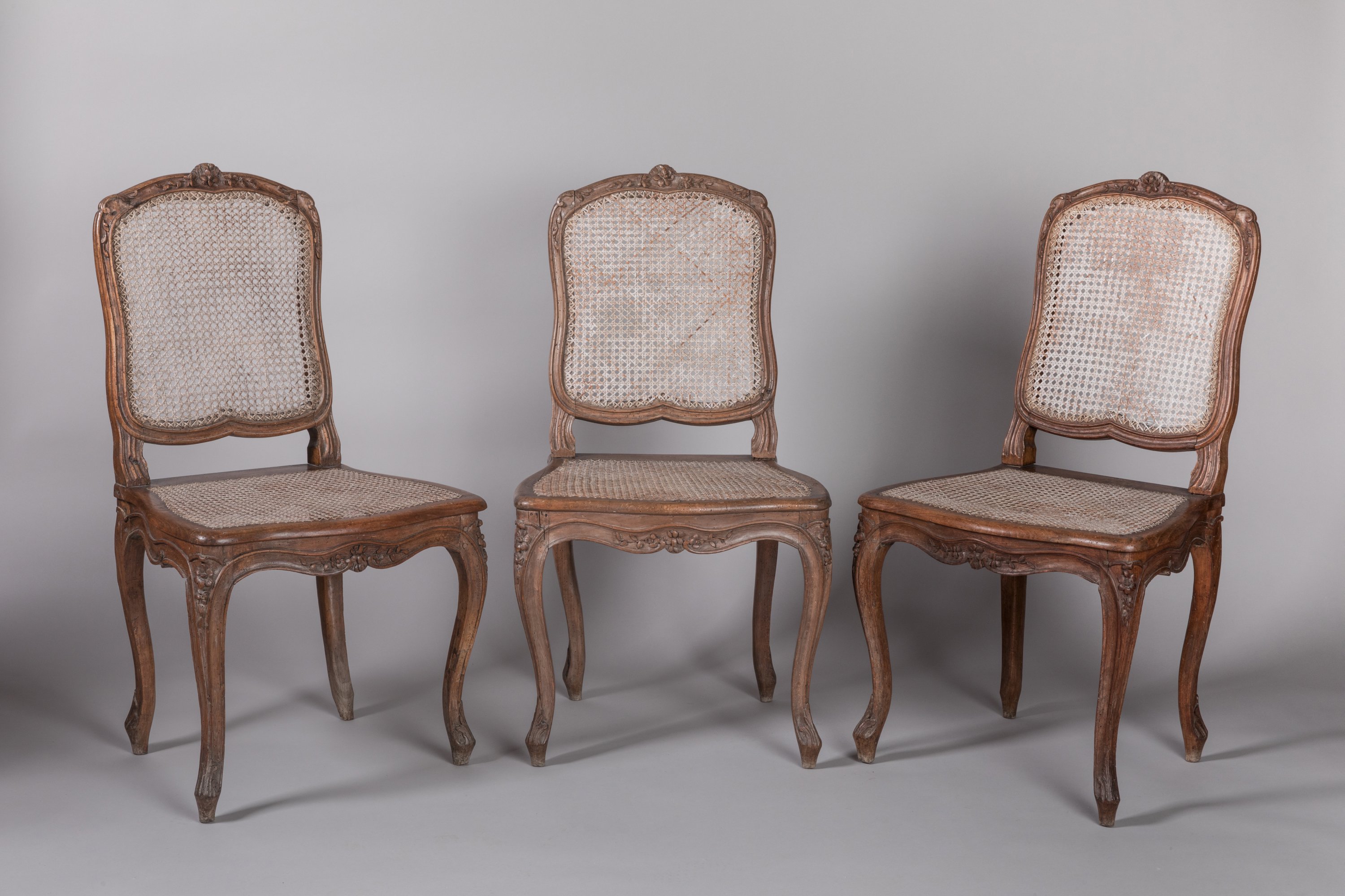Three moulded beech caned chairs stamped by Tillard in the 18th century.