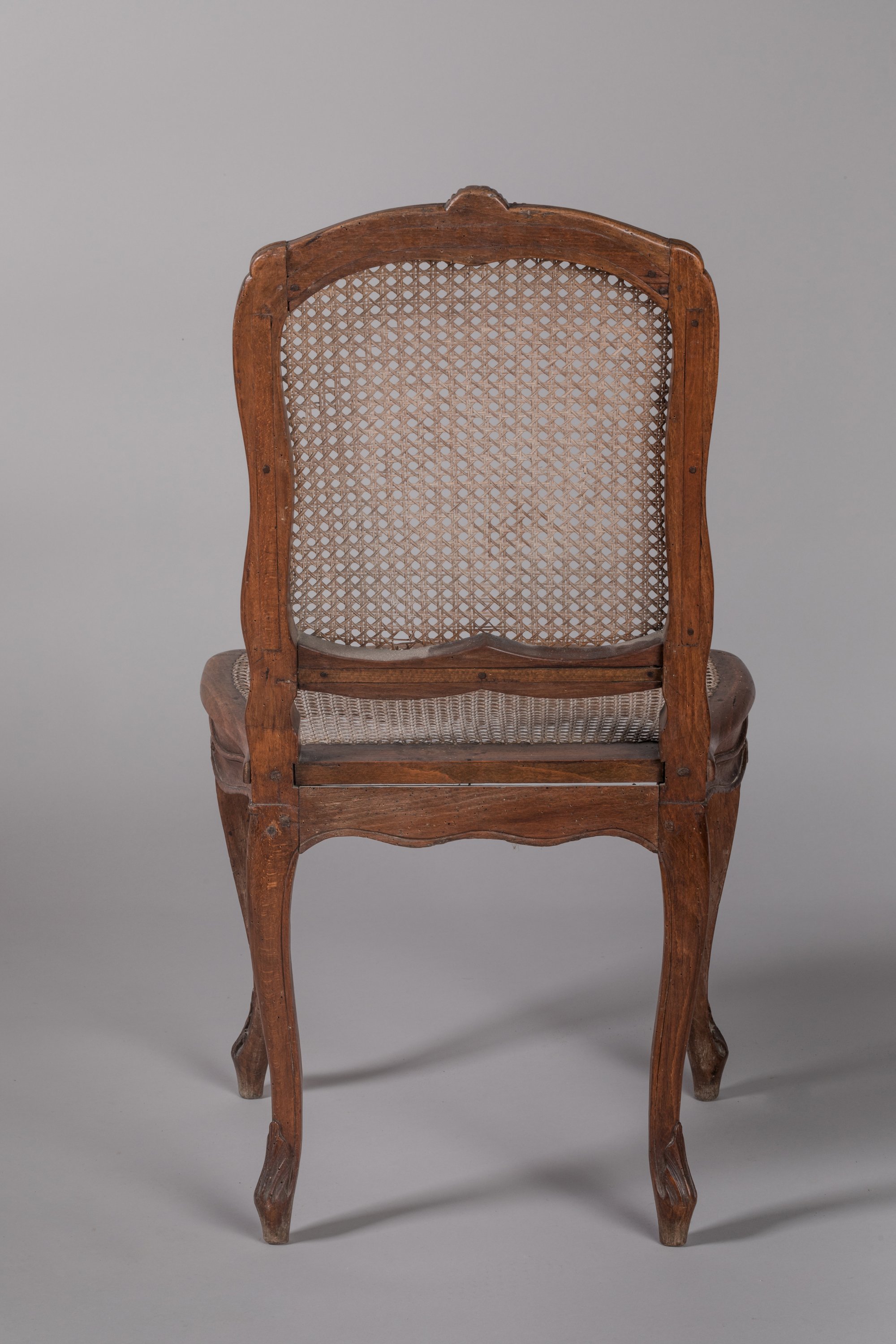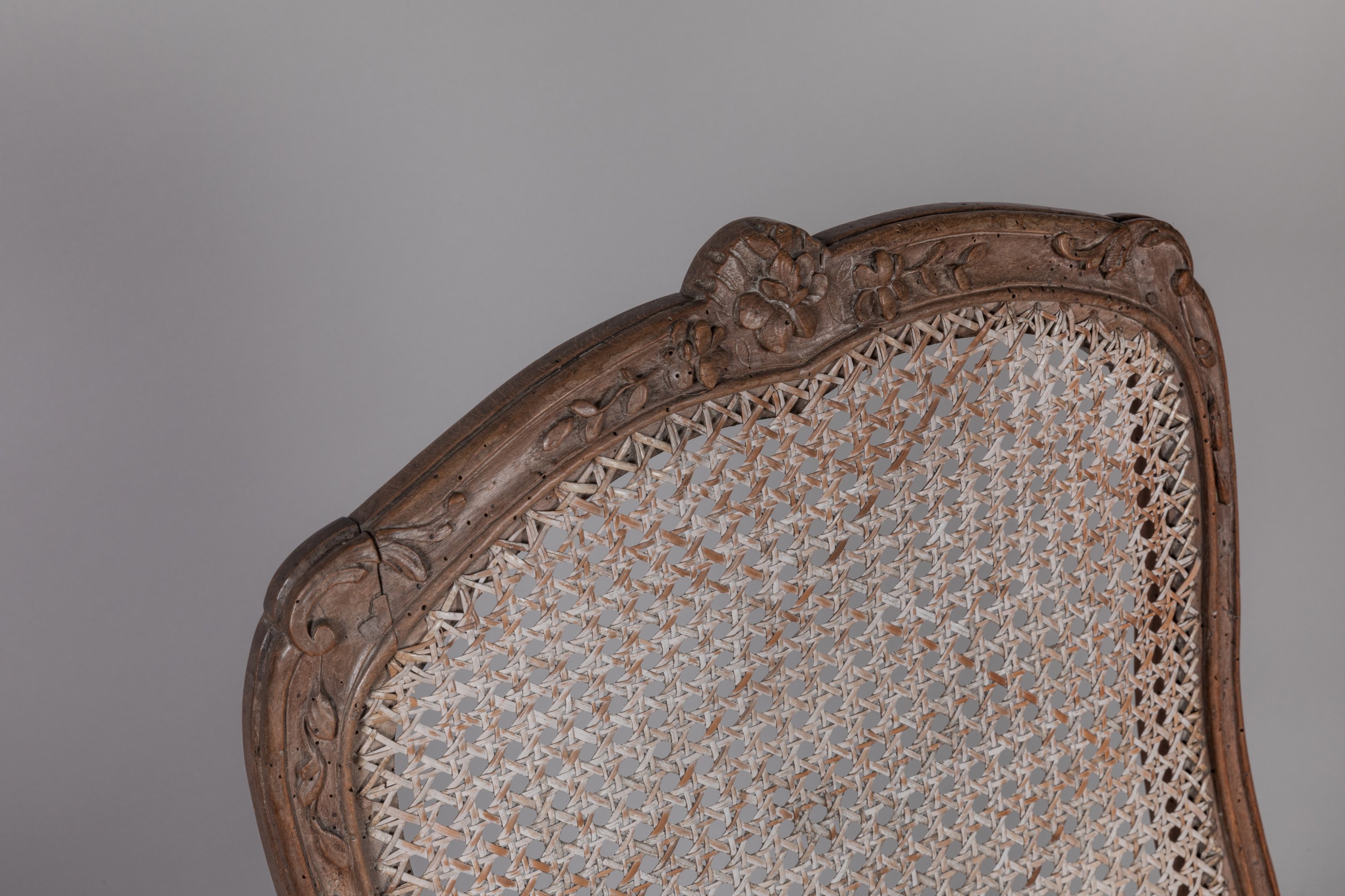 en hêtre mouluré et sculpté, le dossier de forme violonée décoré à l'amortissement de fleurettes entourées de guirlandes feuillagées, l'épaulement orné de rinceaux d'acanthe. La ceinture chantournée présentant au centre des fleurettes parées sur chacun des côtés de guirlandes végétales. Quatre pieds cambrés en console ornés en partie supérieure de fleurettes et se terminant par des feuilles d'acanthe.