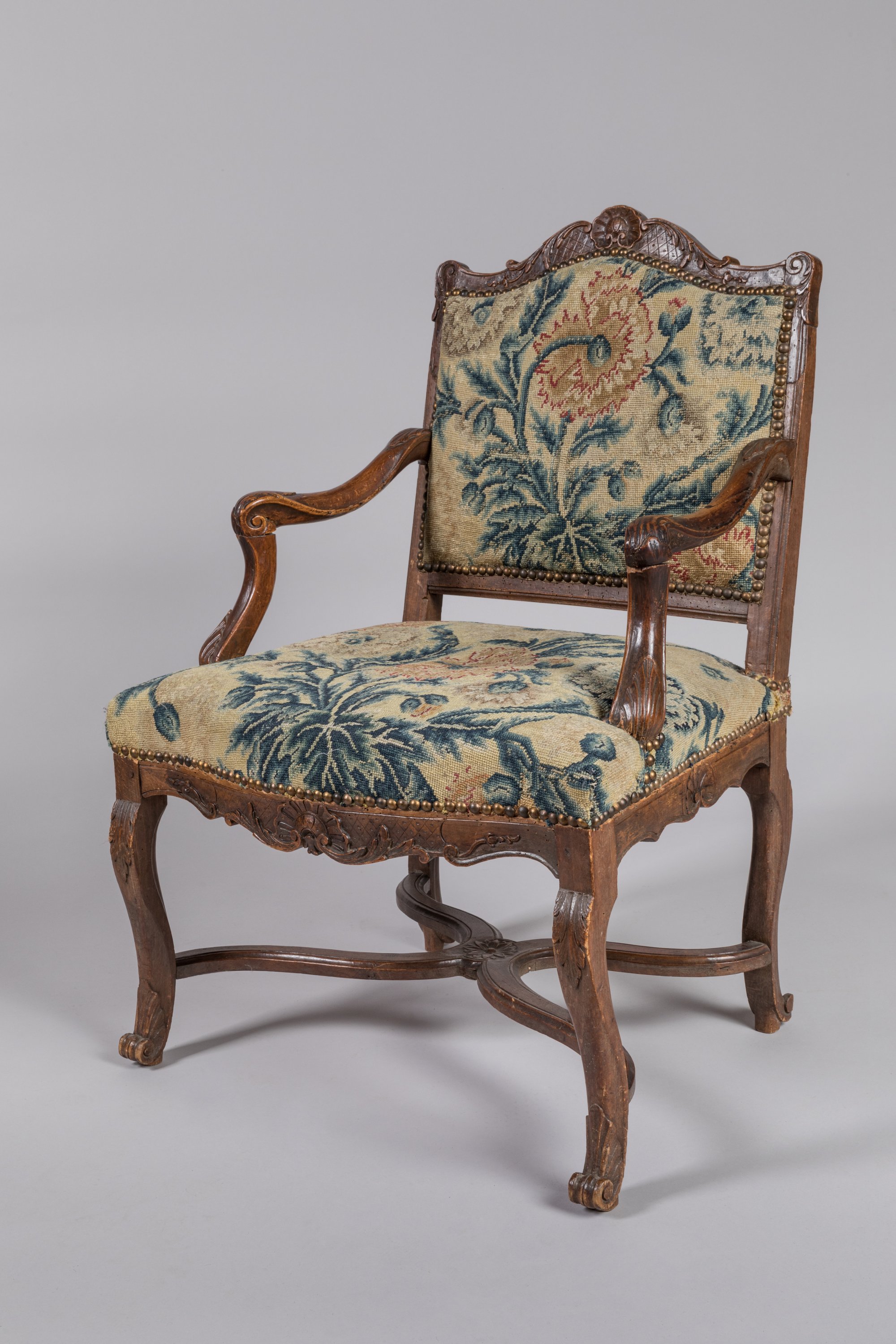en noyer mouluré et sculpté, le dossier décoré à l'amortissement d'une coquille entourée de deux rinceaux surmontant un motif losangé, l'épaulement à enroulement végétal, les accotoirs ornés de feuilles d'acanthe reposant sur des consoles mouvementés à décor feuillagé. La ceinture chantournée présentant au centre une coquille entourée d'une guirlande de feuillage, sur les petits côtés des coquilles. Quatre pieds jarrets se terminant par des enroulements et feuilles d'acanthe et réunis par une entretoise ceint au centre d'une fleur.