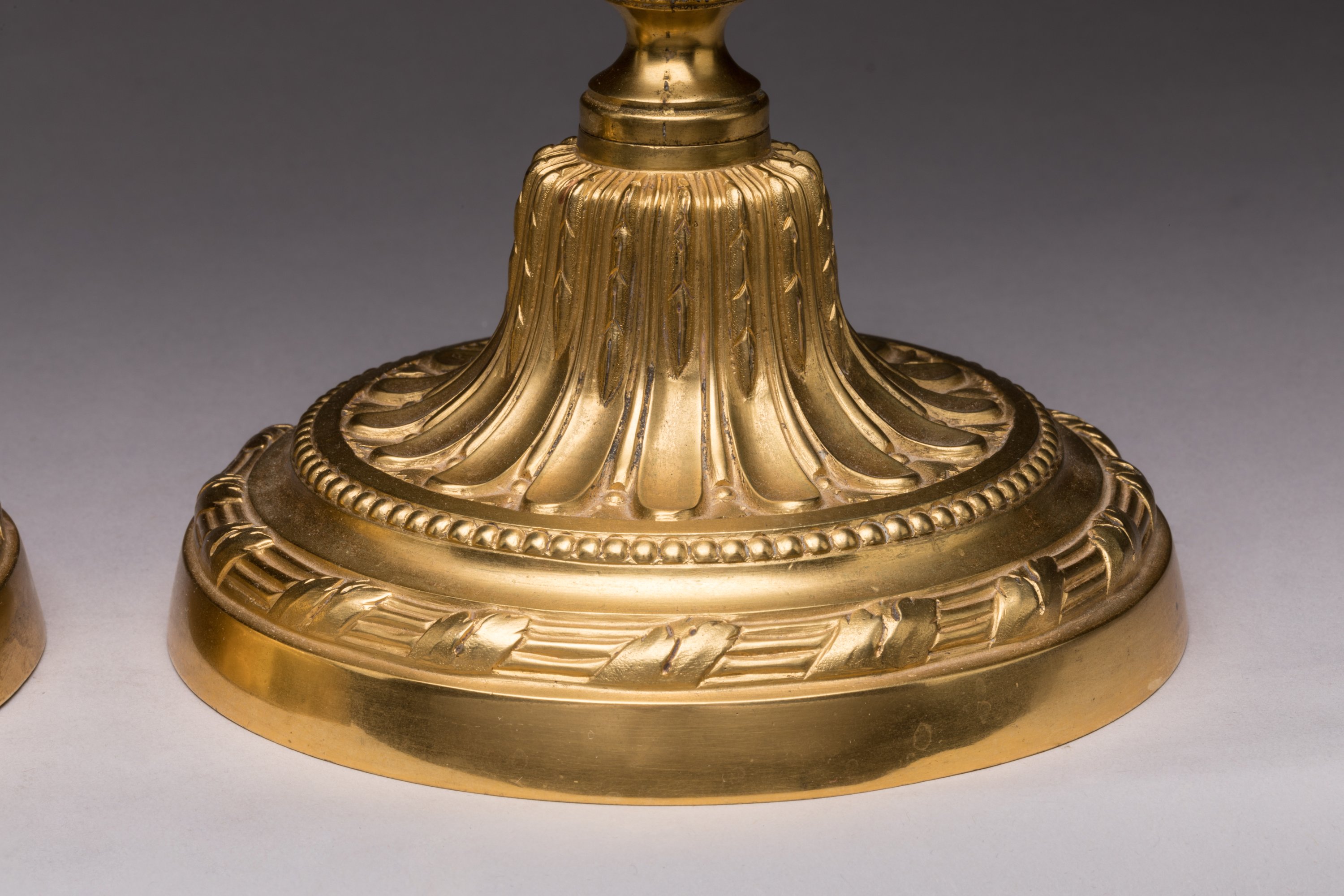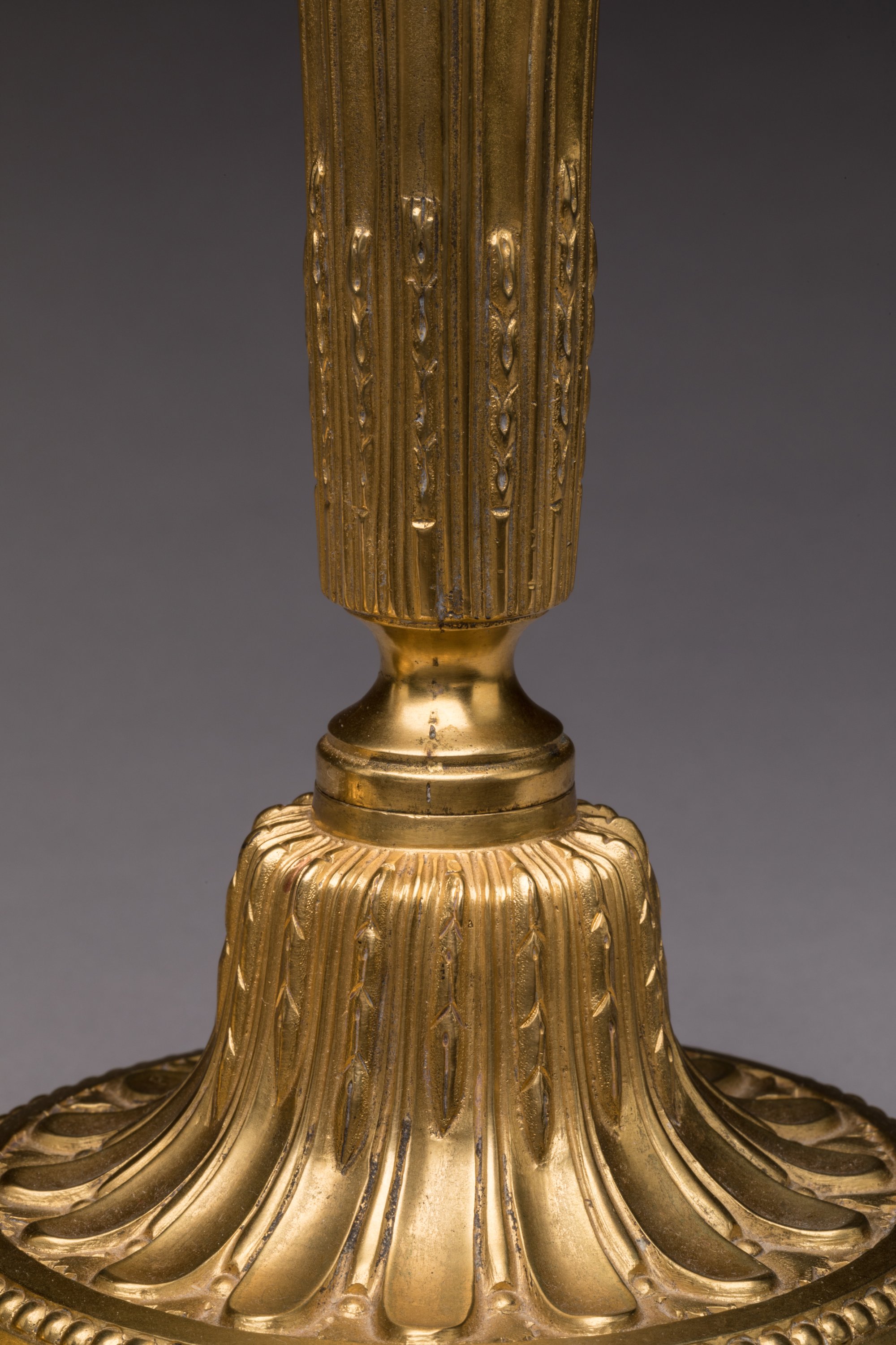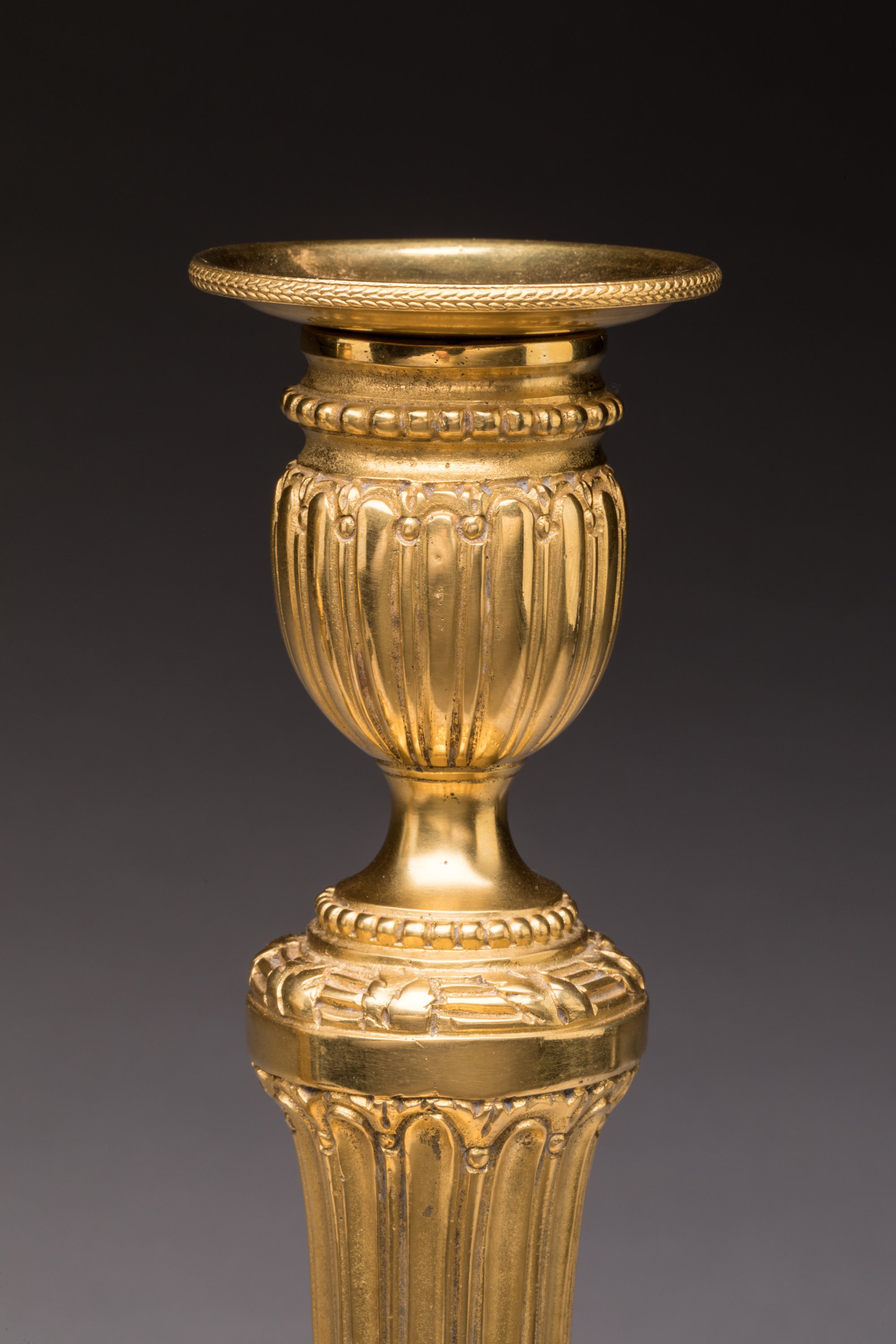en bronze ciselé et doré. Le fût à cannelures rudentées à pointes d’asperge, sur une base au cordon de laurier et frise de perles. Les porte-bobèches façon en vases sur piédouches à frises de perles. Bobèches d'origine. Dorure à l'or moulu.