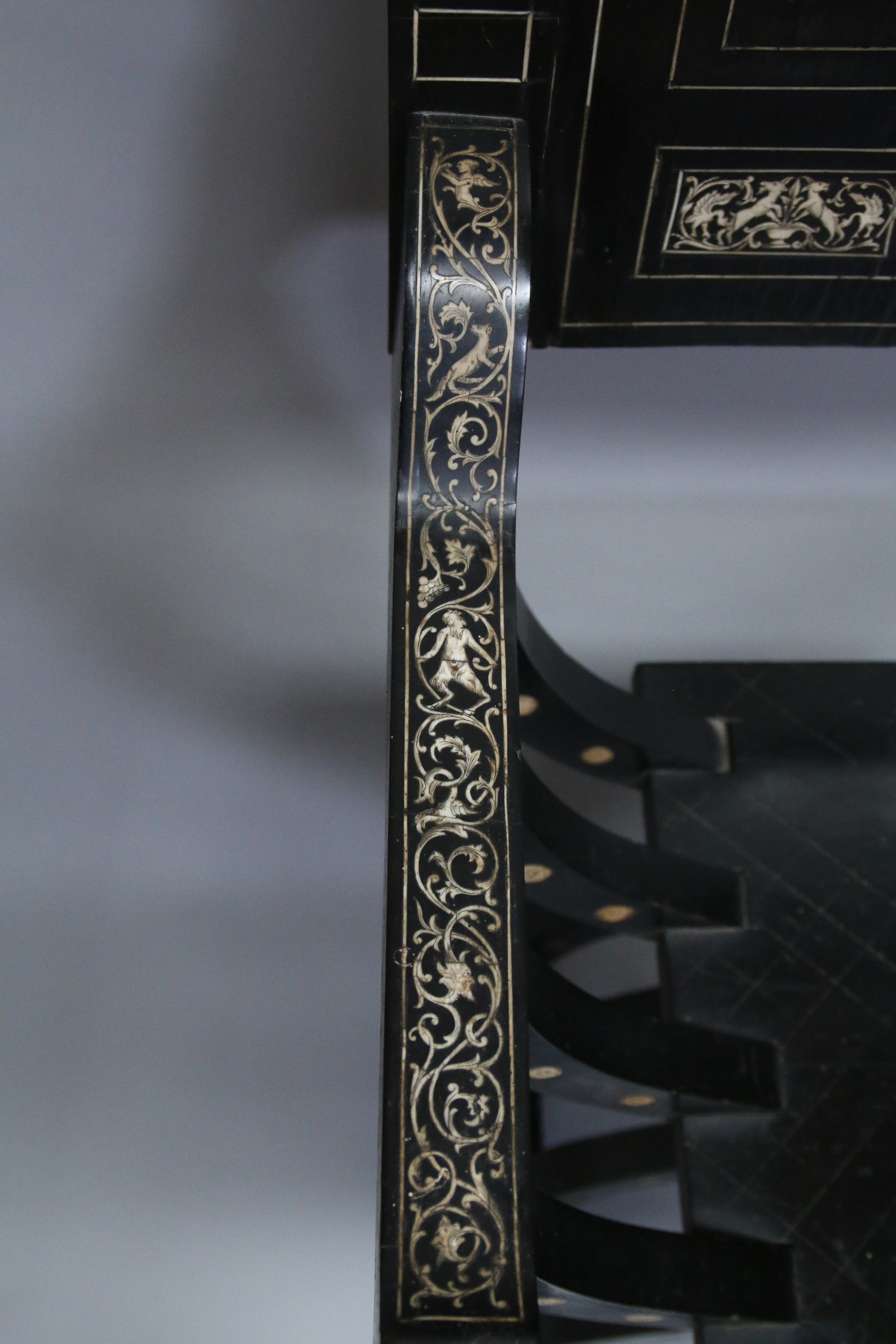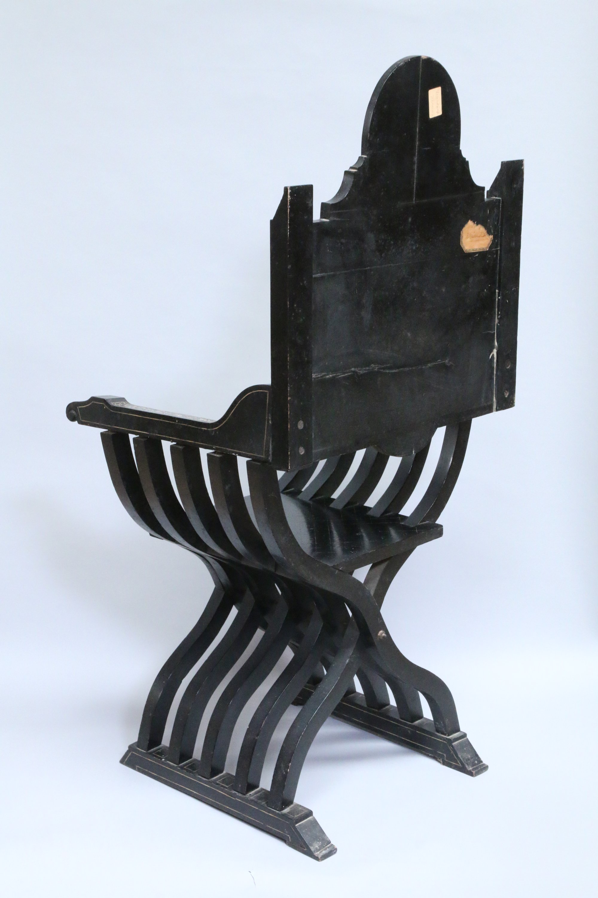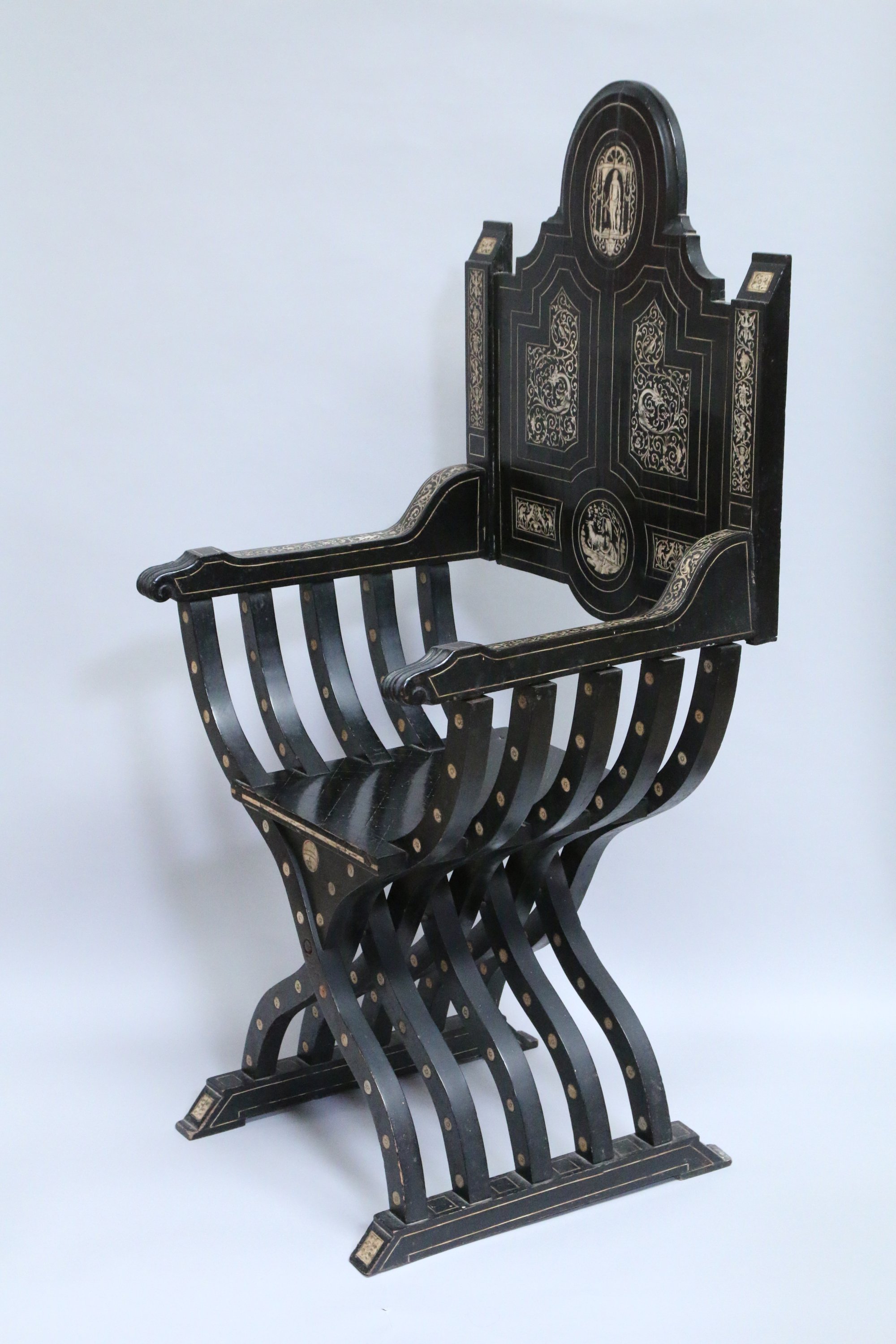 Fauteuil curule en marqueterie d'ivoire et de bois foncé, le dossier droit architecturé orné d'une scène de Bacchante au vase en partie supérieure et d'un Faune trayant un bouc en partie basse. L'ensemble est orné de décors de grotesques, rinceaux, chimères et mascarons.