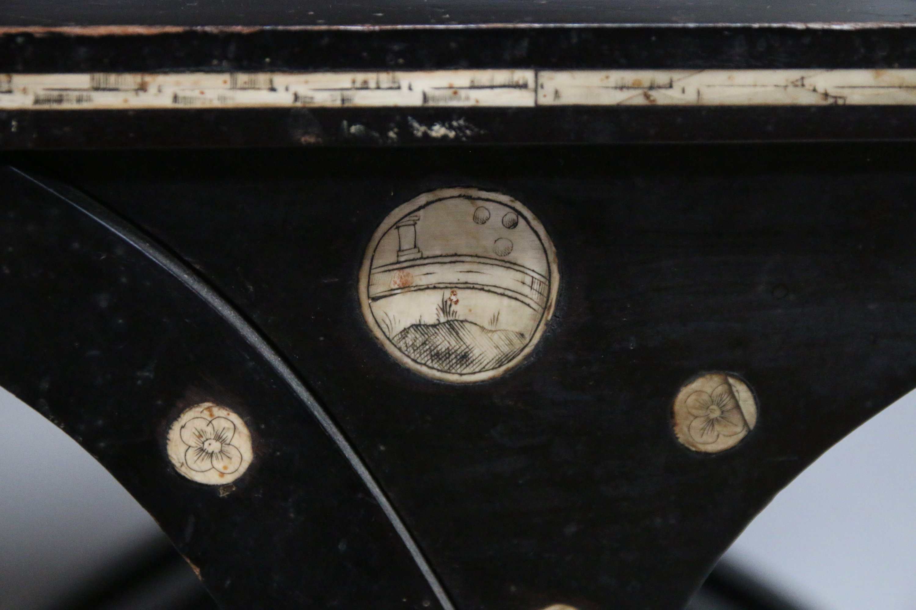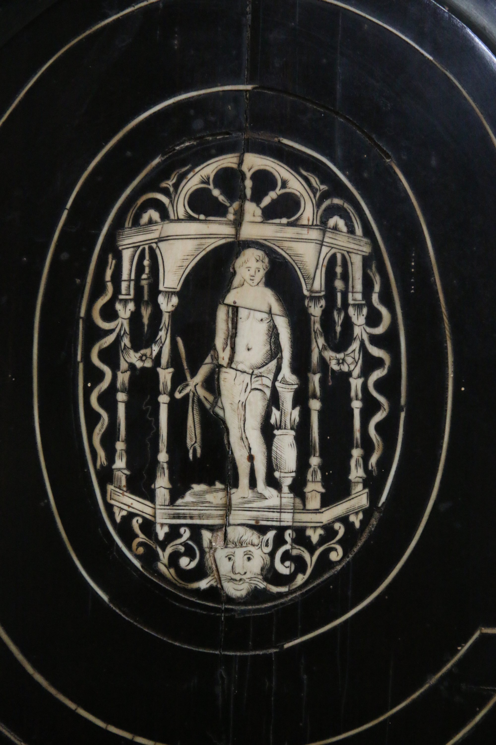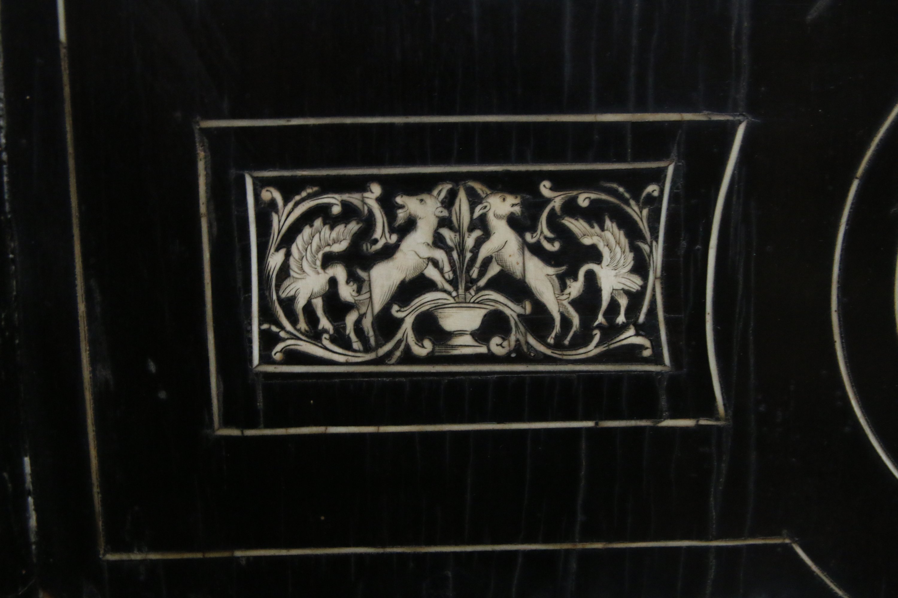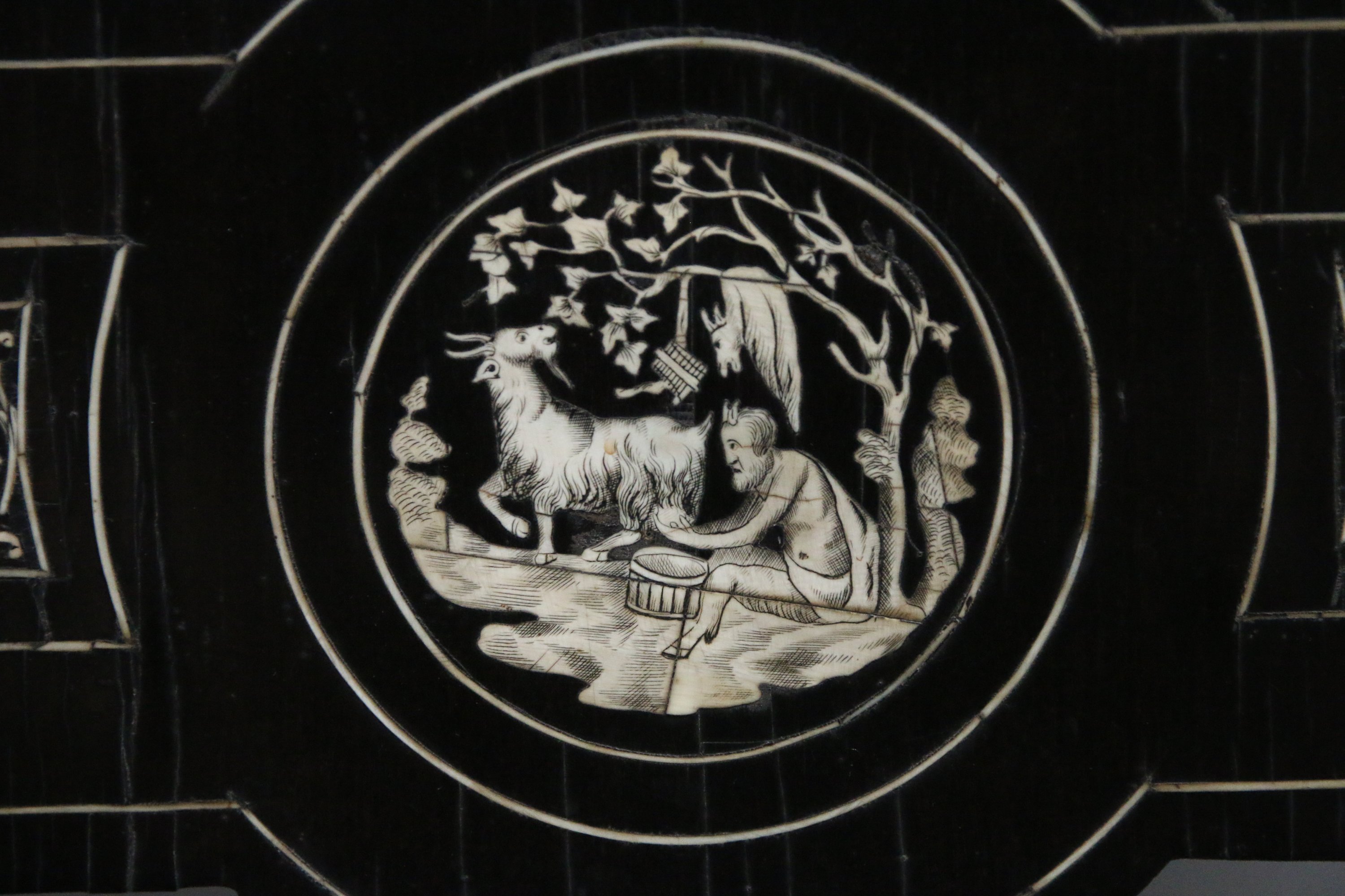 Fauteuil curule en marqueterie d'ivoire et de bois foncé, le dossier droit architecturé orné d'une scène de Bacchante au vase en partie supérieure et d'un Faune trayant un bouc en partie basse. L'ensemble est orné de décors de grotesques, rinceaux, chimères et mascarons.