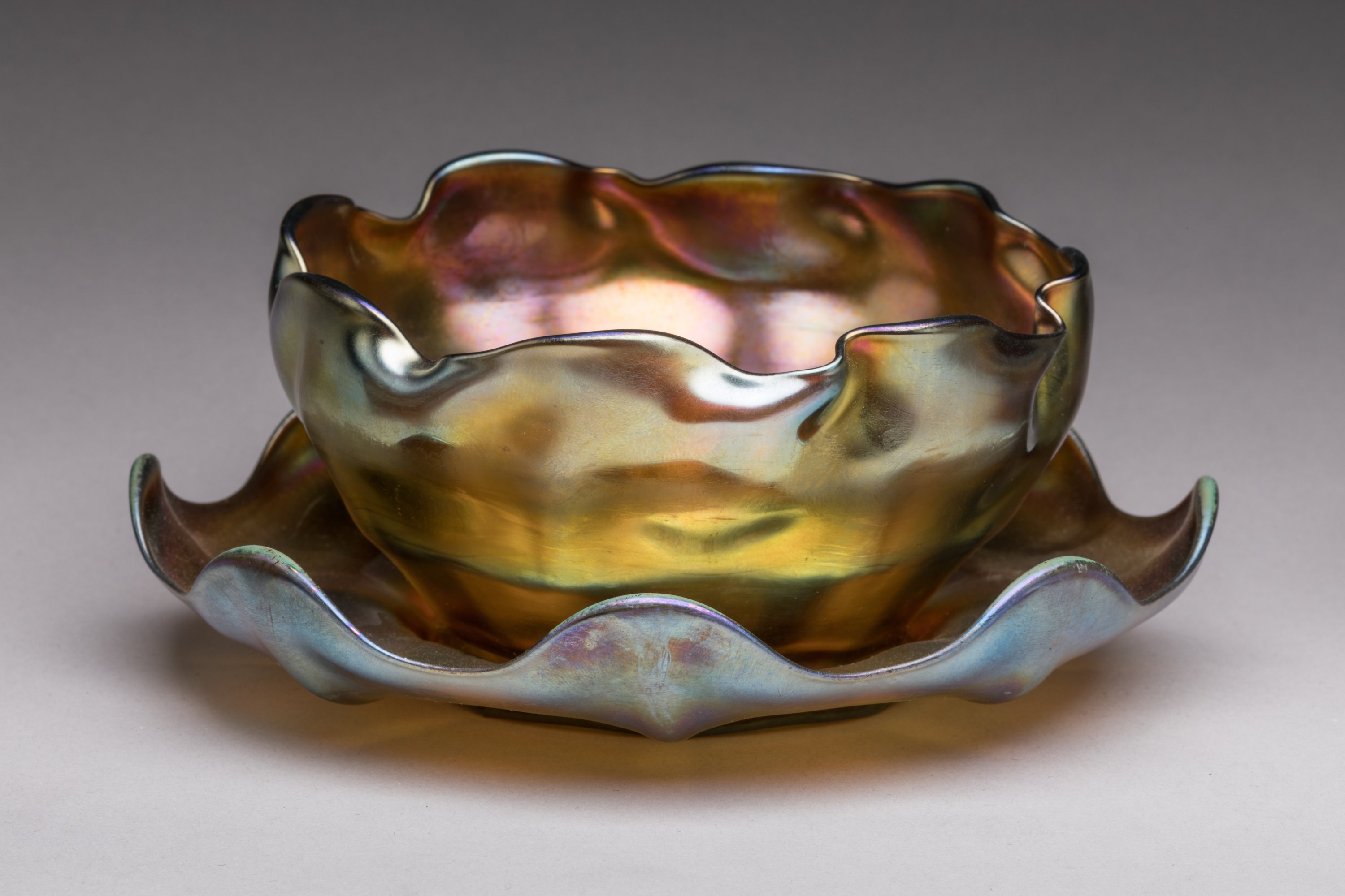 Le "Favrile Glass" est un type de verre irisé développé et breveté par Tiffany en 1894. Contrairement aux autres verres iridescent la couleur n'est pas uniquement en surface mais incorporée dans la pâte. Tiffany remporte le grand prix de l'Exposition universelle de 1900 pour cette invention.