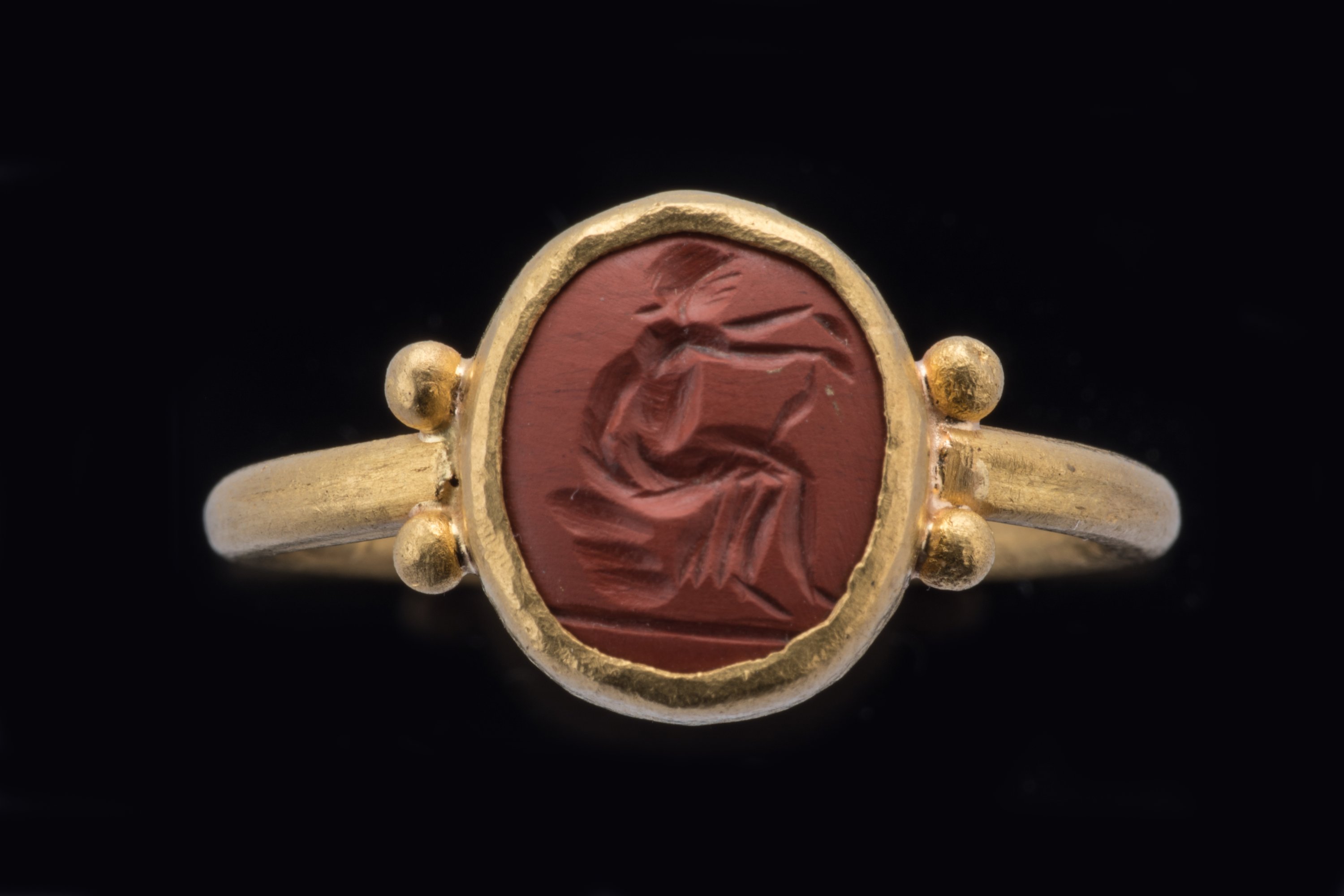 en jaspe rouge figurant une femme assise. Montée sur une bague en or. Deux globules dor ornent les épaules à lendroit où lanneau se rattache au chaton.